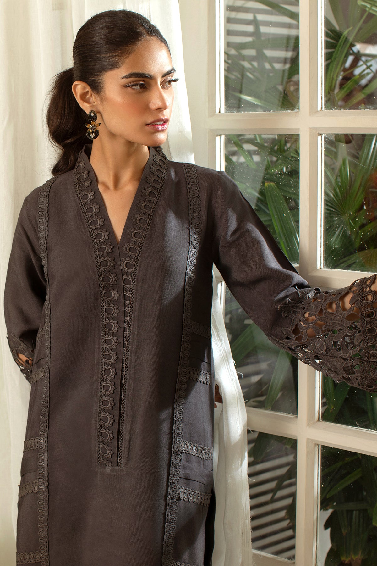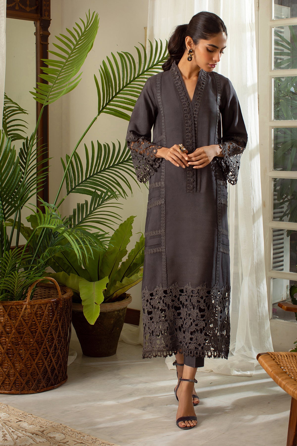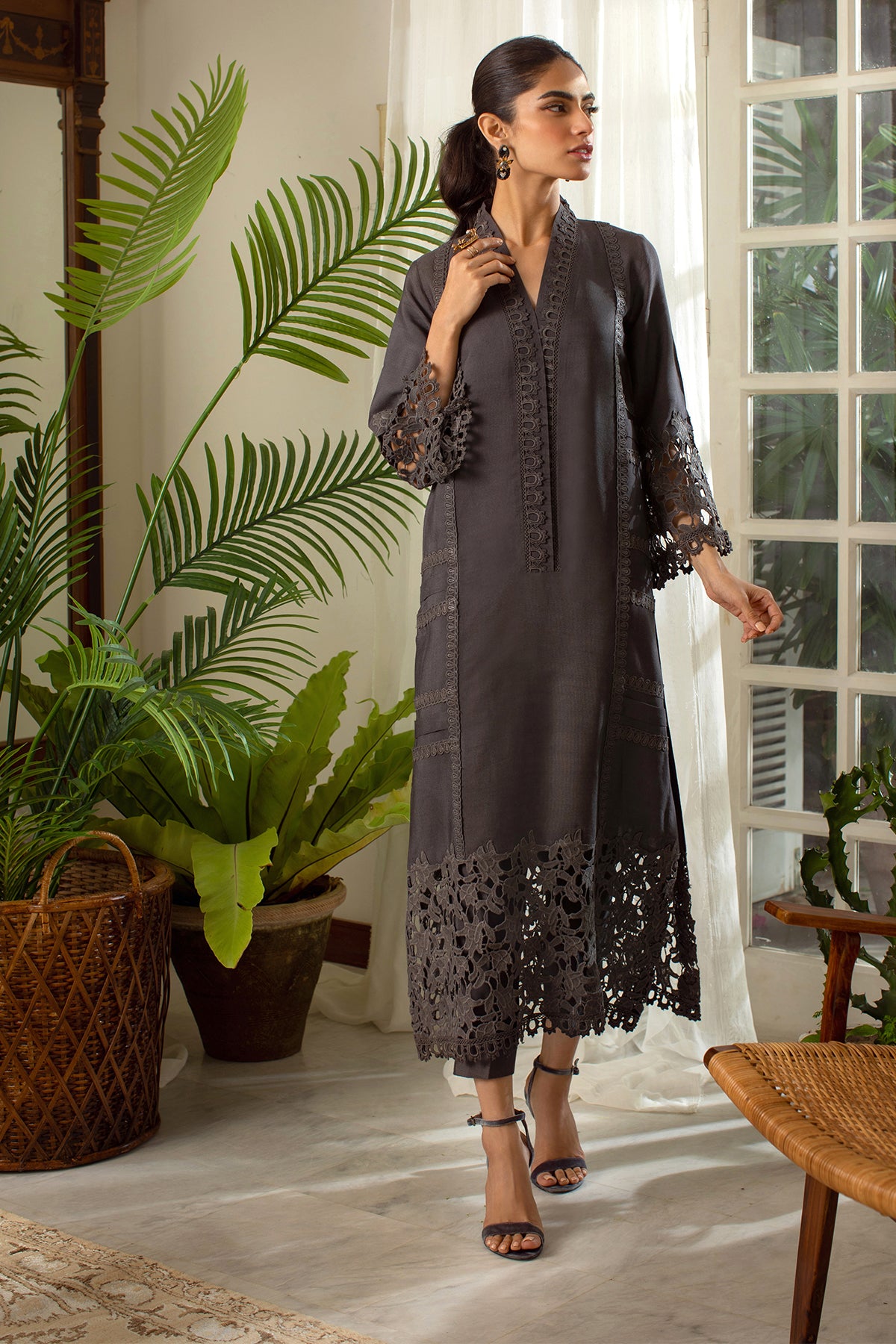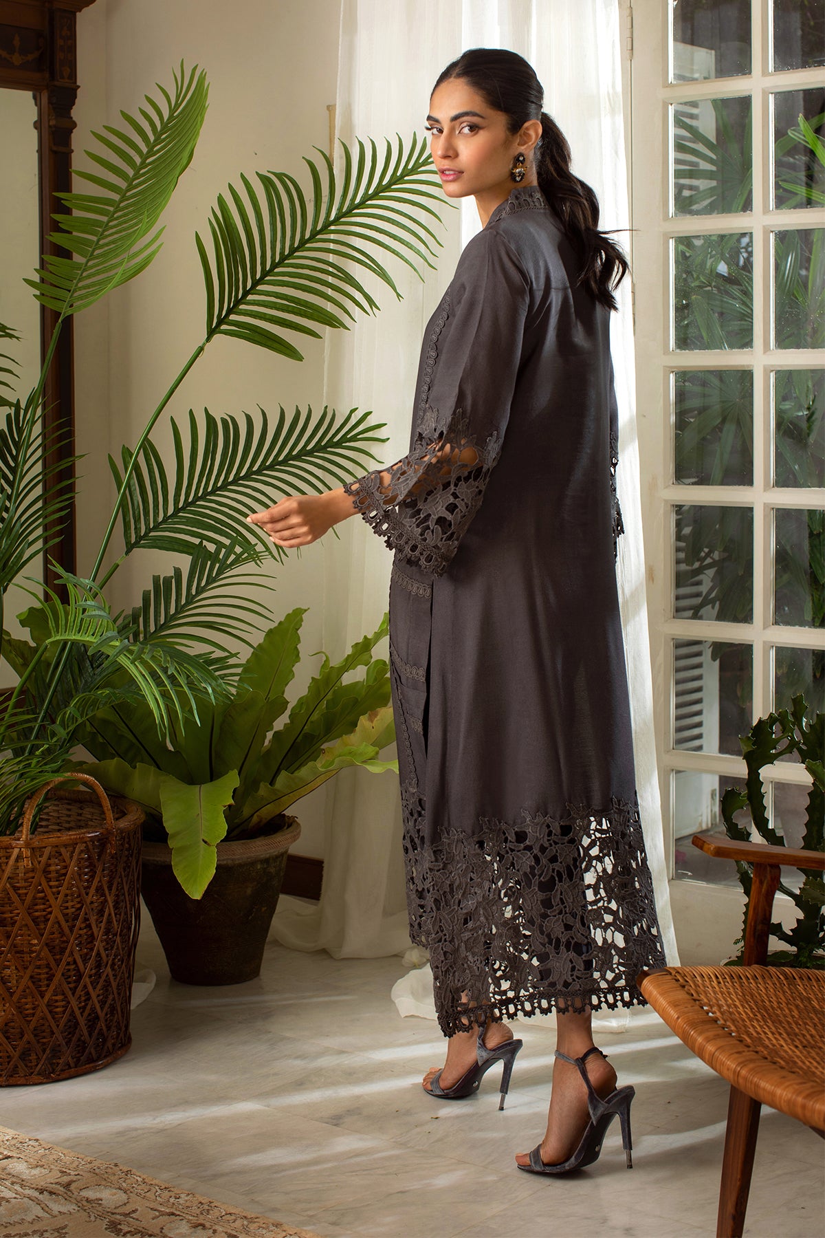 Long silhouette cotton net shirt in grey featuring lace and pleats details on side panels, the hemline is adorned with matching crochet appliqué details. The shirt can be paired with straight matching pants.