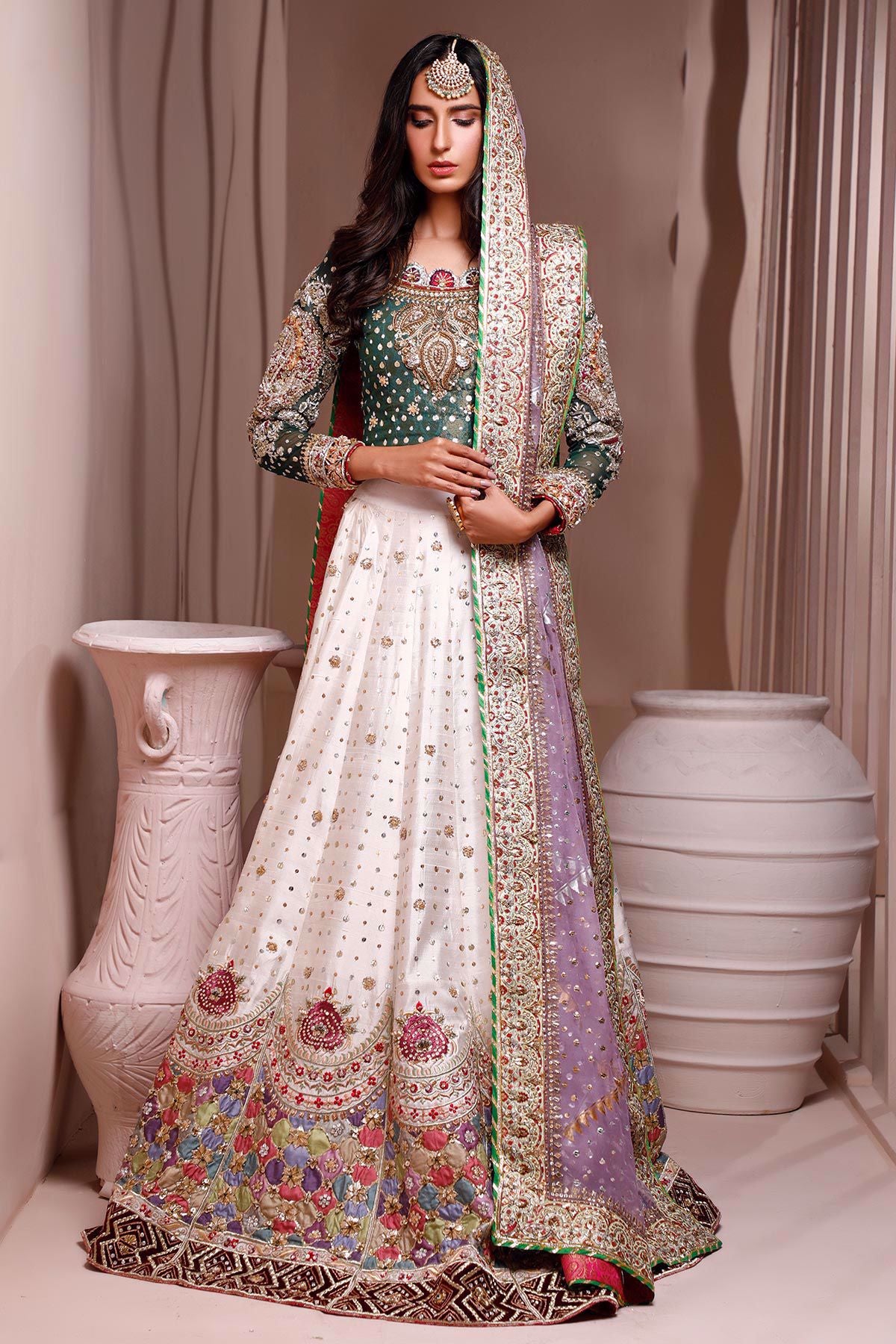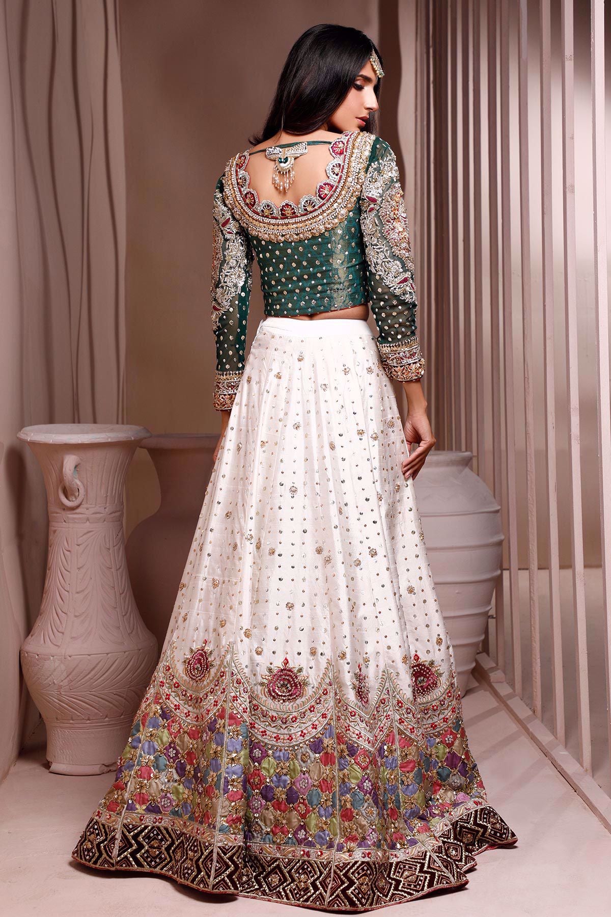 Dark green choli with old school hand embroidered techniques of silver dabka and nakshi which is enhanced with silk thread handcrafted resham rosettes in shade of peaches. The back of the choli is incorporated with Annus’s handcrafted signature tassel. The choli is paired with shimmery Lehnga in shade of corals with chatta patti technique on the hemline which is further adorned with silk rosettes, gota, dabka and handcrafted maroori details. Color blocked dupatta completes the look make this bridal even gorgeous.