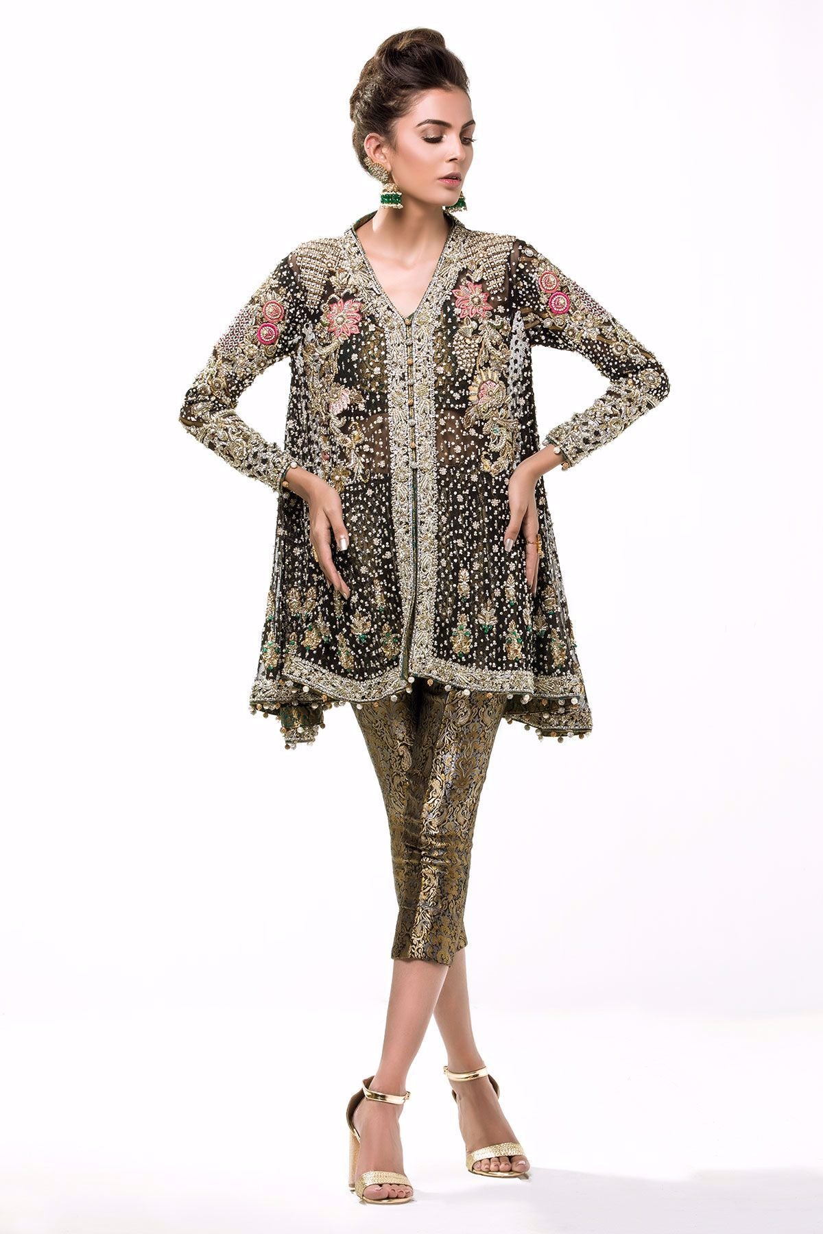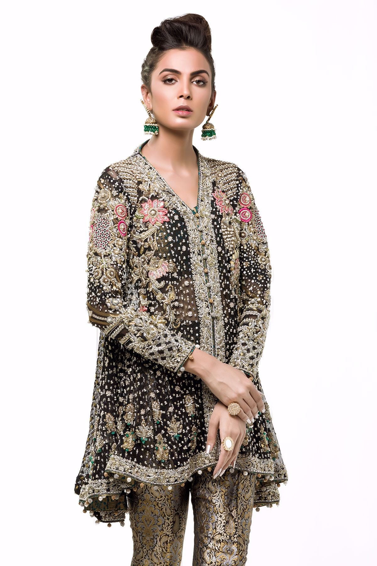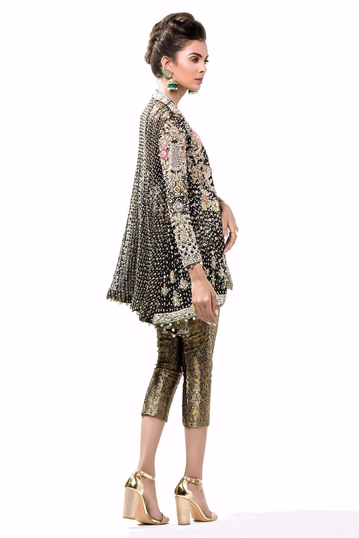 This stunning black bias-cut front open top is meticulously handcrafted with silver gold and antique dabka details which is further adorned with mukesh and real stones. Floral details with hand embroidered techniques make this outfit a head turner.