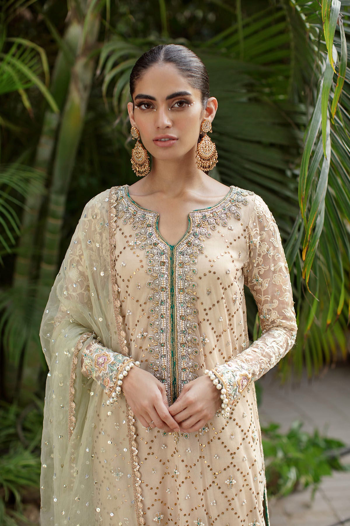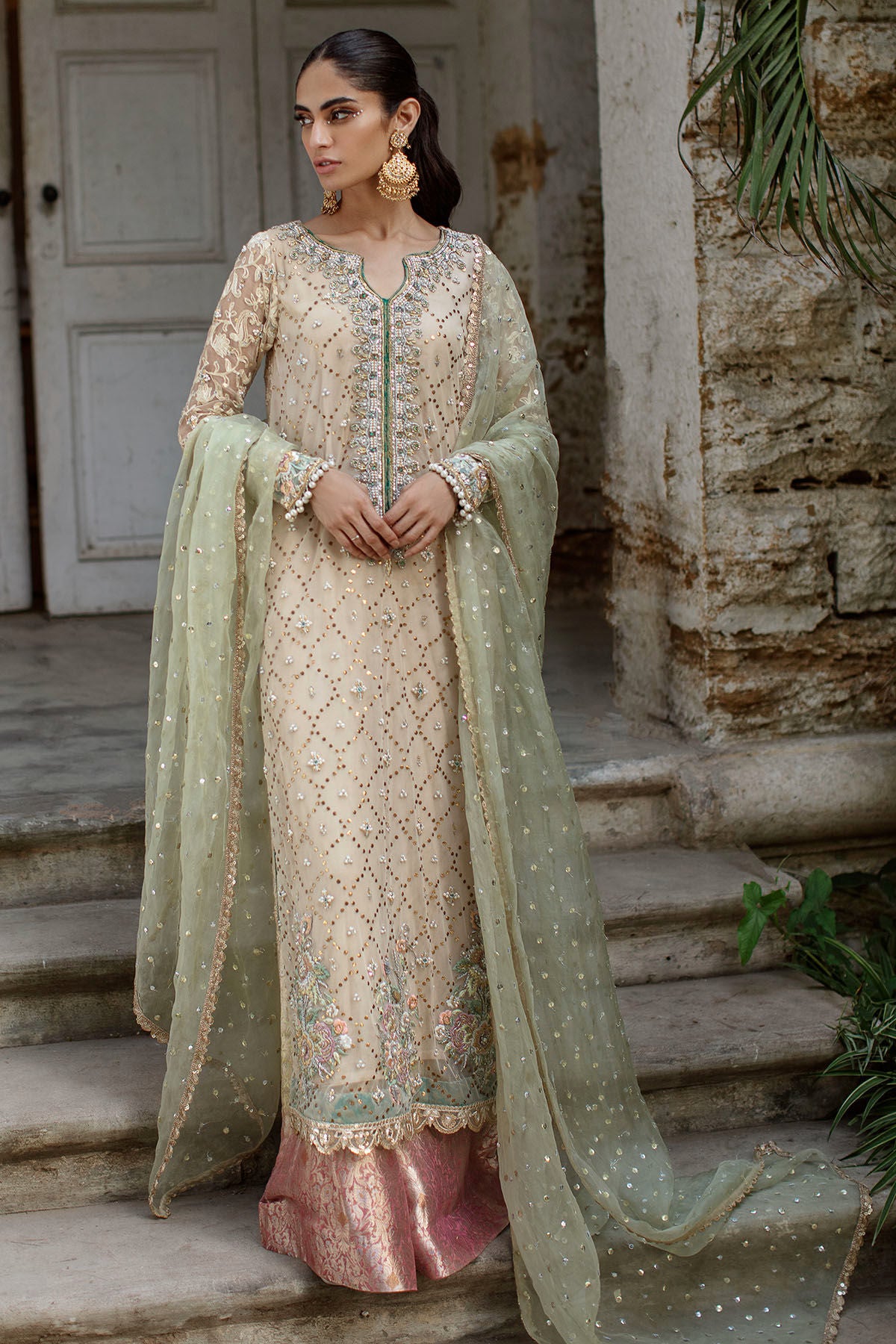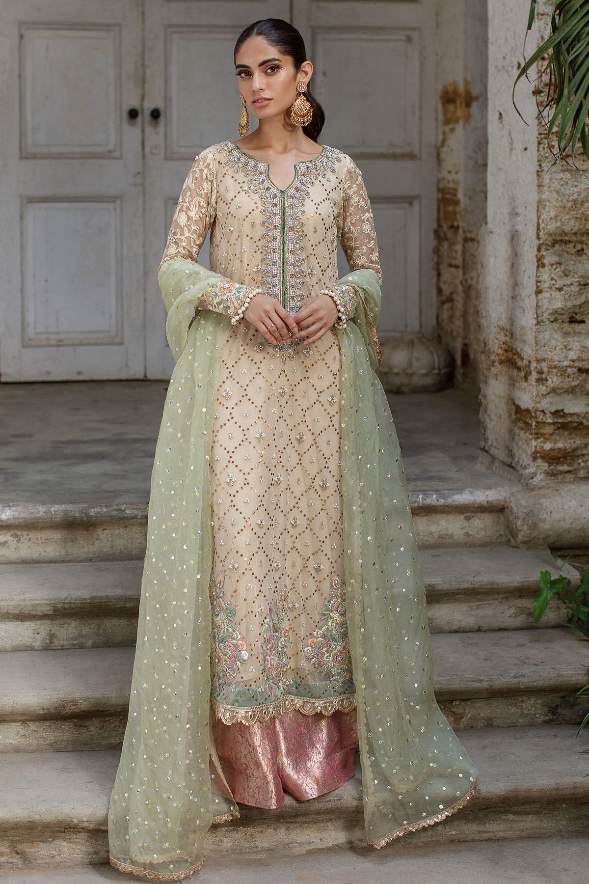 Long silhouette shirt on net canvas in subtle beige shade featuring gold kaamdani details on centre front. The neckline is adorned with heavy zardozi details featuring pearls and light catching crystals, dabka and nakshi. The outfit is paired with mint organza contrasting dupatta and ombre flared pants in pure damask.