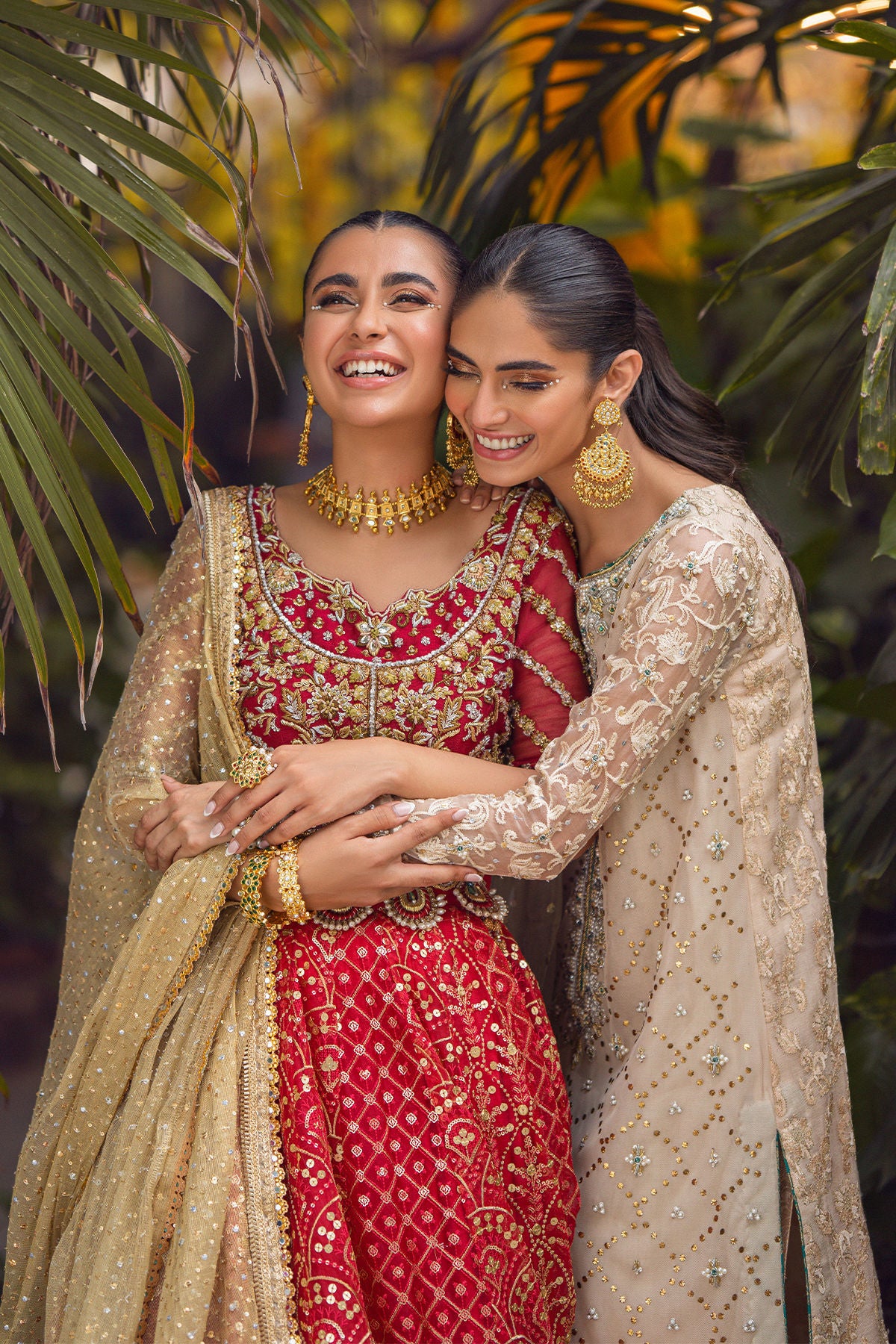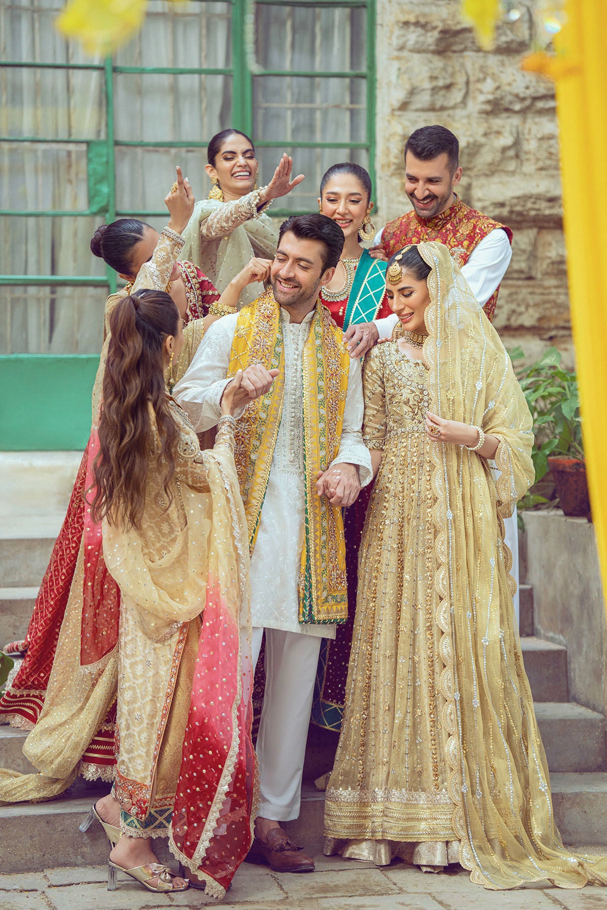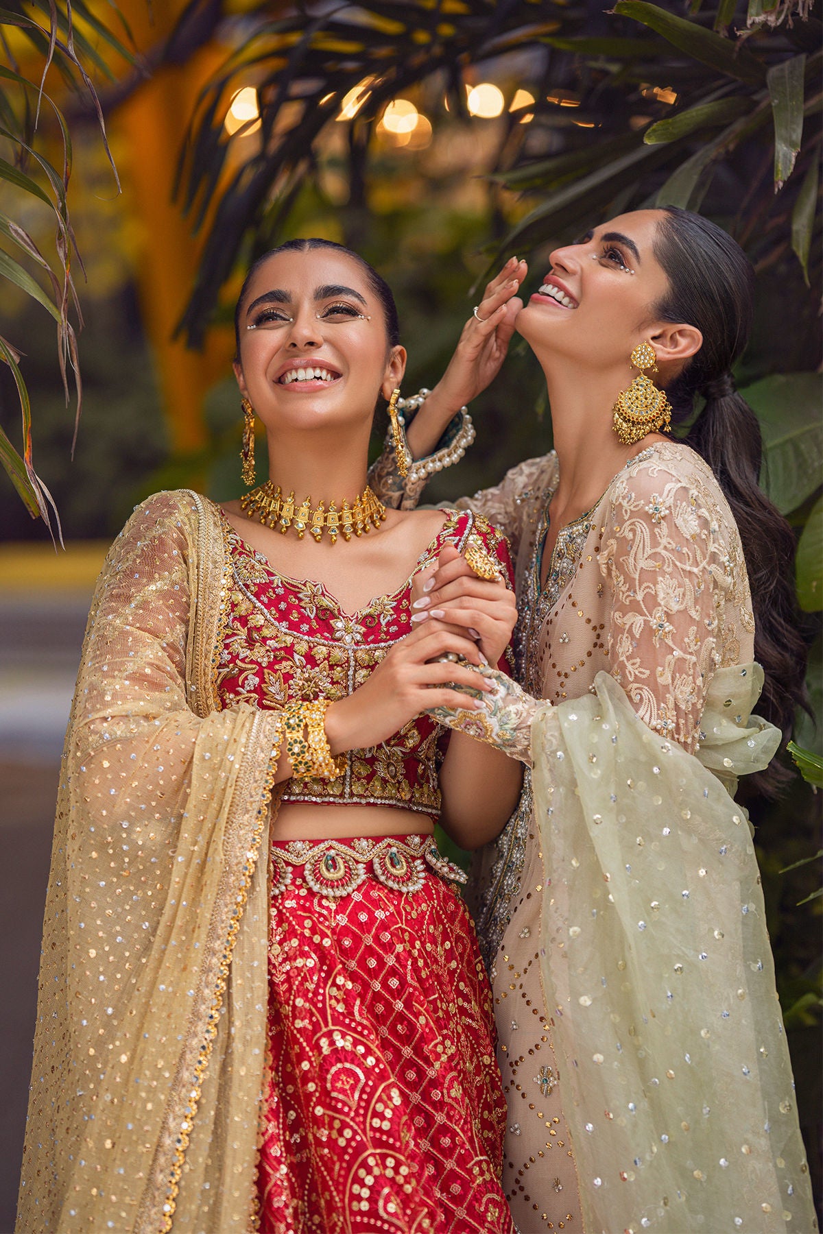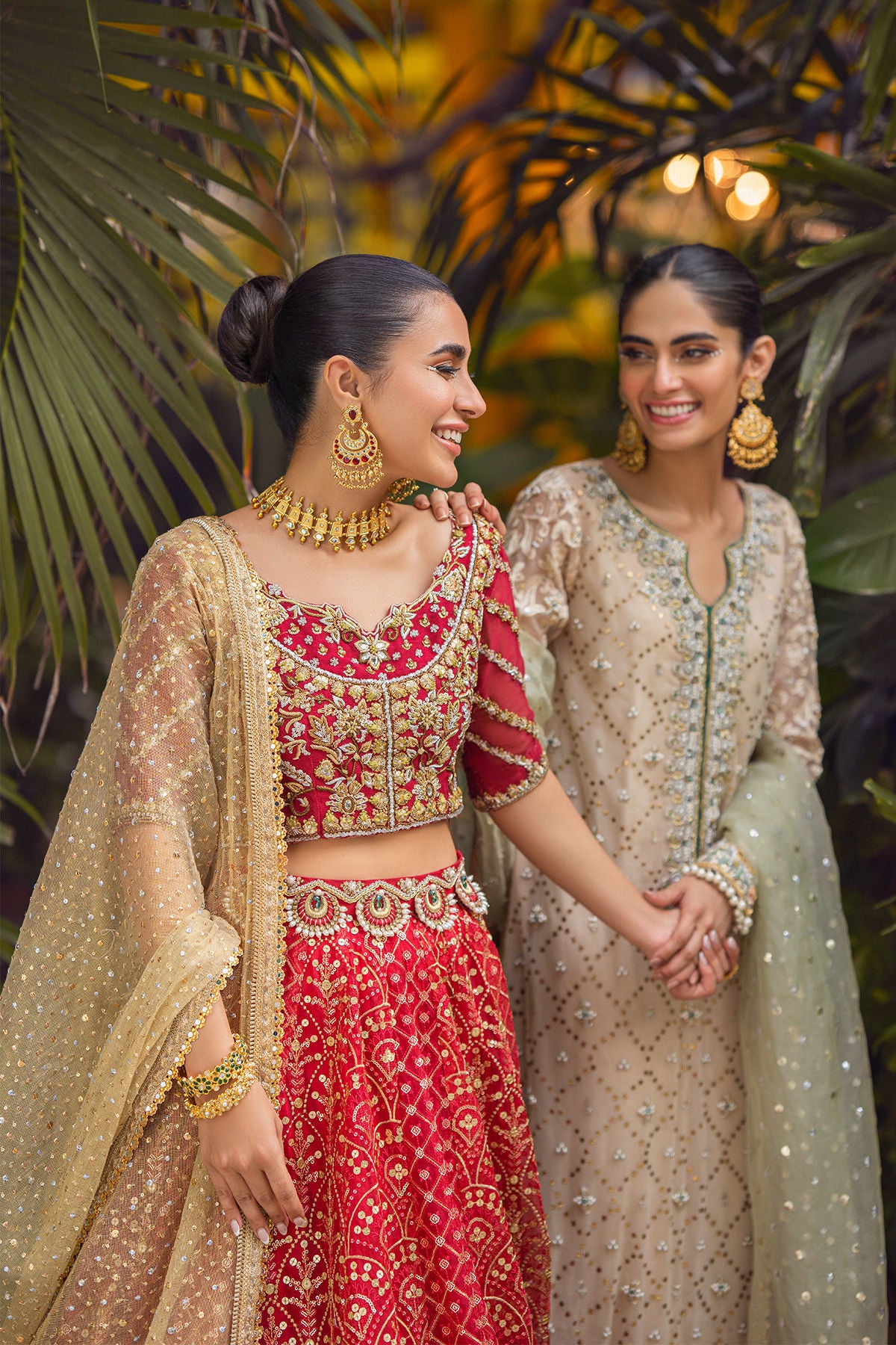 Long silhouette shirt on net canvas in subtle beige shade featuring gold kaamdani details on centre front. The neckline is adorned with heavy zardozi details featuring pearls and light catching crystals, dabka and nakshi. The outfit is paired with mint organza contrasting dupatta and ombre flared pants in pure damask.