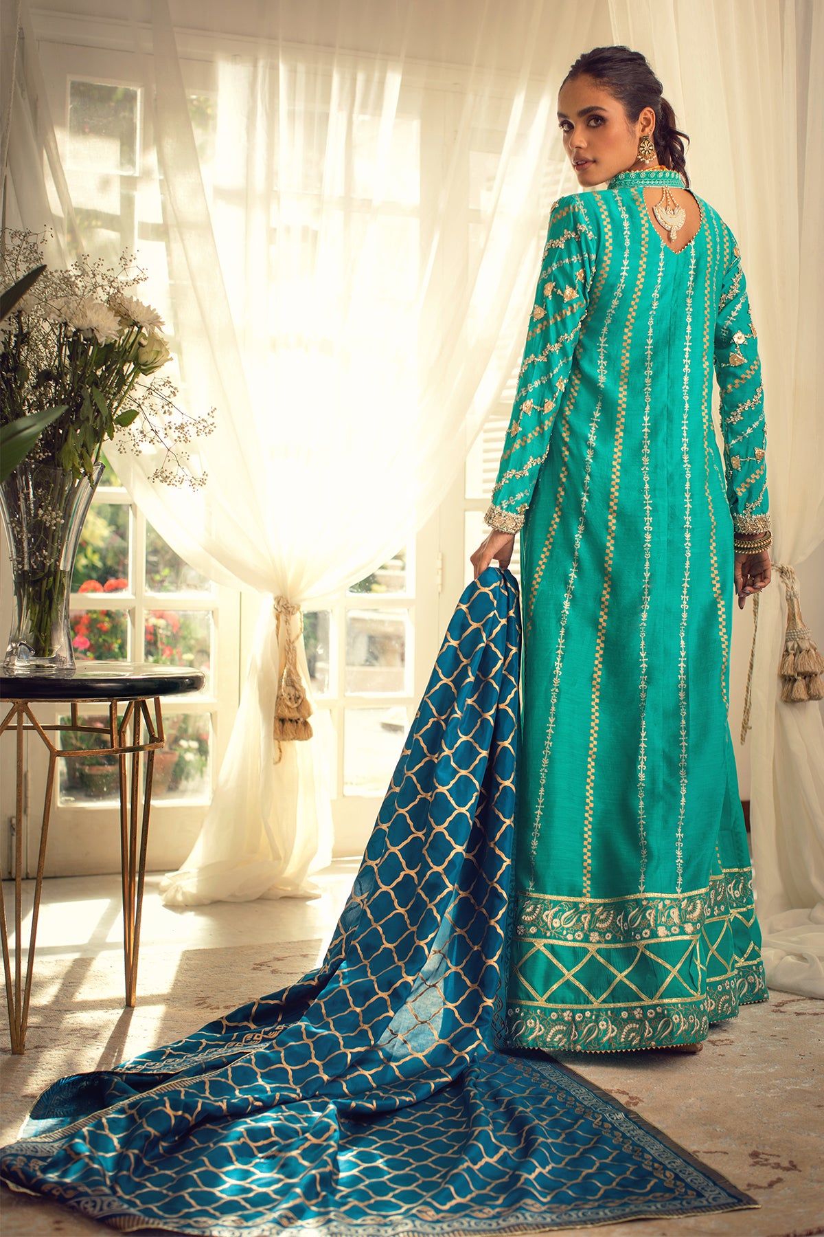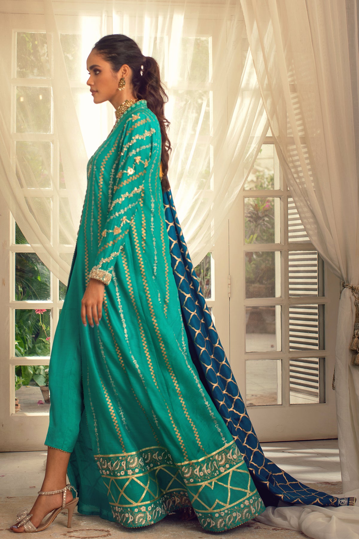 Long silhouette pishwas in striking Turquoise shade on pure khaadi silk canvas featuring hand block printed details in silver and gold. The hemline is adorned with gota details and the neckline is enhanced with dabka and sequins handcrafted motifs. The centre back of the pishwas is adorned with handcrafted tassels. The pishwas is paired with contrasting deep ocean blue pure silk dupatta featuring hand block printed details. The outfit is paired with straight raw silk pants.