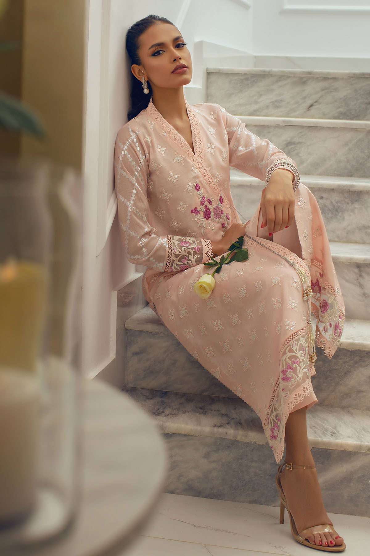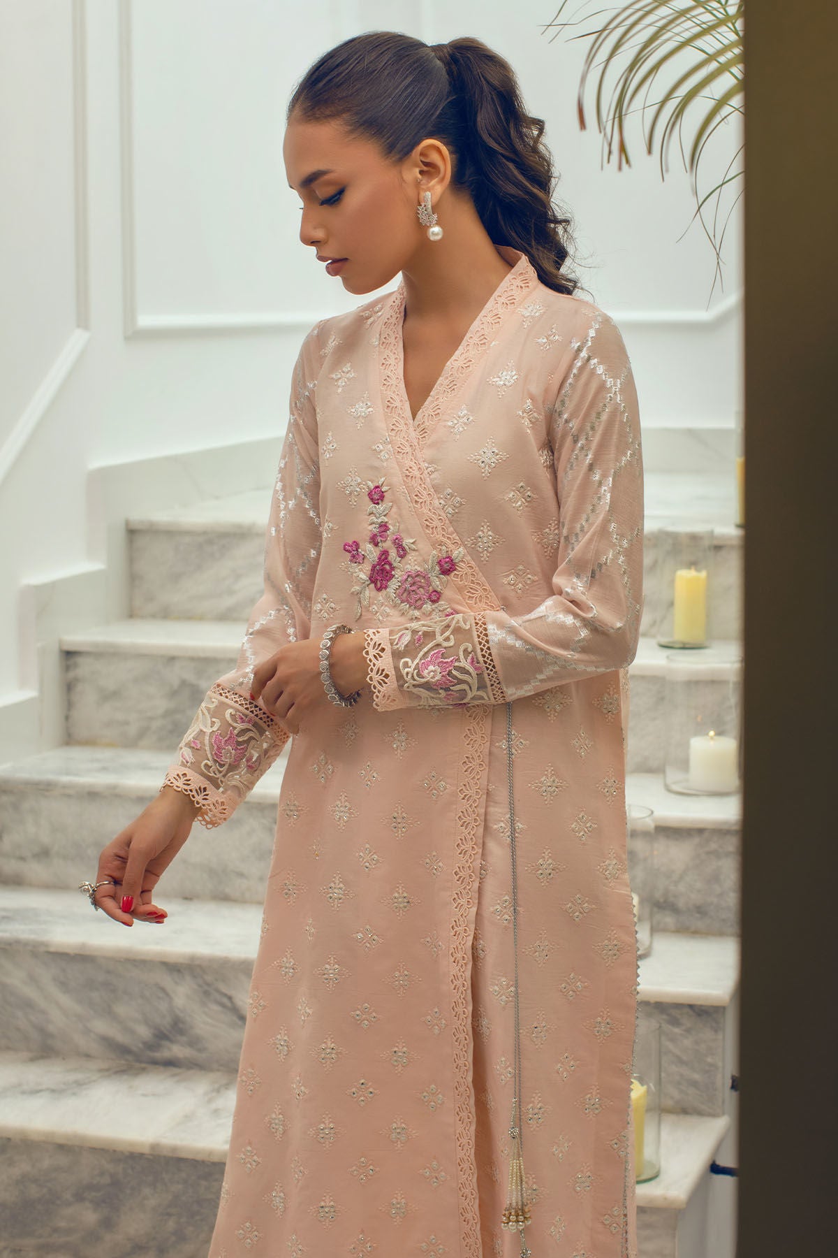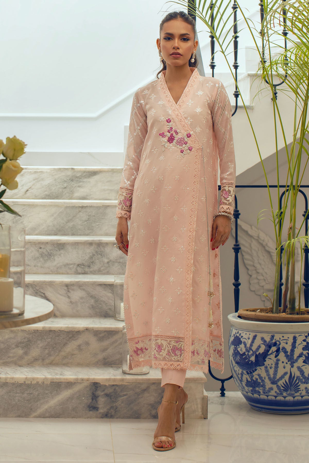 Long silhouette angharka in gorgeous shade of powder pink featuring silver lorex and resham boti’s on centre front and back. The centre front is adorned with silk thread embroidered rosettes and handcrafted tassels. The hemline is enhanced with multicolored embroidered panel in subtle pastel shades. The Angharka can be paired with raw silk matching pants.