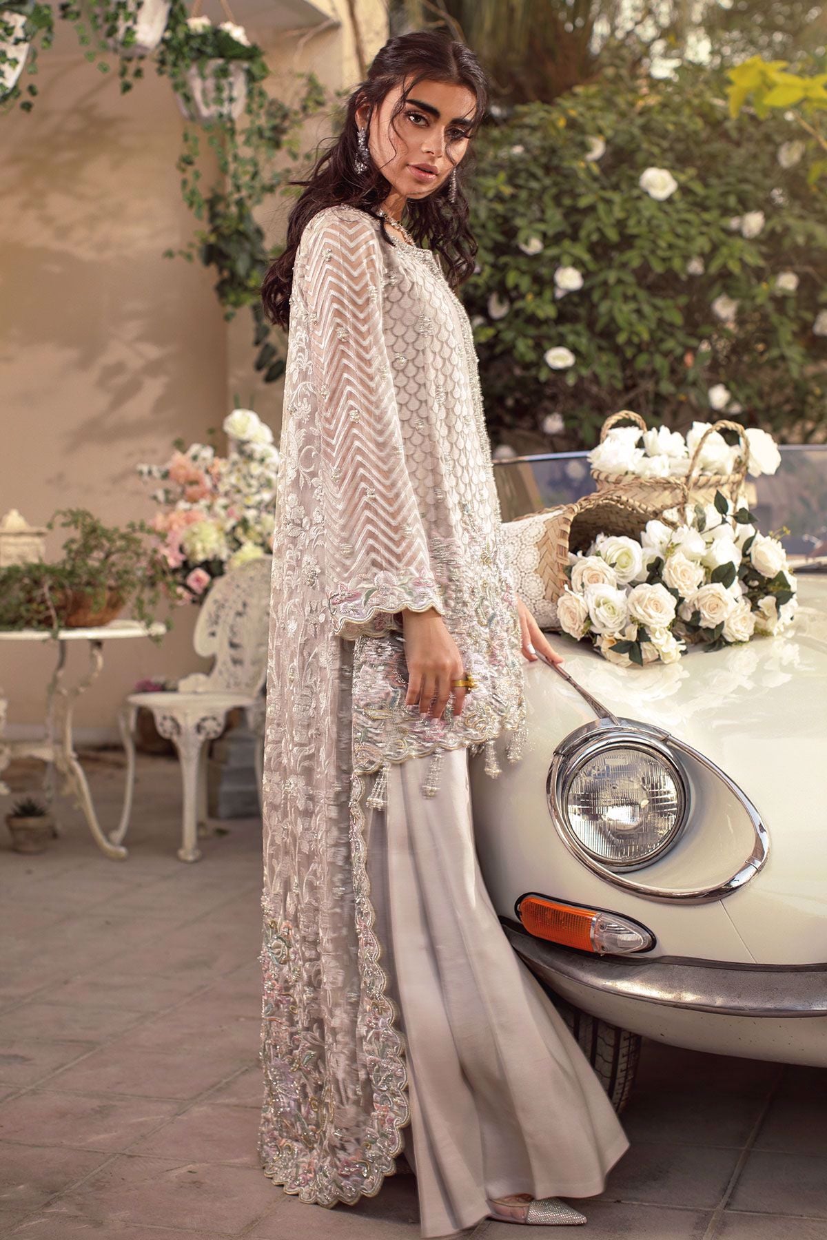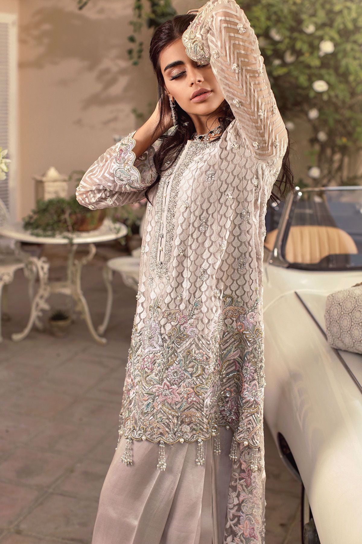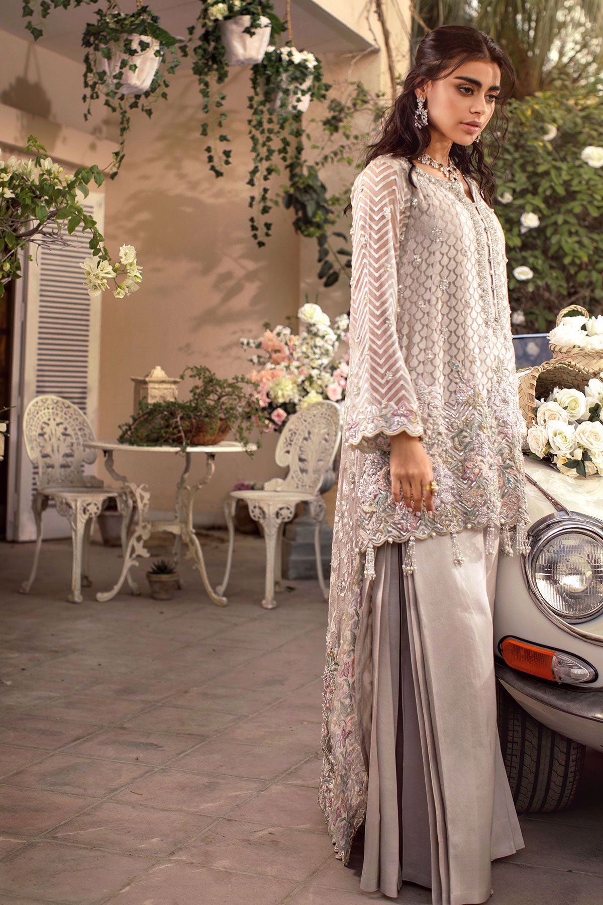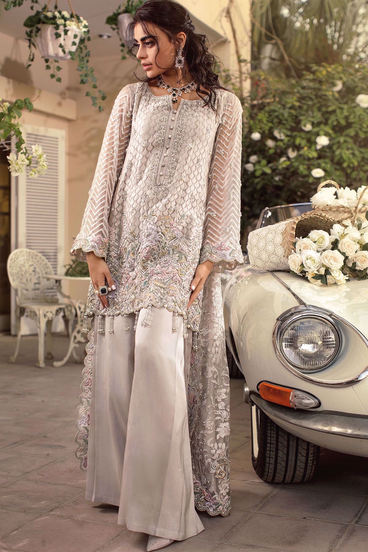 Silver grey head turning high low with subtle details of flora on the hemline which are adorned with all silver hand embroidery. The hemline of the front is adorned with handcrafted tassels. The back of the shirt has stunning embroidery details along with light catching crystals and pearls. This ensemble is paired with raw silk flared pleated pants.