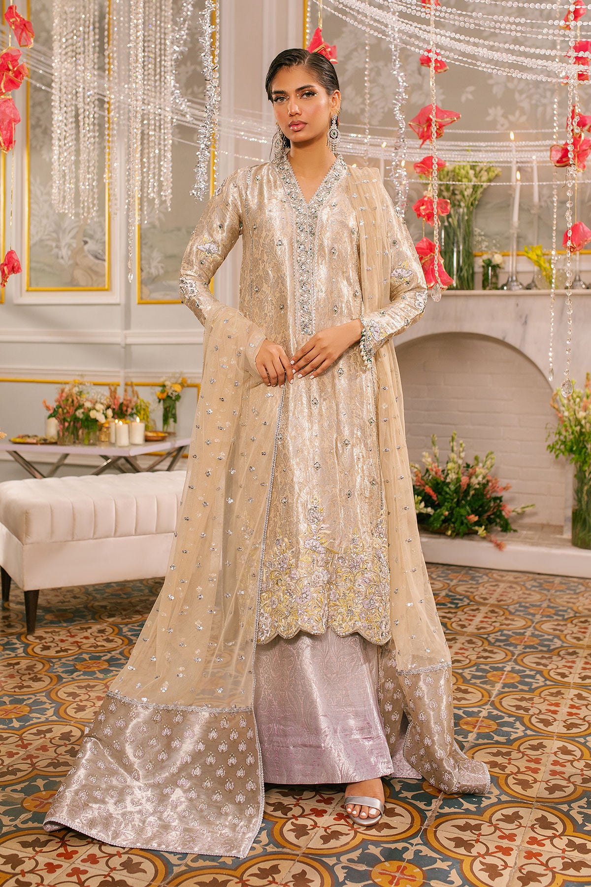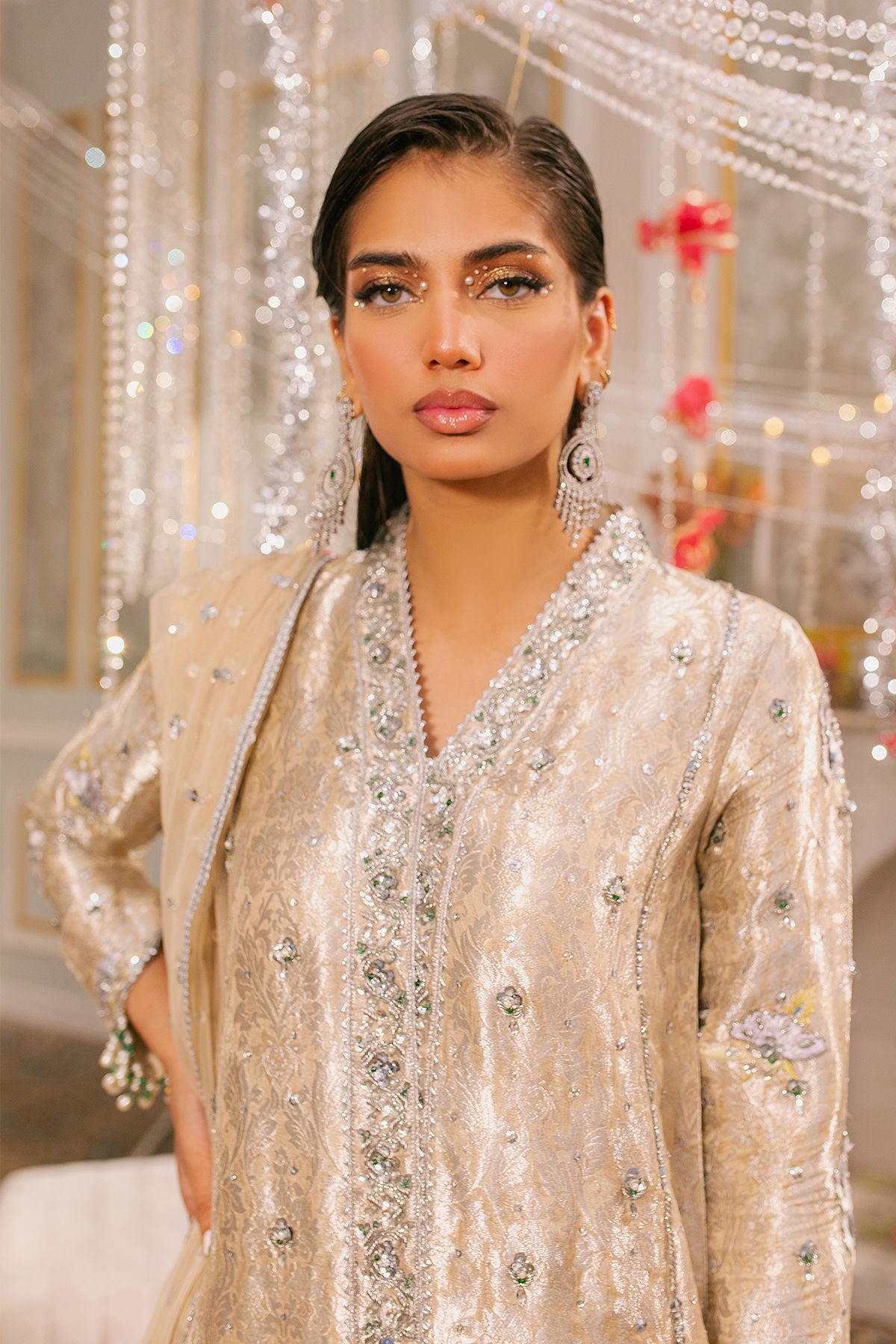Experience the breathtaking beauty of delicate silk thread rosettes on glistening metallic damask canvas adorned with radiant light-catching crystals and intricate zardozi work.