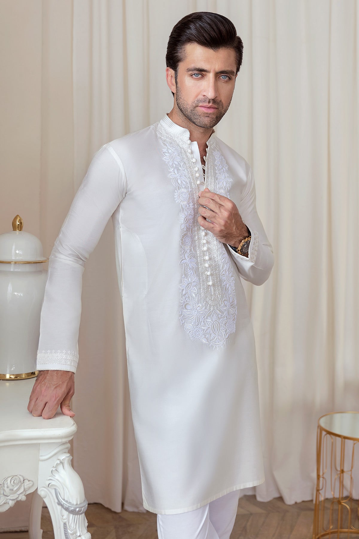 Short length pure cotton kurta with subtle self-embroidered details of resham and anchor on neckline and front, back and sleeves. The neckline of the kurta is enhanced with loop buttons. The kurta is paired with cotton trousers.