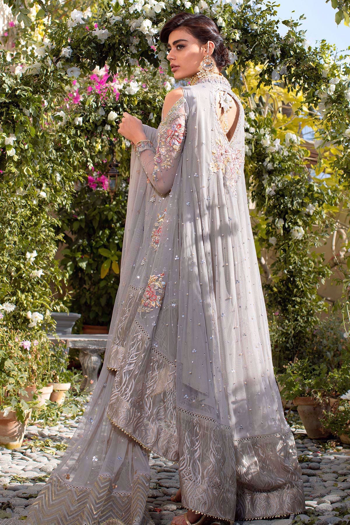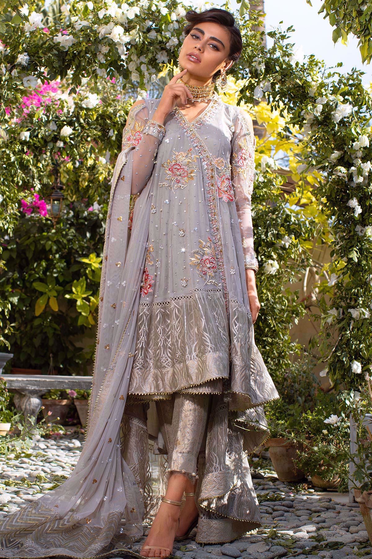 Stunning high low flared silhouette angharka with silk thread rosettes adorned with pearls and opaque sequins incorporated with embroidered hem. The back of the angharka has stunning handcrafted tassel with pearls dangling. The anghrka comes with damask pants with fringe and pearls detail on hem. Net dupatta with organza borders incorporated with pearls and sequins complete the look.