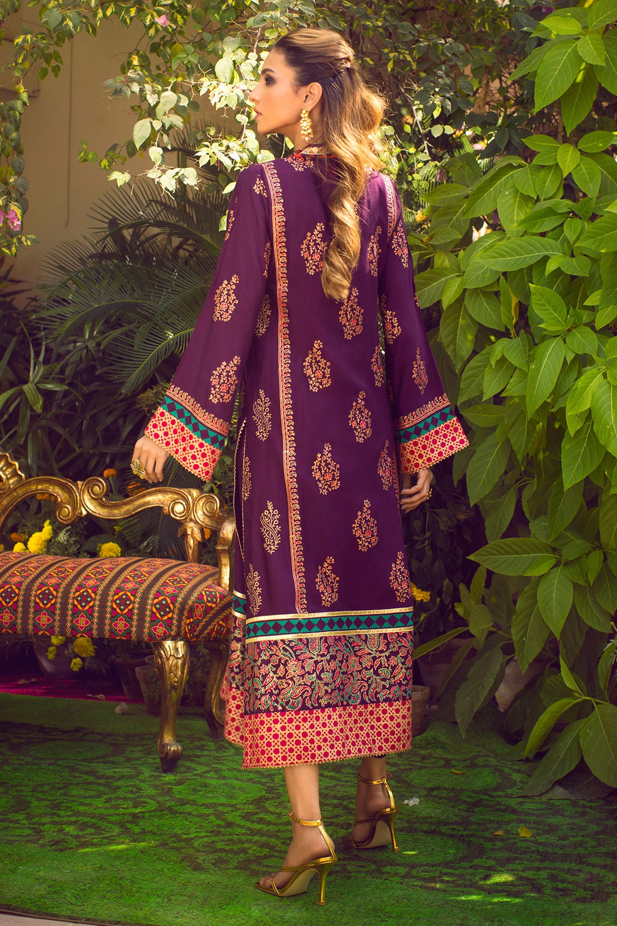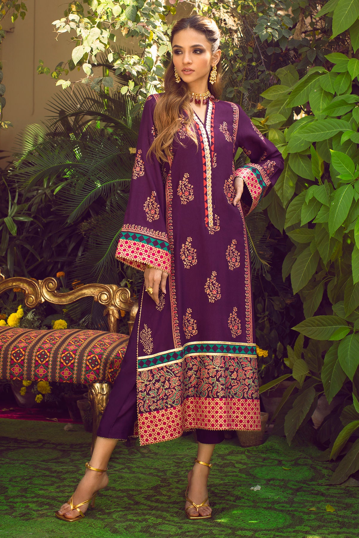 Long silhouette shirt in deep aubergine featuring gold, silver and multicolored hand block printed details. The neckline is enhanced with gota lace. The shirt comes with straight pants featuring gota on the hem.