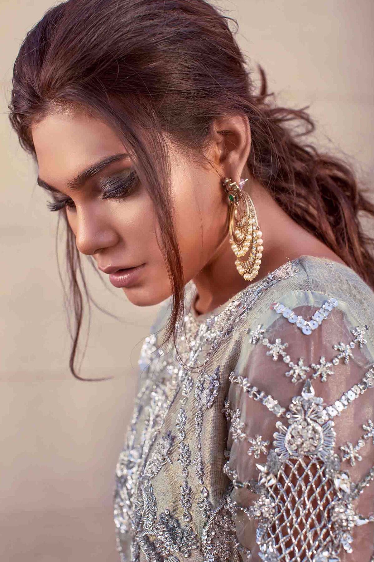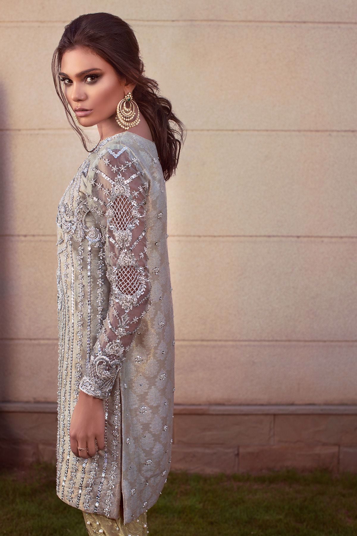 Zari cotton net straight shirt with self-pattern details enhanced with all silver hand embroidered details of dabka, sequins and light catching crystals, the organza sleeves are enhanced with cutwork details. The sage green pants with hand embroidered details of dabka, naqshi and pearls completes the look.