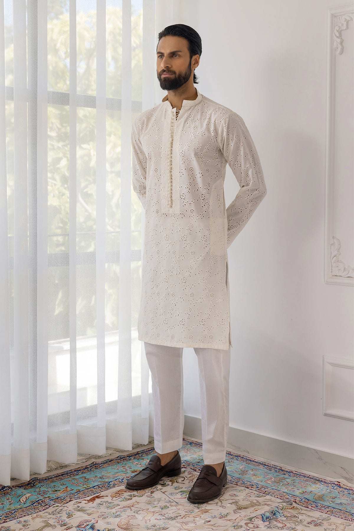 Cotton net kurta featuring schiffli details on front and back. The neckline is adorned with loop details and the kurta can be paired with straight cotton pants to complete the look.