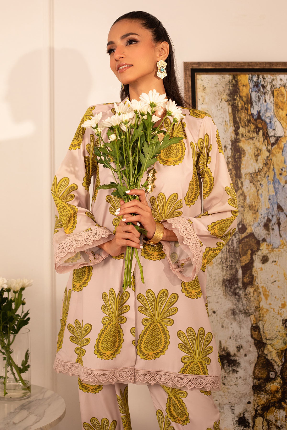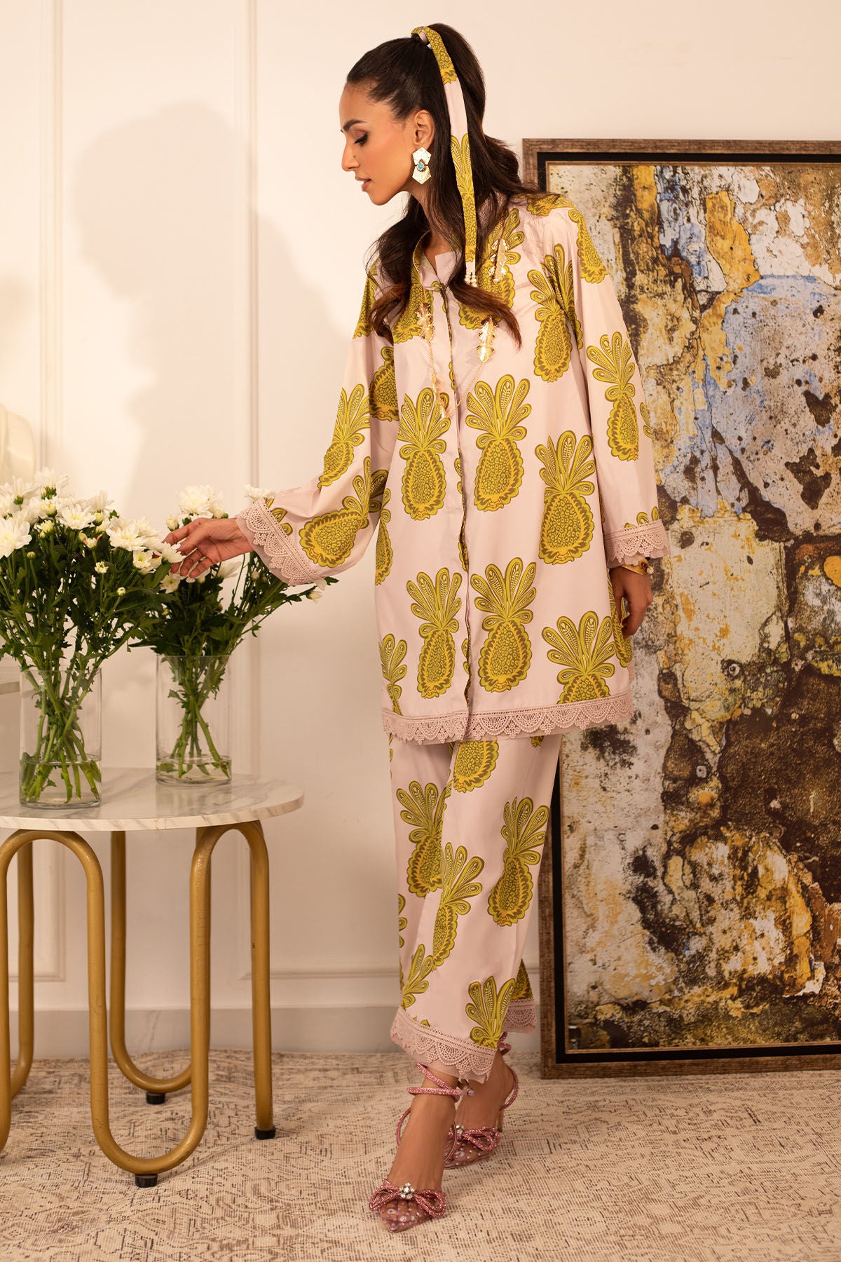 Quirky, trendy yet elegant co-ord set on crepe silk featuring balanced and carefully crafted prints, enhanced with lace details, is a must-have in your closet this summer.