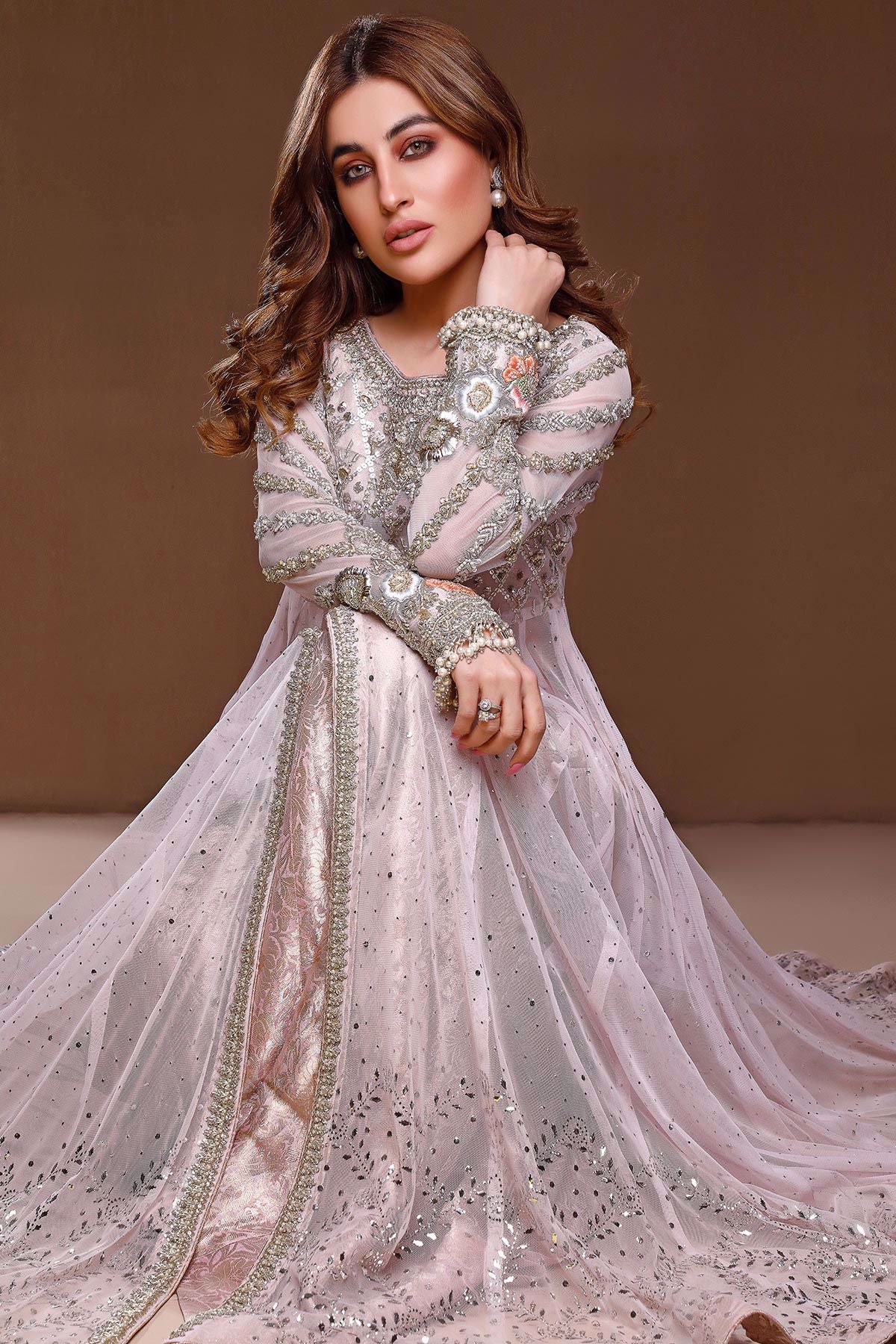 Long silhouette pishwas on pink net canvas with gorgeous zardozi details on the bodice. The pishwas has gorgeous kaamdani details overall in shades of silver. The sleeves are intricately hand embroidered with silk thread rosettes details which are enhanced with kora, dabka and light catching crystals. Color blocked dupatta in shades of mint, baby blue and powder peach makes this outfit head turning.