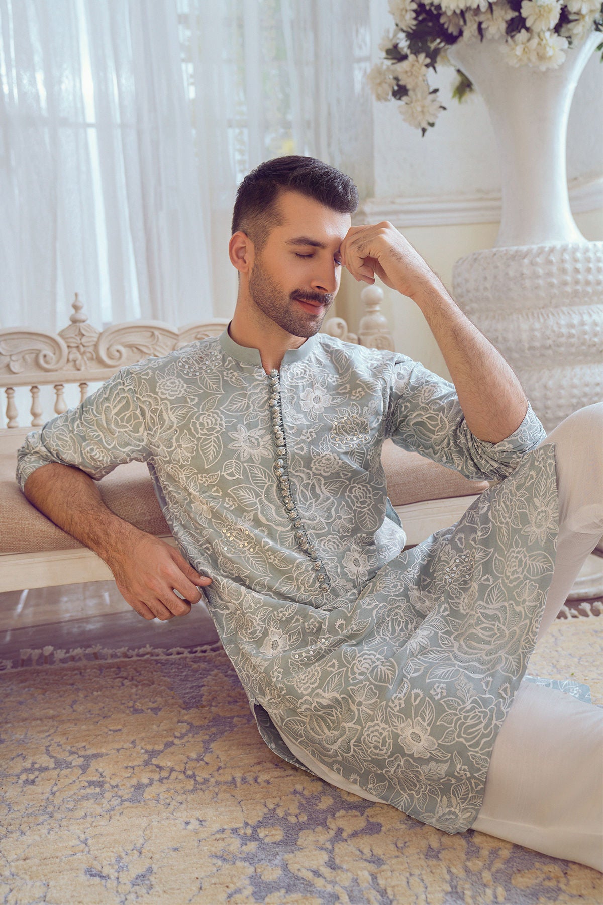 Pure raw silk kurta in gorgeous ice blue shade featuring floral embroidered details all over. The embroidered details are further adorned with scattered silver kaamdani on centre front. The handmade buttons are meticulously handcrafted with silver zardozi. The kurta can be paired with straight white pants