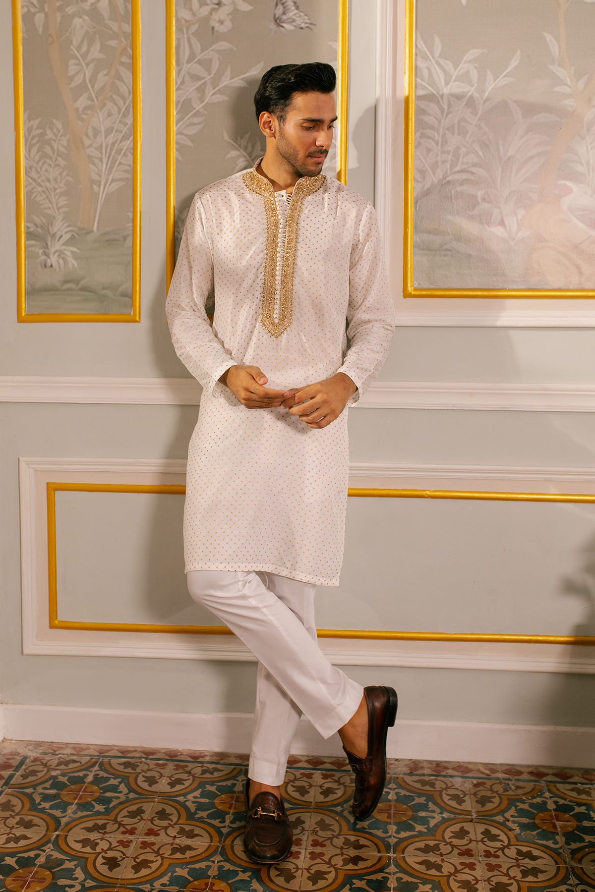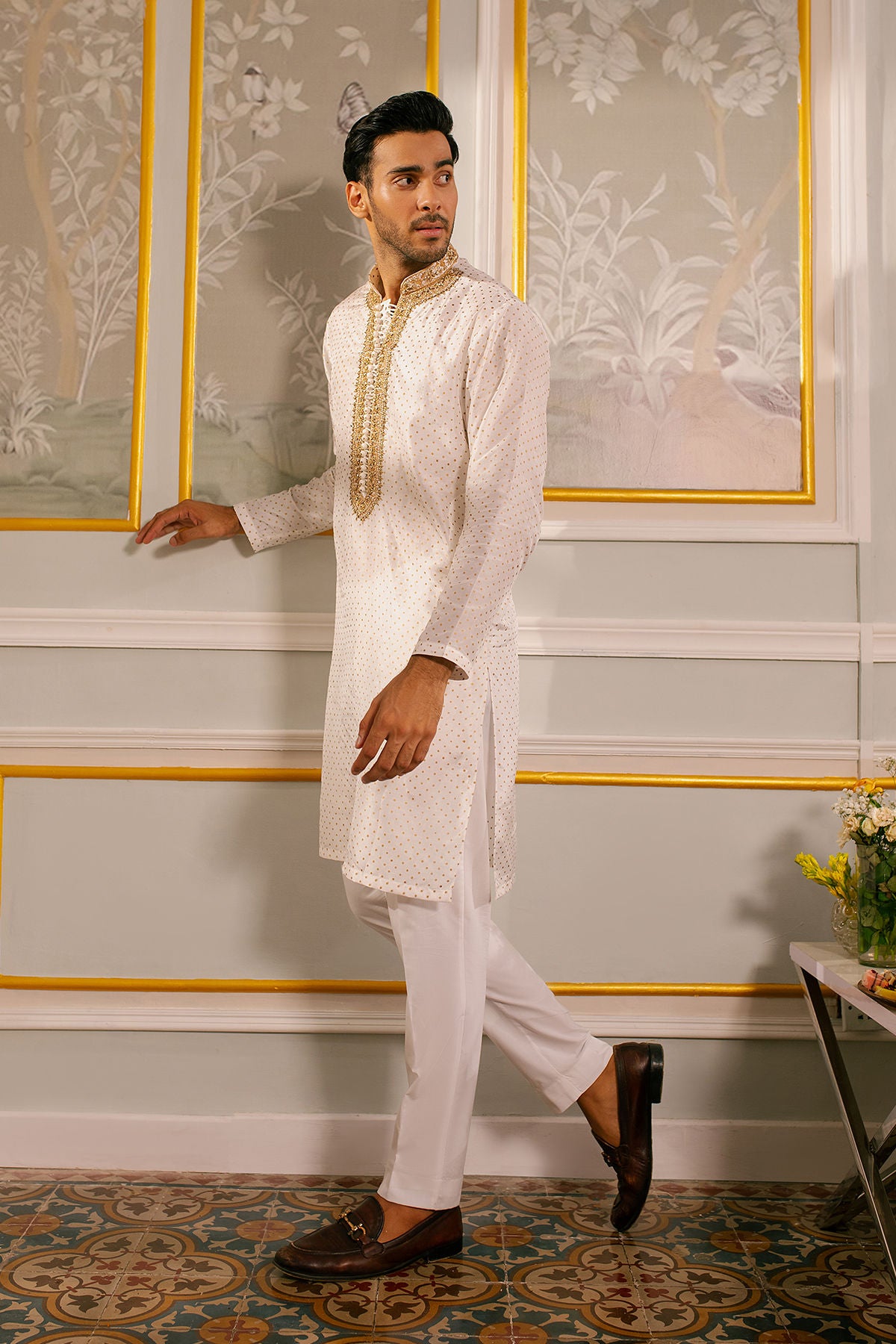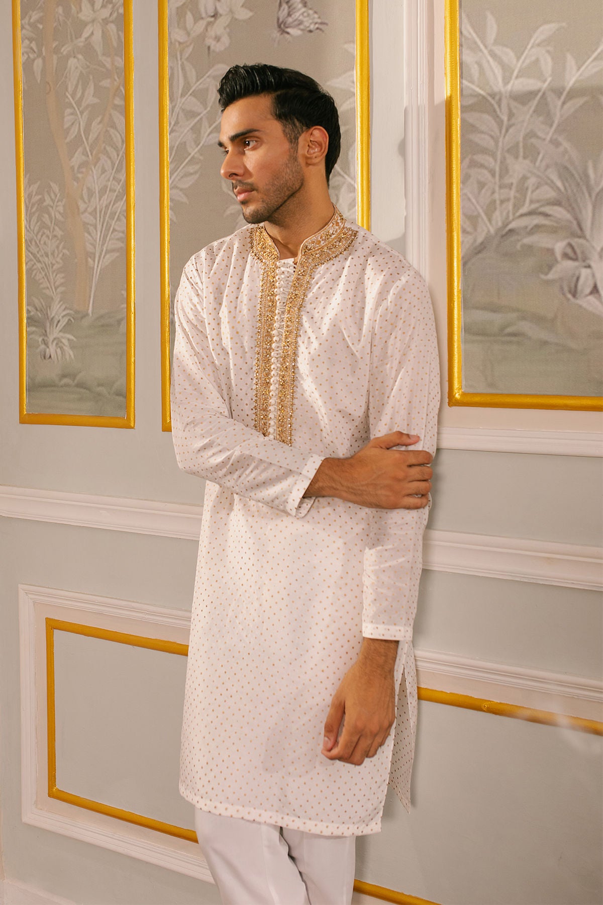 Subtle details of marori and zardozi in antique on hand block printed pristine ivory raw silk canvas.