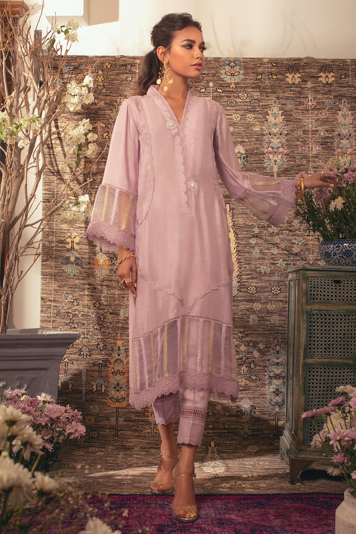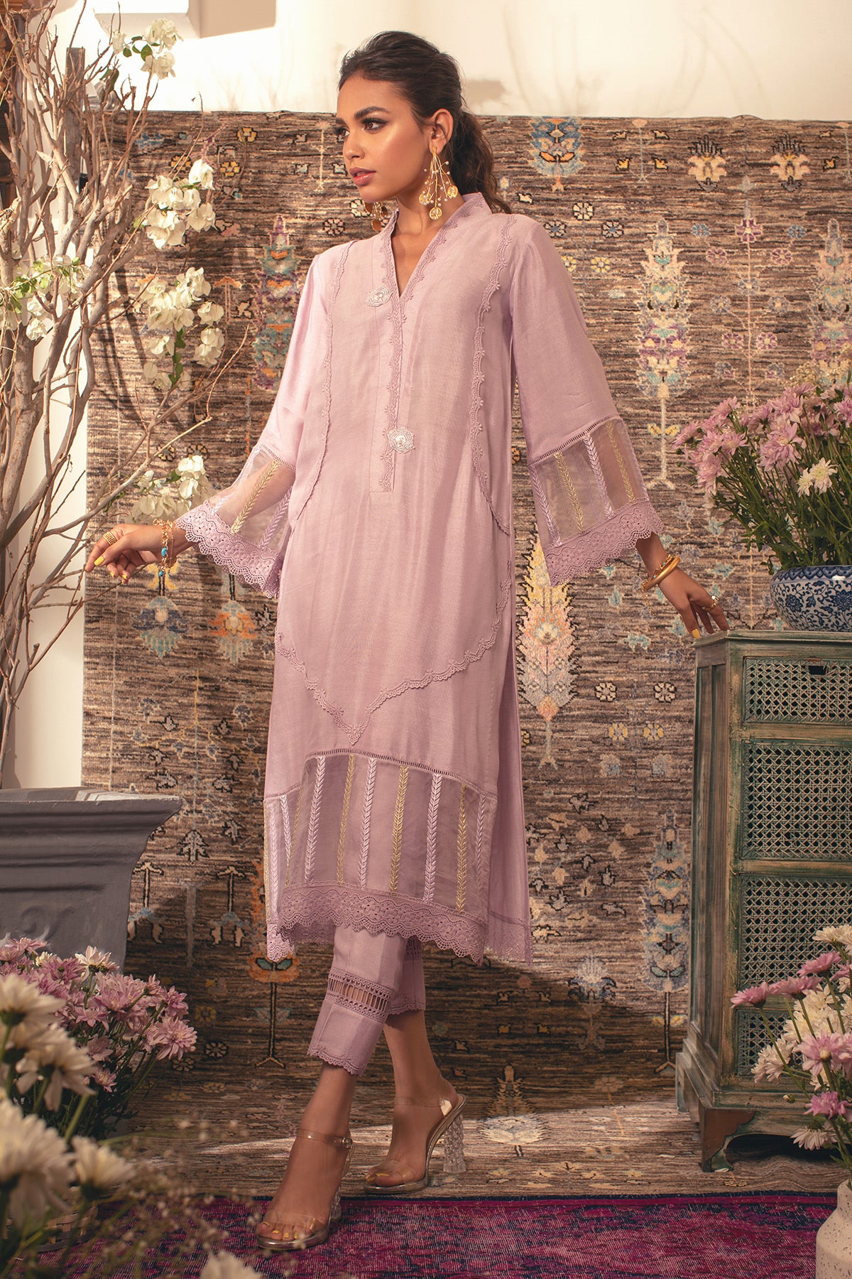 Straight shirt in cool shade of lilac featuring self-crochet lace detailing on center front. The neckline of the shirt is adorned with silk thread embroidered rosettes in matching color. The shirt is paired with matching pants.