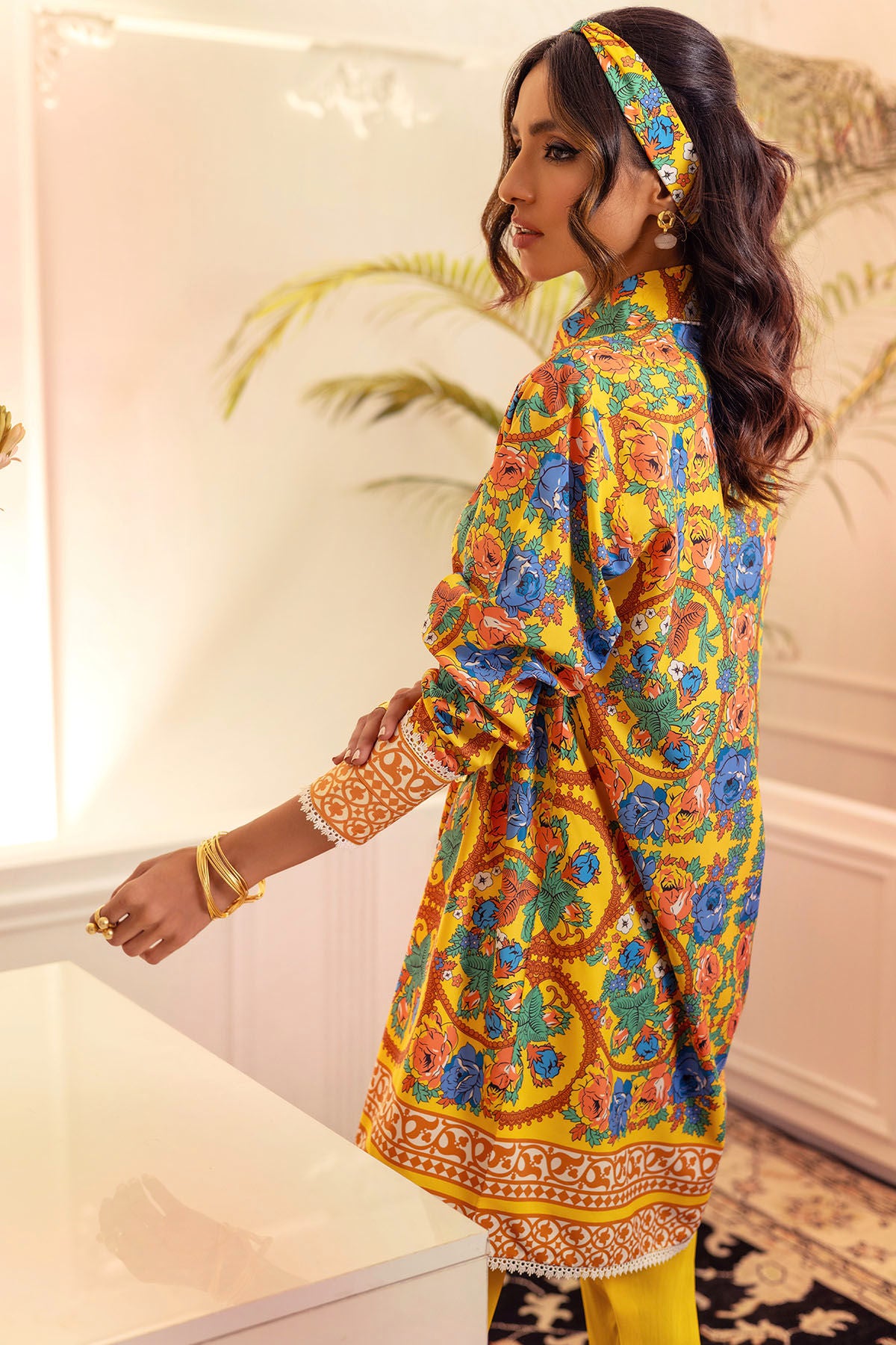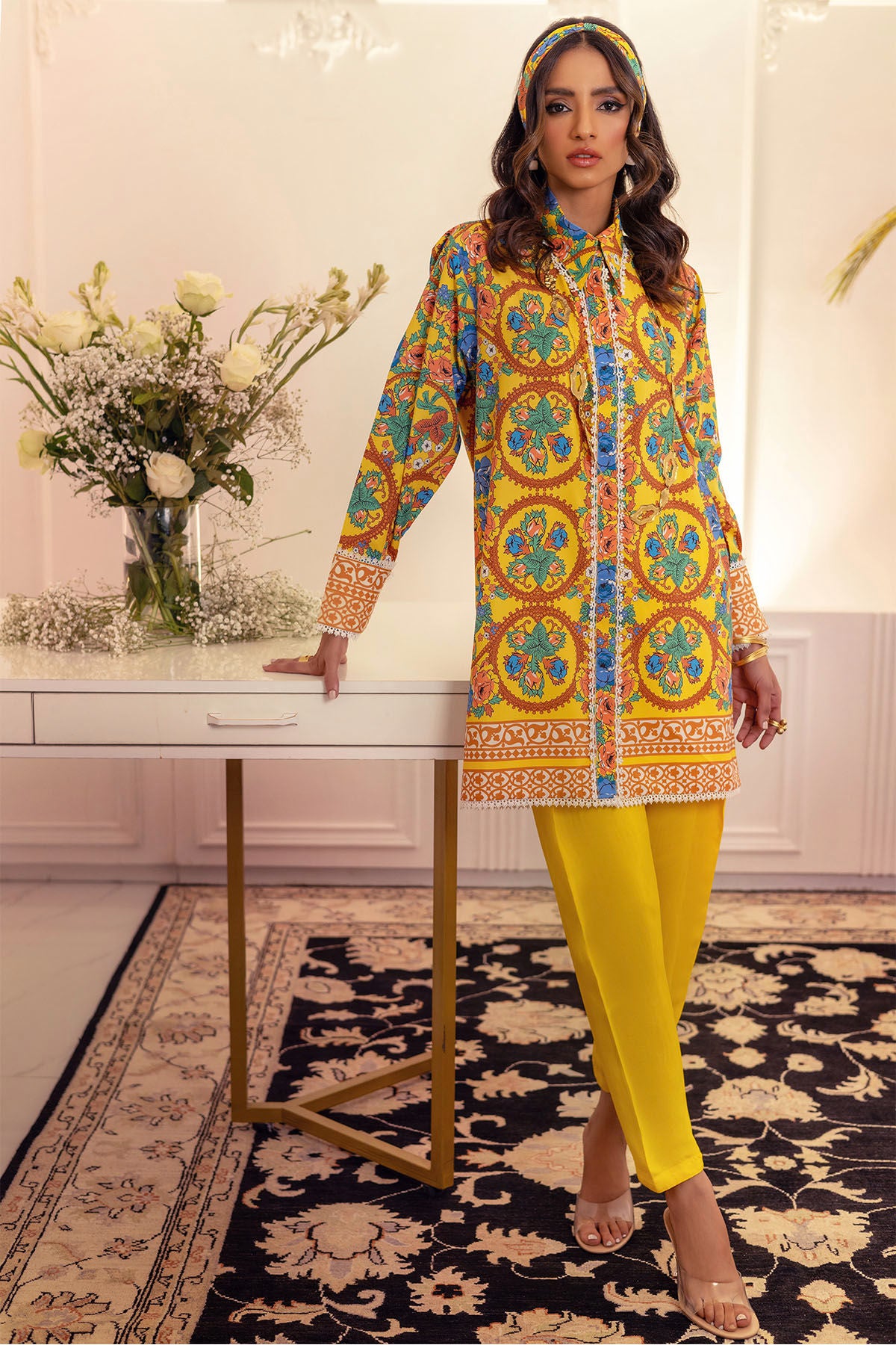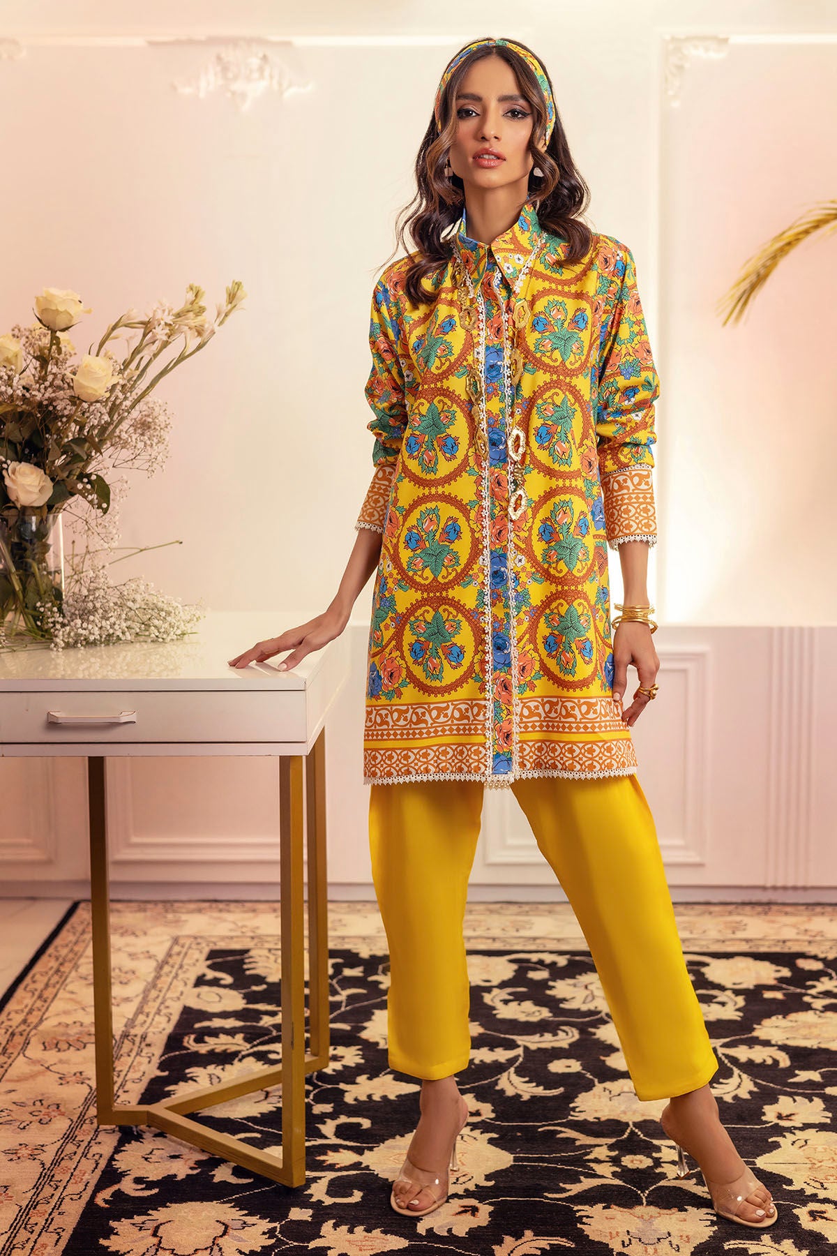 Mid thighs box co-ord set on blended crepe silk in canary yellow featuring floral and geometric details. The neckline and collar are enhanced with lace details and the shirt is paired with straight shalwar.