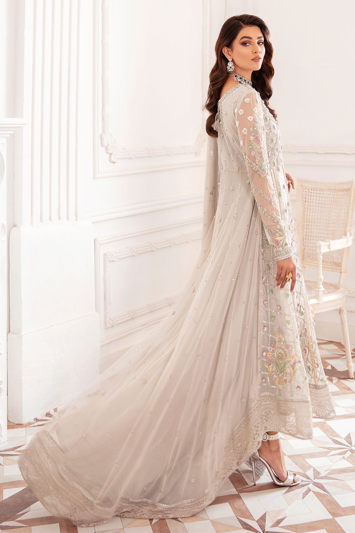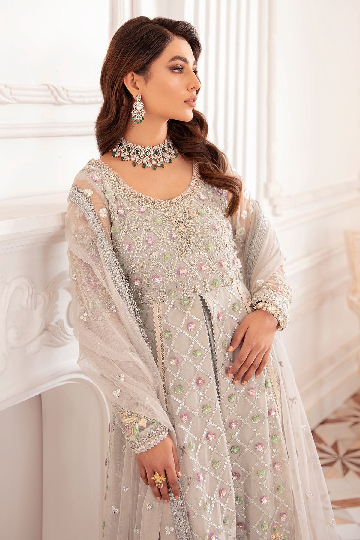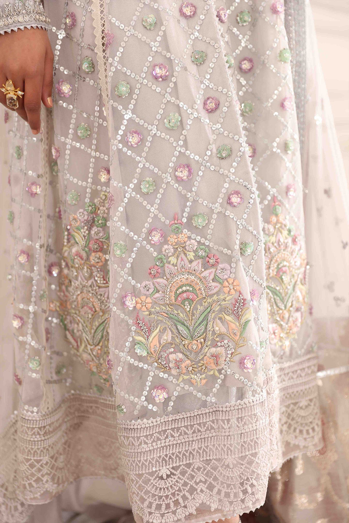 High-low silhouette peplum on subtle grey net canvas featuring multicolored zardozi details. The hem of the peplum is adorned with hand embroidered silk thread motifs which are further adorned with silver zardozi details. The peplum can be paired with straight damask pants and signature AA designed dupatta featuring lorex panels and sequins details.
