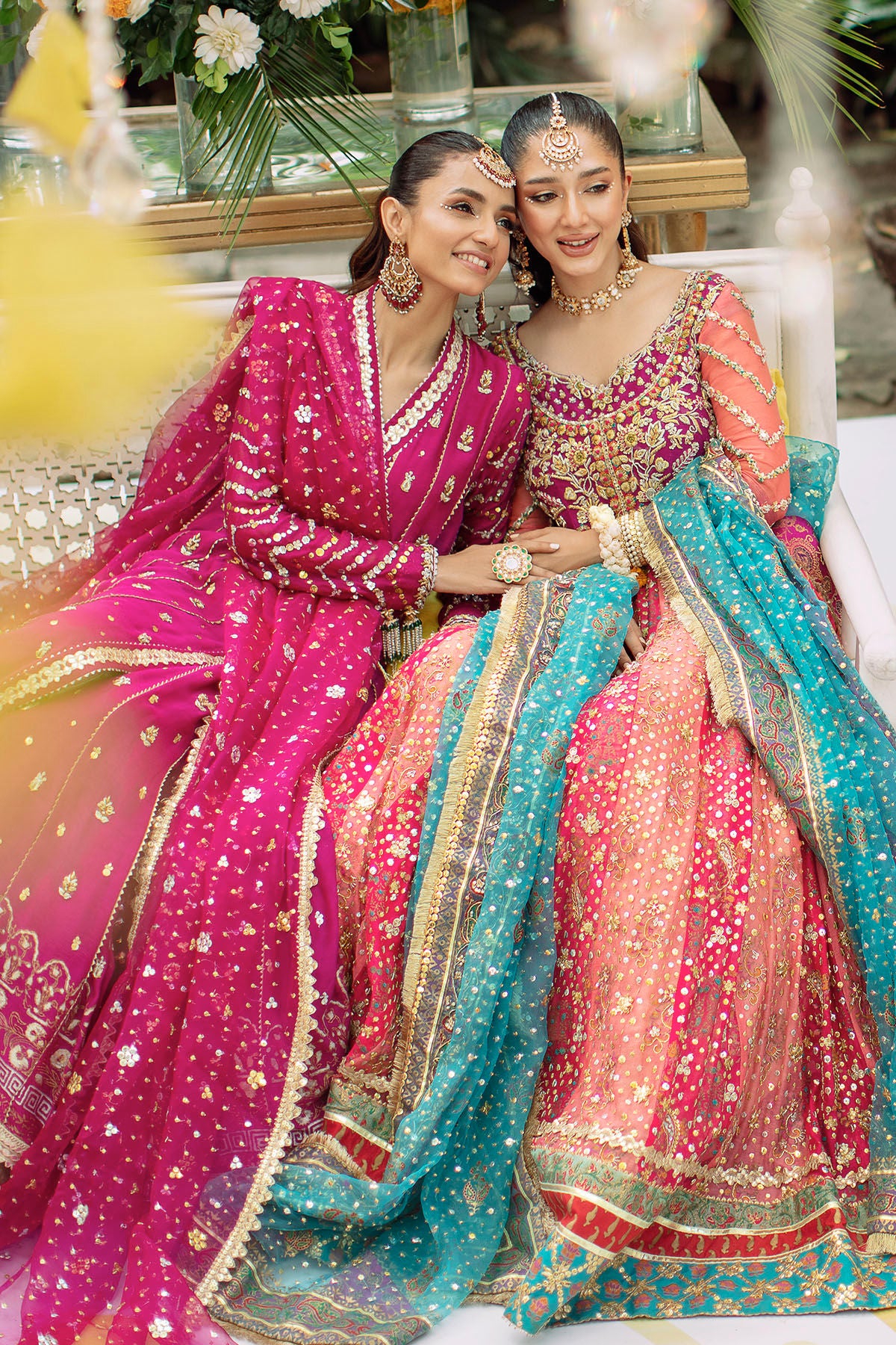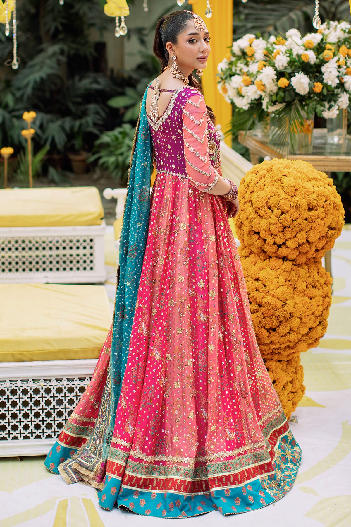 Long silhouette kalidar in pink and coral panels featuring hand block printed details on each panels which are further adorned with zardozi and heavy sequins details, the magenta bodice is decorated with old school gota and zardozi details featuring pop of multi coloured thread embroidered details. The kalidar is paired with contrasting organza dupatta in adriatic sea green shade. The kalidar can be paired with gold damask dhaka for more festive look.
