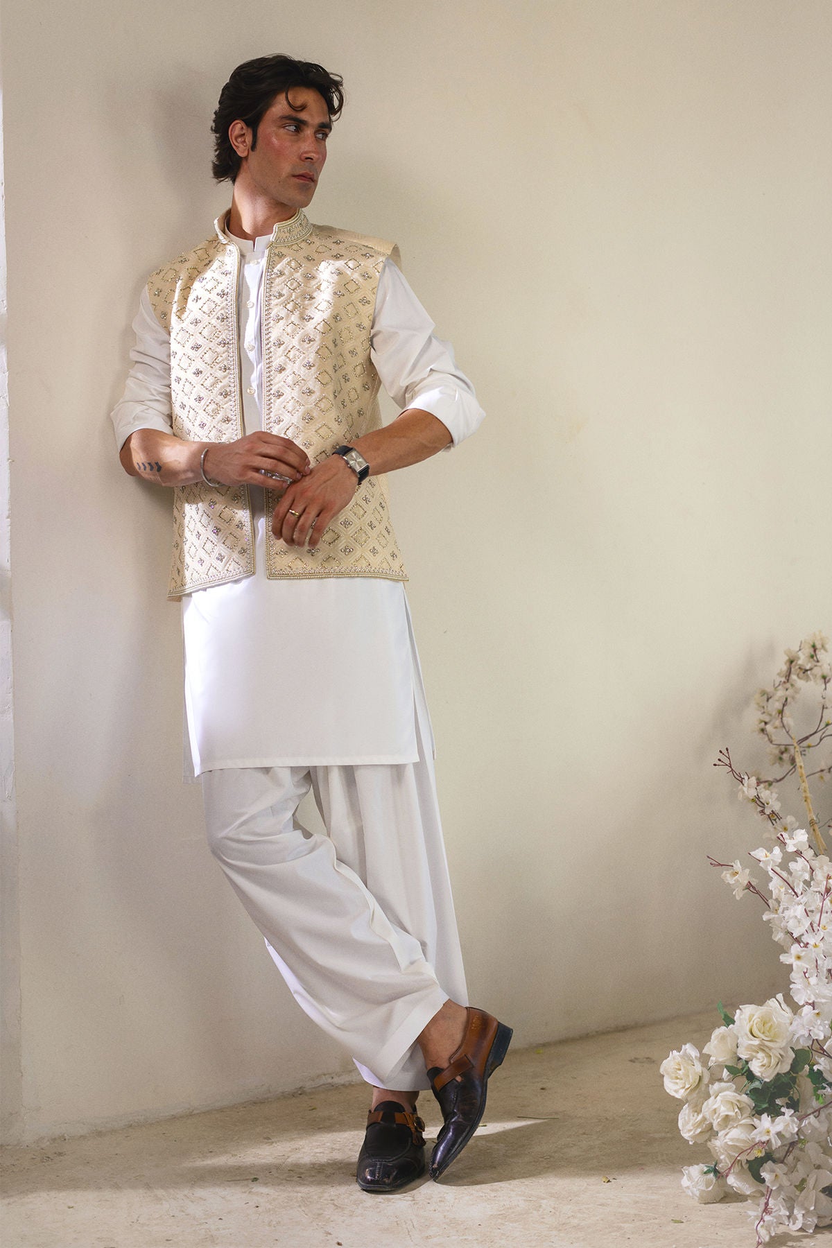 This exquisite Jamawar waistcoat in a delicate ivory gold hue features meticulously detailed zardozi embellishments on the center front. The waistcoat is elegantly complemented by a viscous short kurta and traditional shalwar, resulting in a refined and sophisticated ensemble.