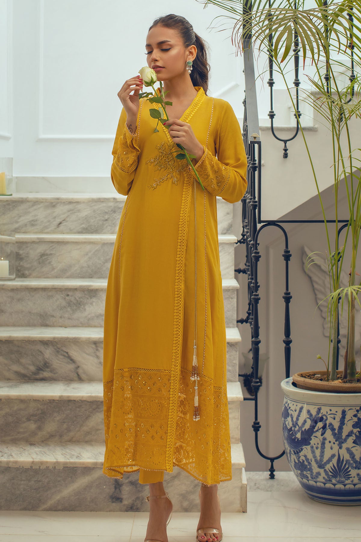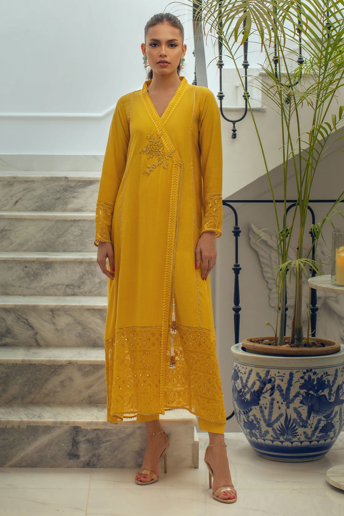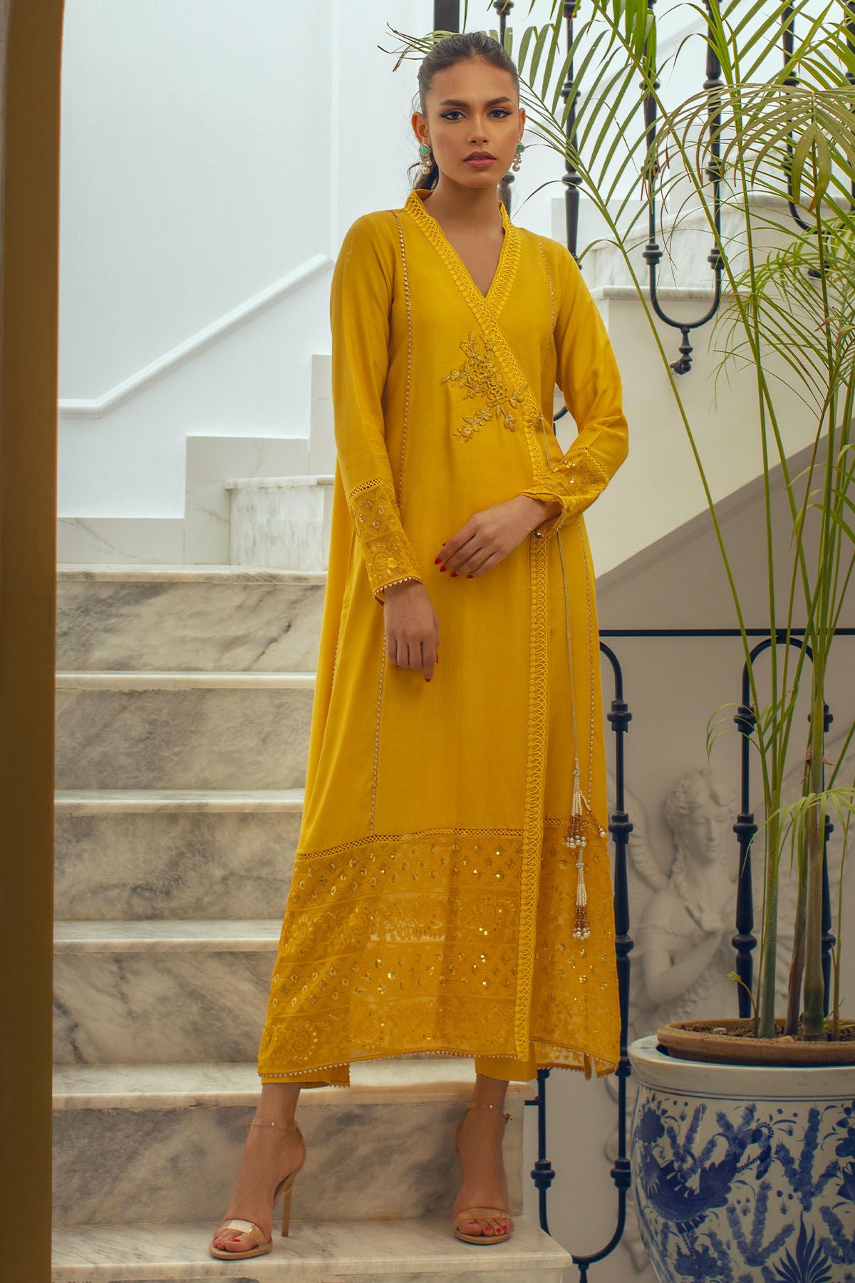 Long silhouette angharka in gorgeous shade of canary yellow featuring lace details on centre front, the hemline is adorned with chikankari panel and the centre front is further enhanced with silk thread floral embroidered details and handcrafted tassels. The angharka can be paired with matching cotton net pants.