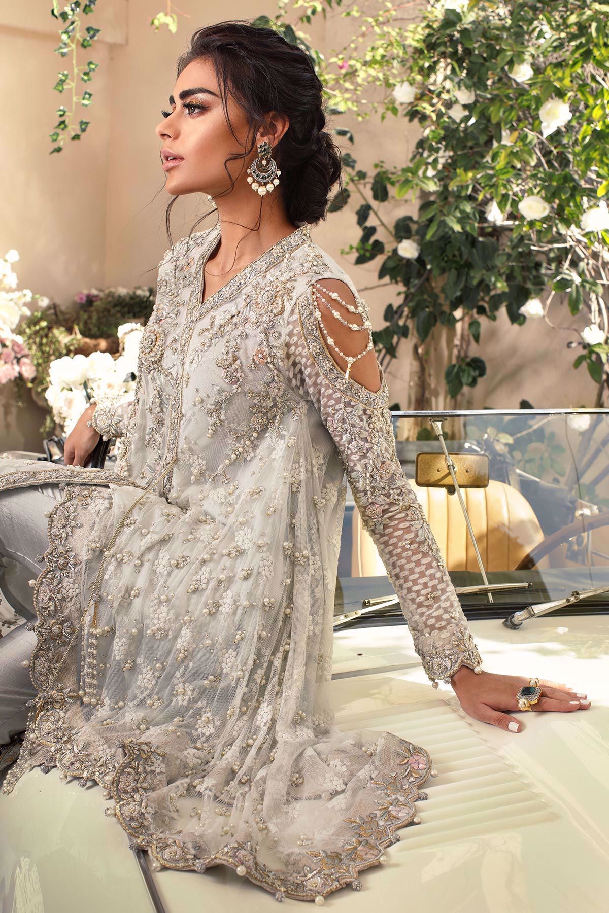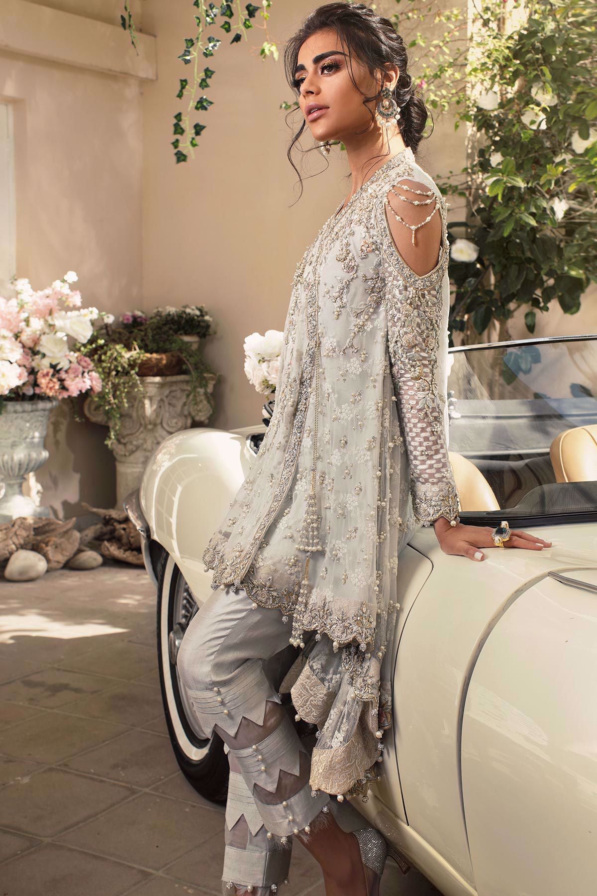 Stunning ice blue angharka with bias cut high low silhouette featuring silk thread embroidered details on the front which is further adorned with pearls, dabka, light catching crystals and sequins. The back of the top is cut on bias which has pearls and sequins details overall. The top is paired with raw silk pants with organza details and fabric manipulation techniques.
