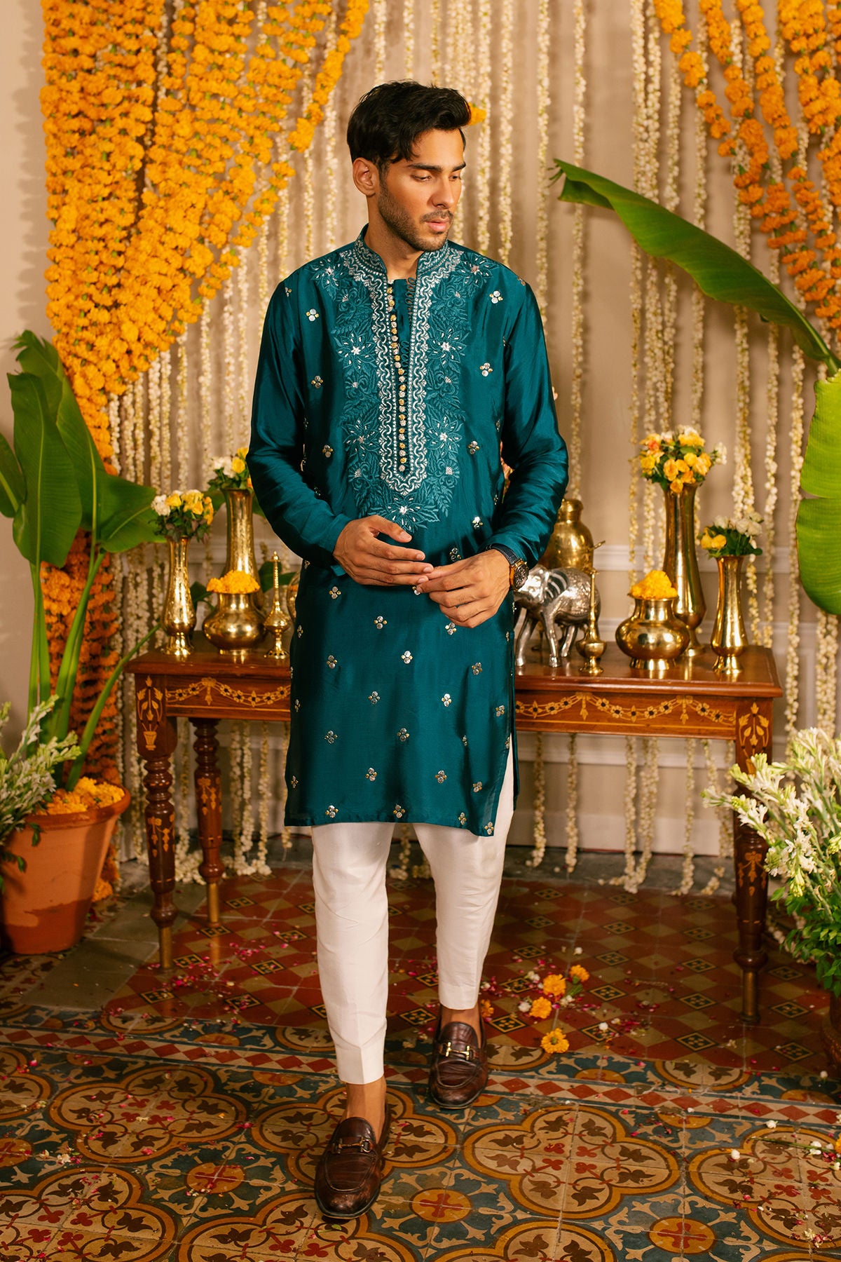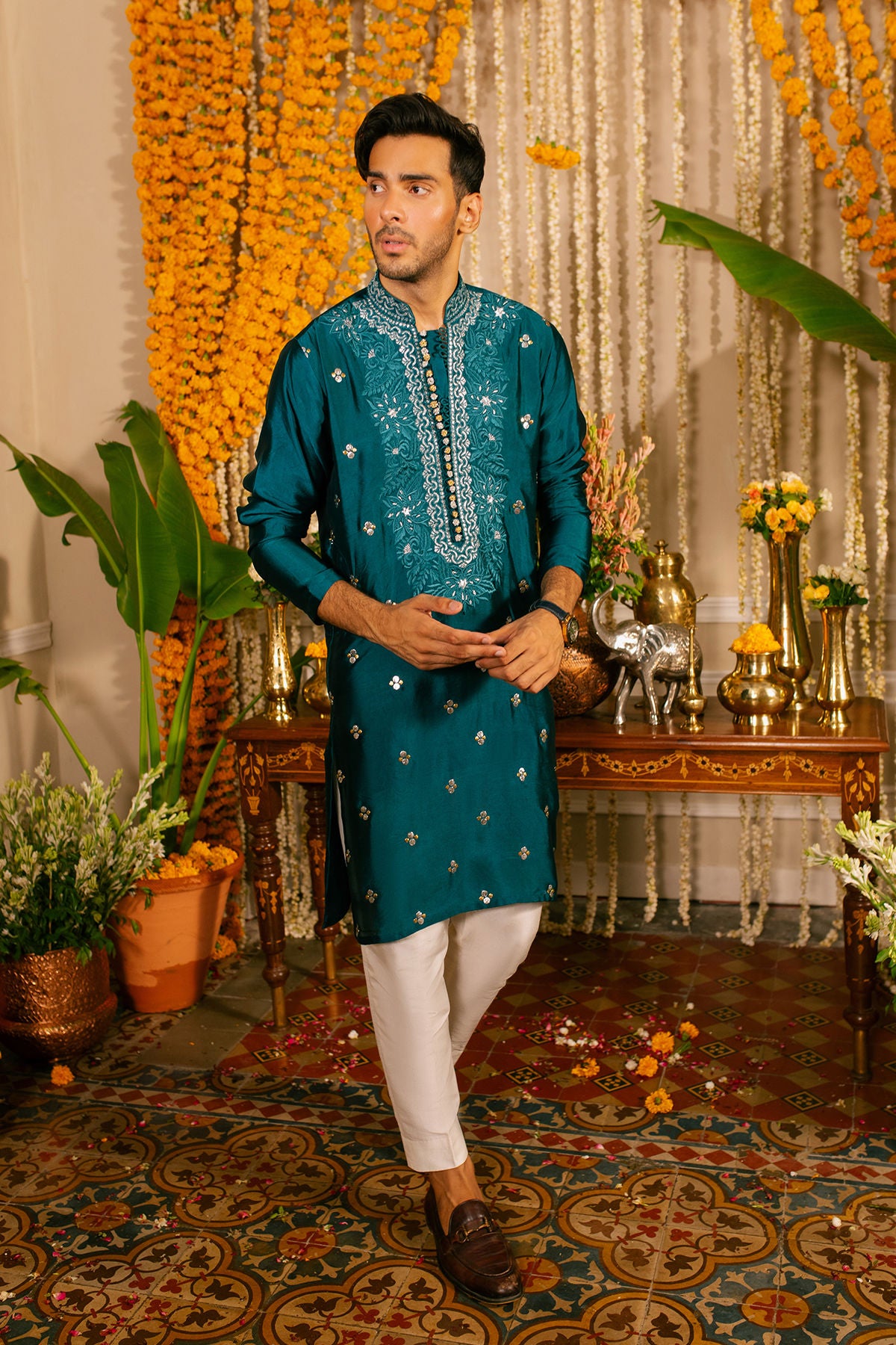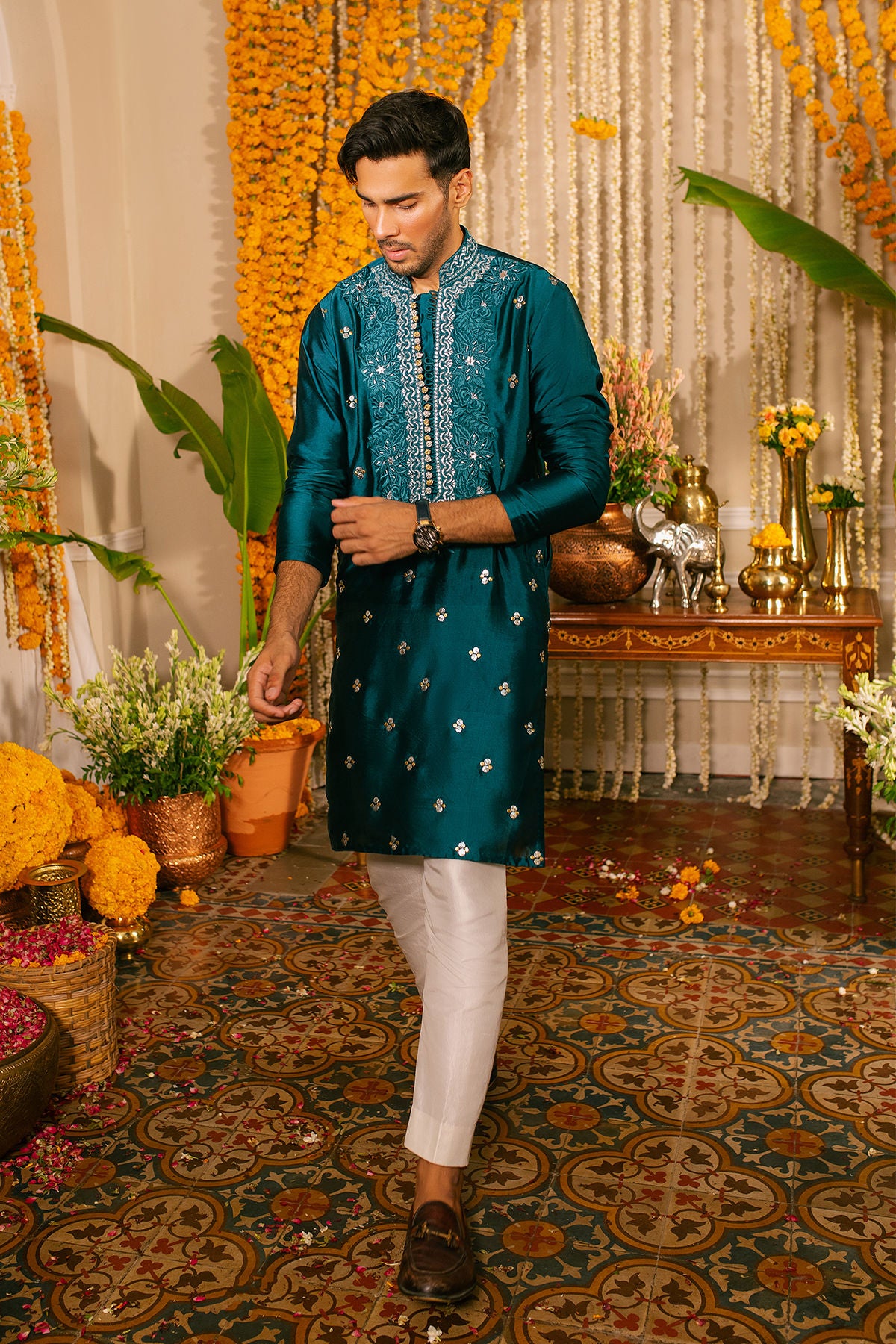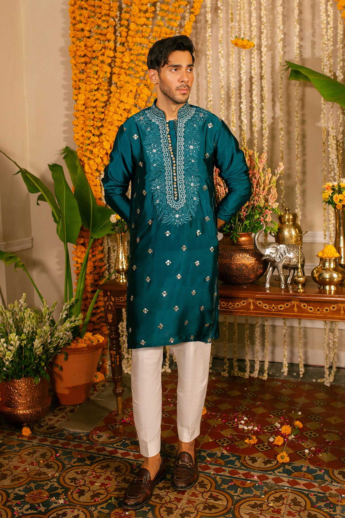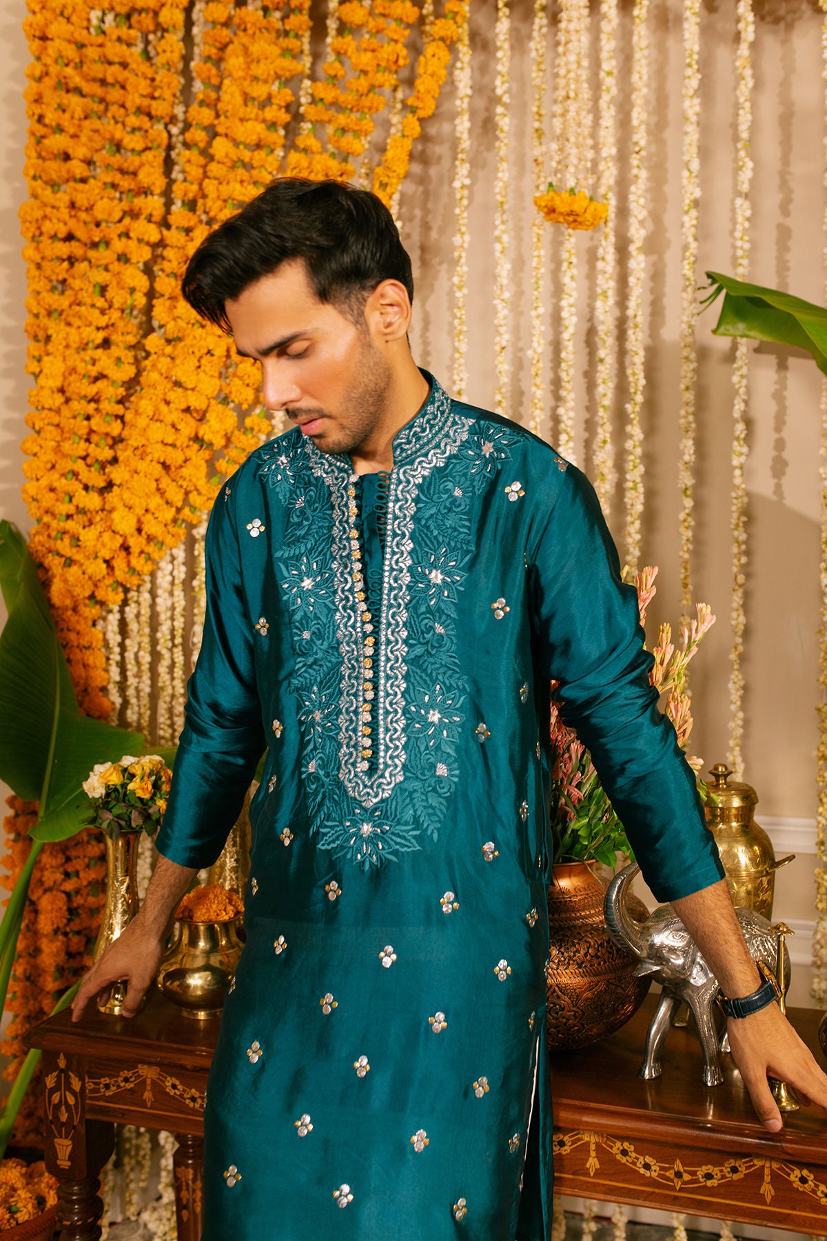 Silk thread details of resham incorporated with age old kaamdani details on head turning jade silk canvas.