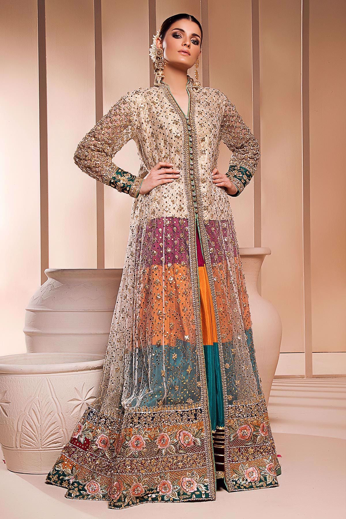 Long silhouette flared paneled ensemble featuring old school inspired kaamdani details along with dabka kora and naqshi. The sleeves of the shirt is heavily hand embroidered with dabka and gota. The hemline has myriad of colorful appliqué details which are enhanced with silk thread rosettes. Paneled dhaka pajama with gathers and velvet details on hemline and dupatta to complete the look.
