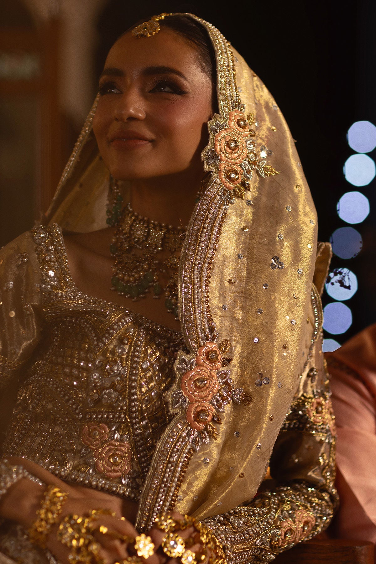 Exquisite choli crafted on a gold glistening lamé fabric, adorned with antique and gold zardozi embellishments. The zardozi details are further enhanced with silk thread rosettes in an opulent coral peach hue. The choli is elegantly paired with a flared lehnga, which boasts subtle hand-embroidered accents in gold, peach, and pink, further enriched with zardozi work and shimmering sequins. The center front of the lehnga is impeccably designed, featuring handcrafted dangling tassels. This sophisticated ensemble is complemented by a long dupatta, showcasing silk thread rosettes and zardozi borders, making it a striking choice for this wedding season.