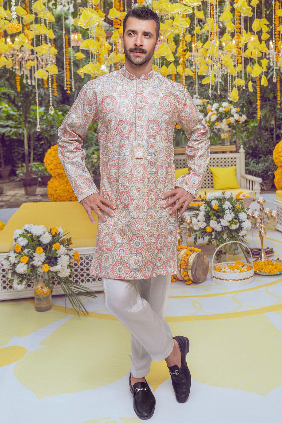 Raw silk kurta in subtle sand shade featuring multicoloured embroidered pattern which is enhanced with gold zari. The kurta is paired with matching raw silk pants.