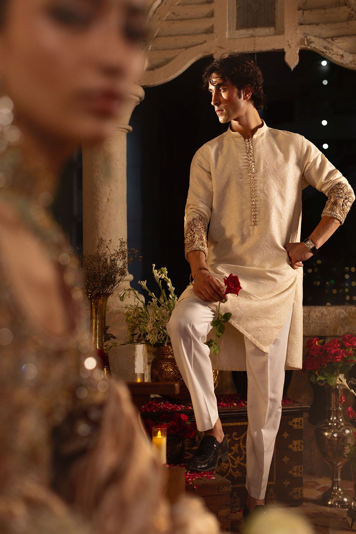 Kamel presents a self-referential ensemble crafted from pure handcrafted khaadi in a subtle ivory hue. This piece is accentuated by delicately handcrafted zardozi embellishments on the sleeves. The neckline is elegantly adorned with loop button details. The kurta is complemented by straight pants to complete the overall look.