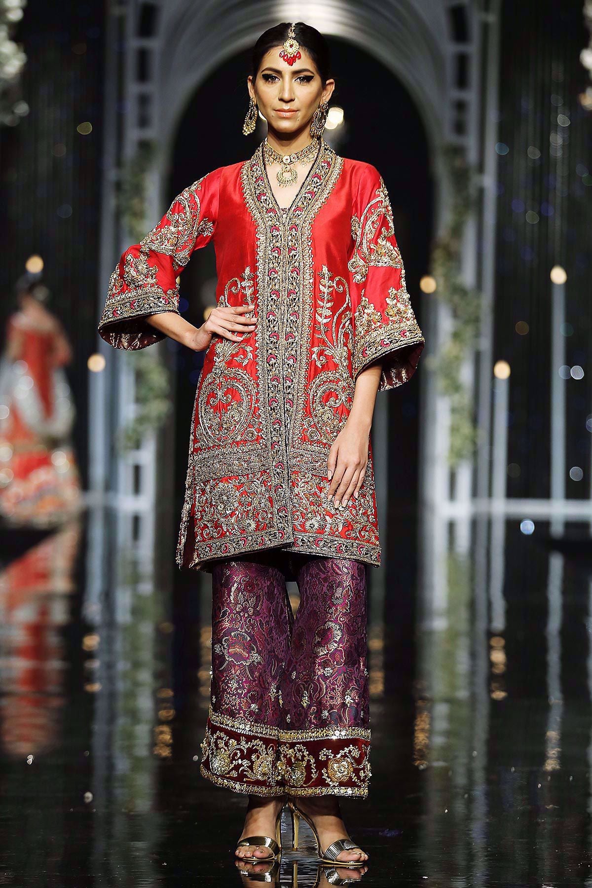 Front open kimono inspired shirt with old school hand embroidered techniques of dabka, nakshi and maroori merged together on black velvet canvas. The jacquard plum pants with velvet appliqué on the hem enhanced with gold and silver hand worked details incorporated with gota techniques.