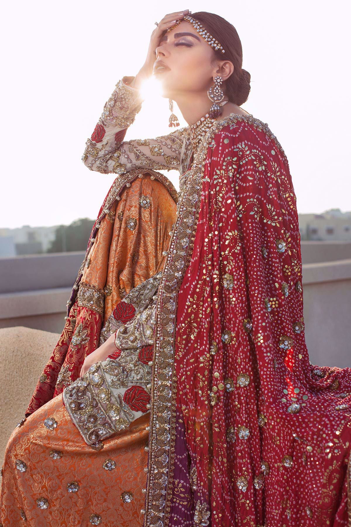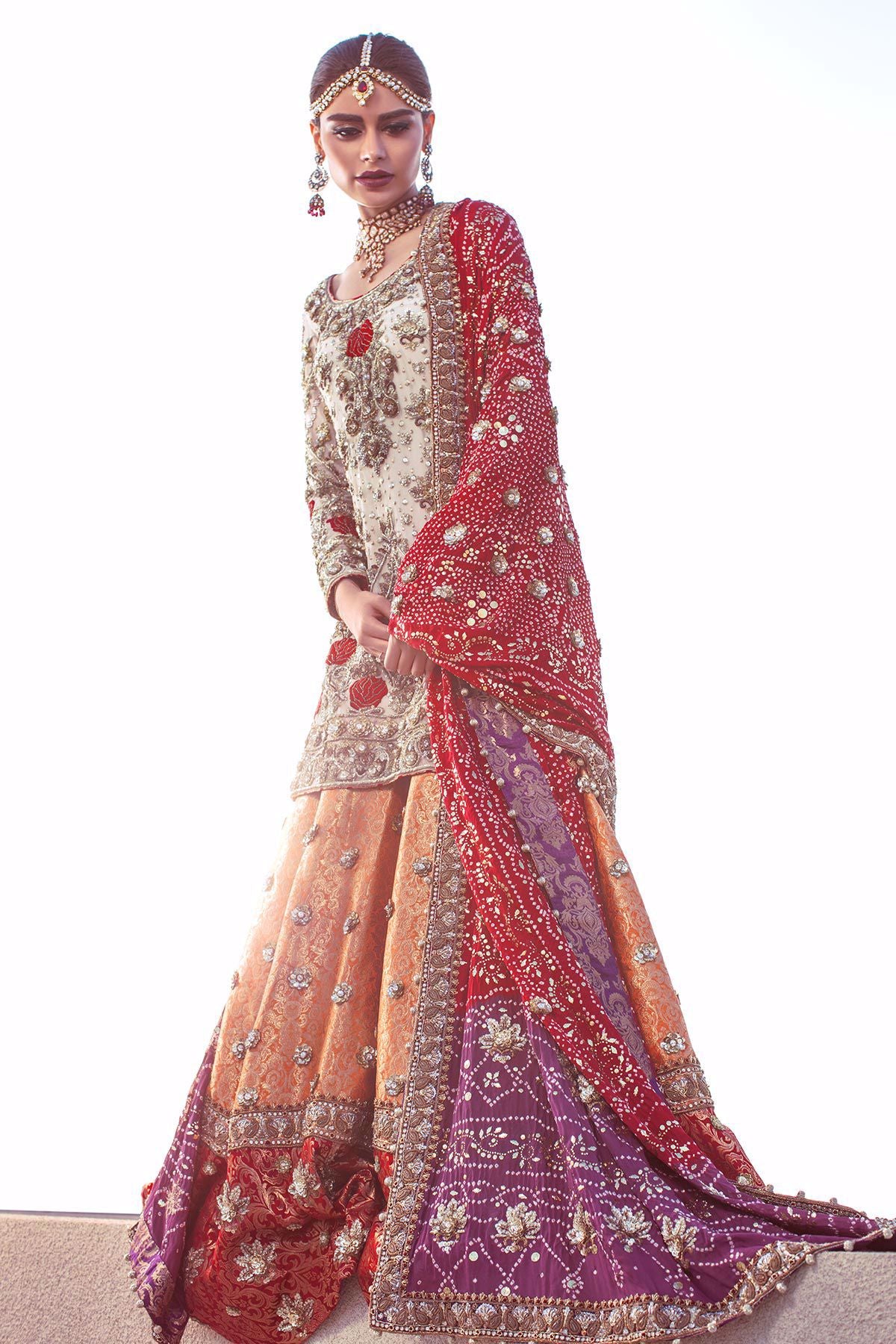 This ivory and red bridal from La Beauté is sure to turn heads. The ivory net shirt is loaded with dabka, naqshi and tila embroidery. The hemline of the shirt has heavy zardoze work which is adorned with oxblood resham roses. The two colored dhaka pajama has zardoze border and heavy botis on the paincha. The chundri dupatta has violet and red ombré dying which is adorned with heavy kamdani incorporated with four side zardoze borders and botis.