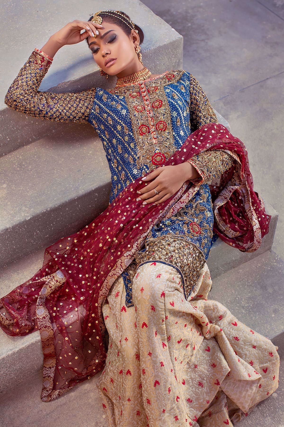 This super stunning midnight blue shirt with maroon rosettes is made on pure cotton net. The old school inspired antique heavy work with resham rosettes are sure to set you apart. The shirt is heavly worked with kamdani. The shirt comes with dull gold dhaka pajama and oxblood dupatta with heavy sequins spray.