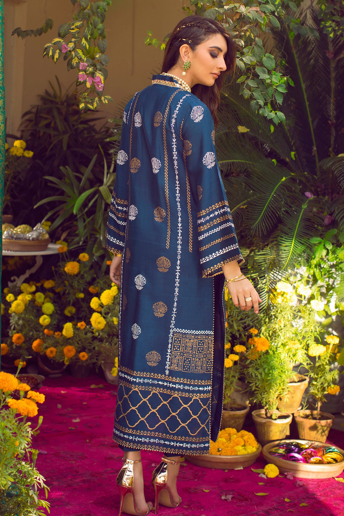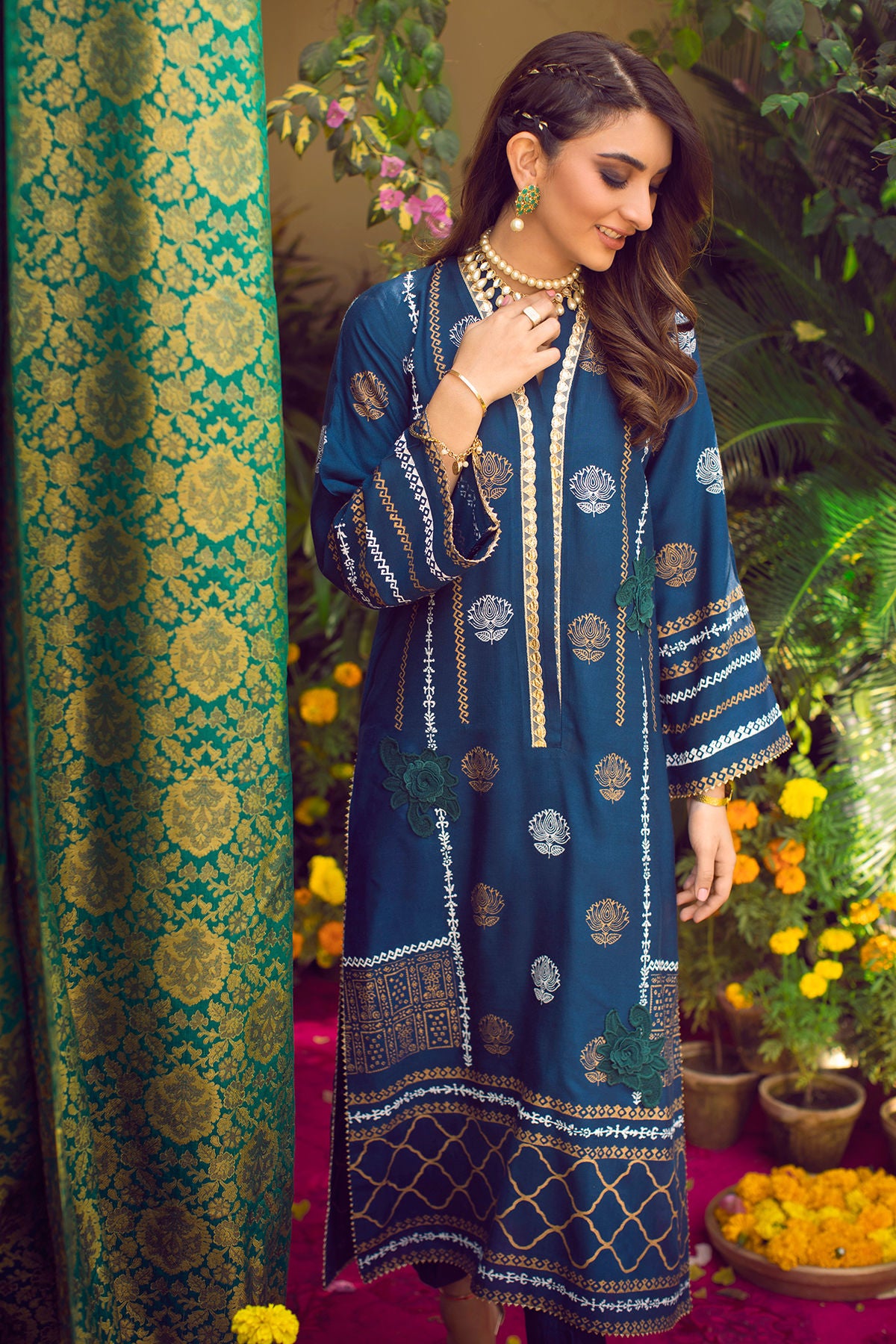 Long silhouette cotton net shirt in head turning electric blue featuring hand block printed details in gold and white. The neckline of the shirt is adorned with gold lace details; the front of the shirt is enhanced with 3D appliqué details. The shirt comes with straight pants featuring gota details on the hem.