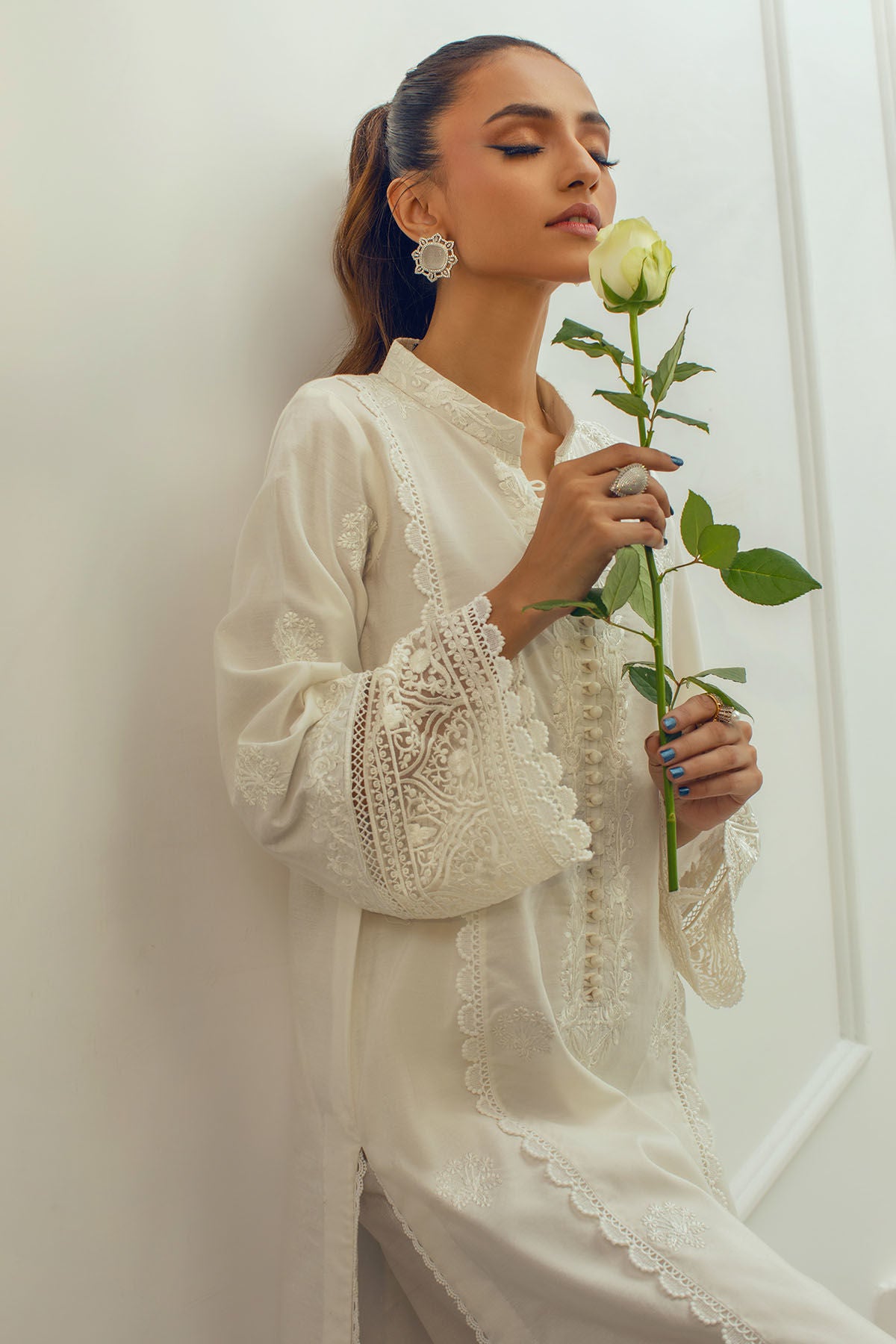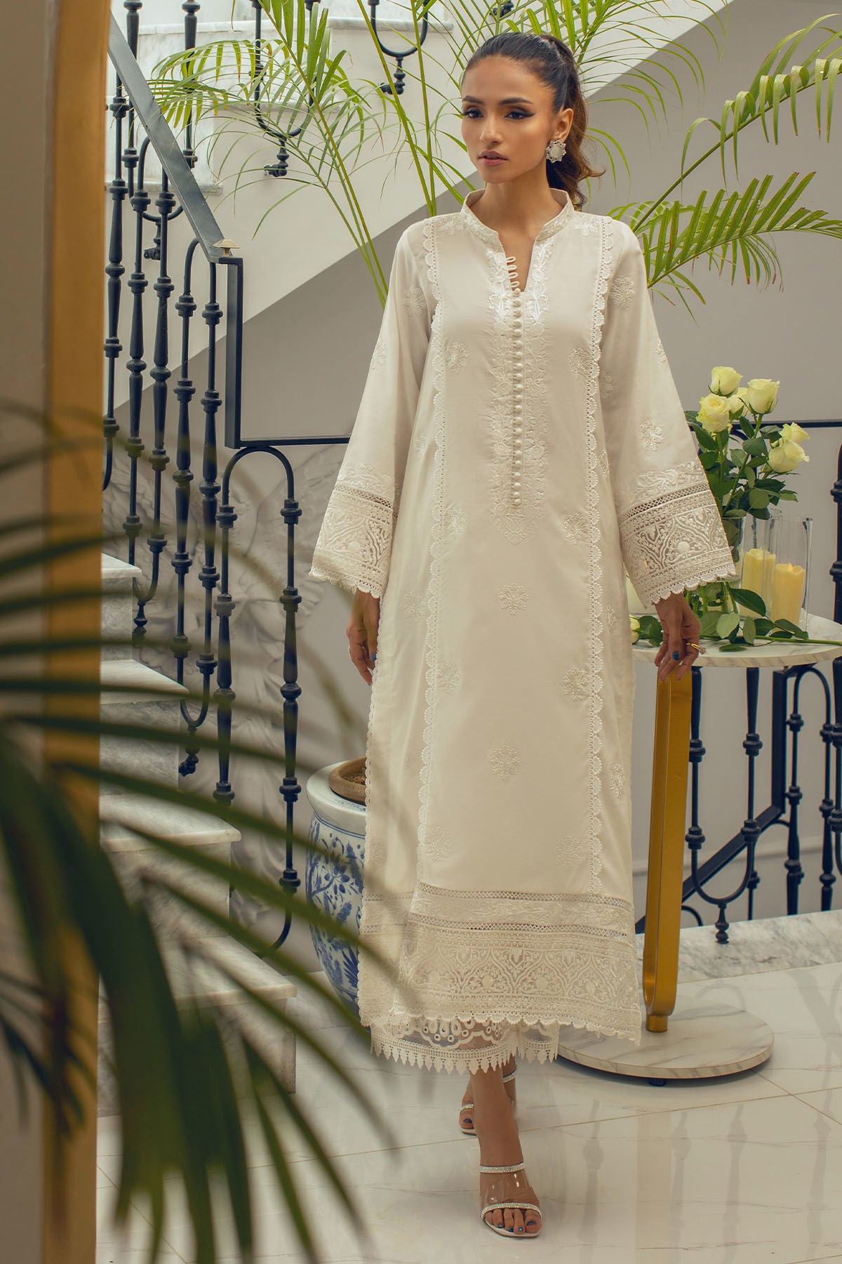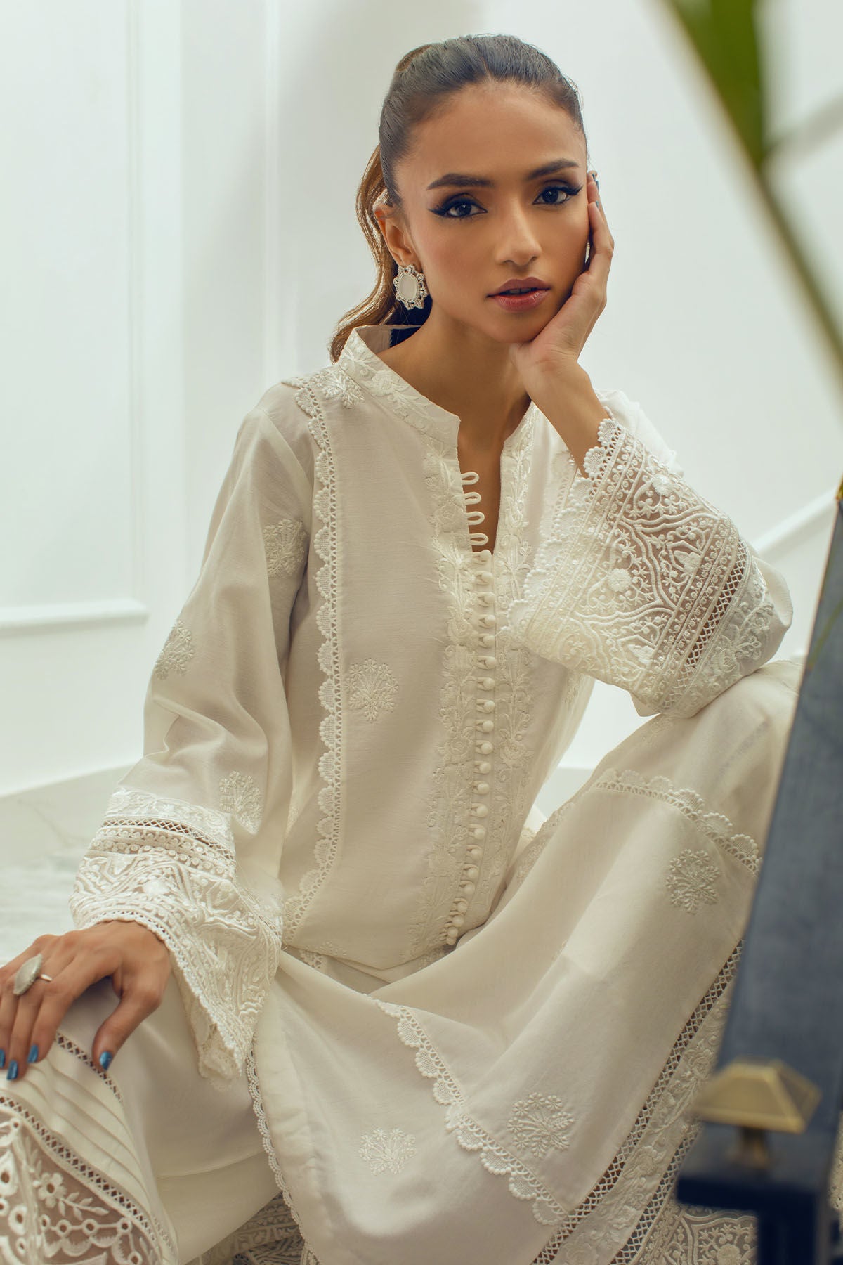 Long silhouette cotton net kurta on opulent white canvas featuring self-embroidered details on neckline and centre front, the neckline is adorned with loop buttons details and the hem is enhanced with pure organza embroidered panel. The shirt is paired with Alma azaar featuring pleats and organza schiffli panel finished with crochet lace..