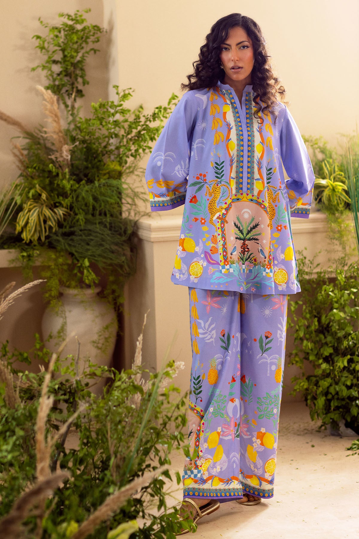 Co-ordinating set crafted from crepe silk, adorned with whimsical floral printed details. This ensemble includes a knee-length shirt characterized by a loose silhouette, embellished with floral and fauna printed accents. The shirt is elegantly paired with loose-fitting coordinating trousers.