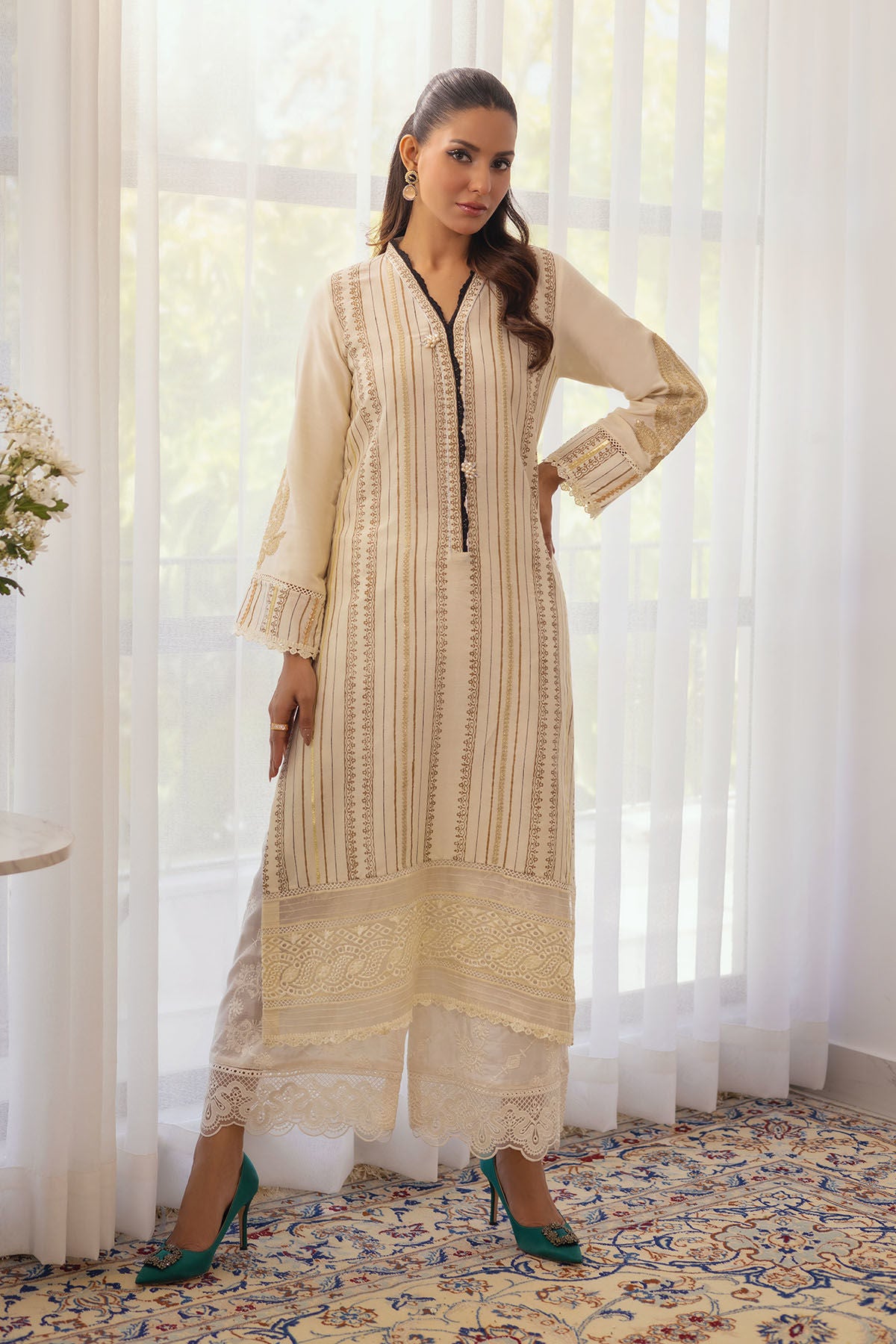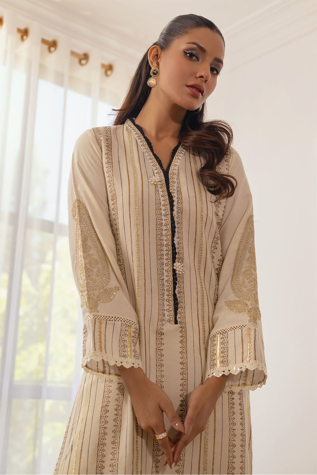 Timeless ivory cotton net canvas adorned with silver gold block printed details. The block printed panels are adorned with zari details. The hemline is enhanced with schiffli and organza pintucks details. The sleeves are carefully crafted with paisely zari applique motifs finished with gota and lace details. The shirt can be paired with Surrina embroidered Izaar featuring schiffli details on hem.