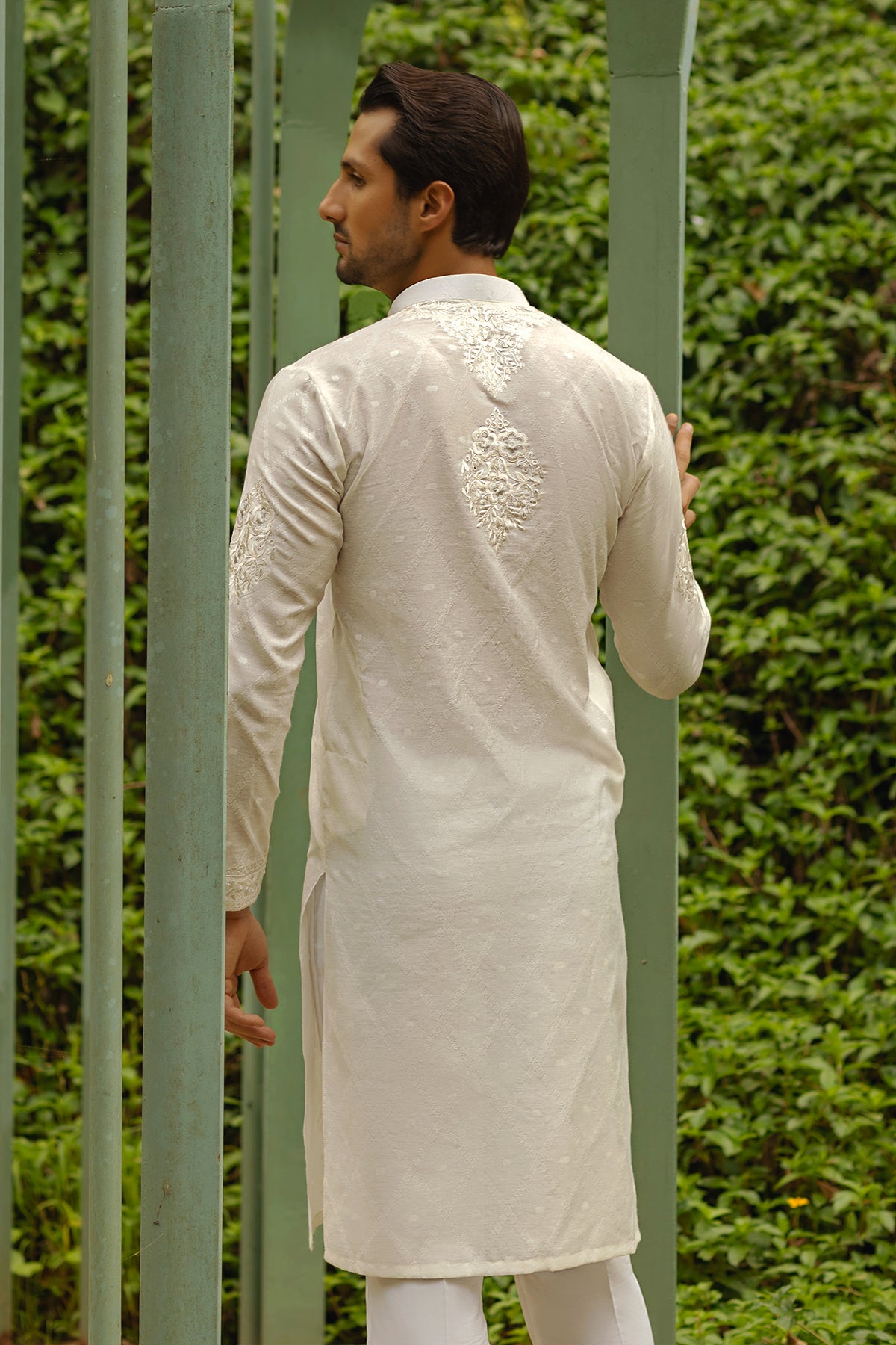 Off white self-patterned cotton net kurta featuring tone-on-tone embroidered details with a hint of silver zari. The kurta is paired with straight cotton pants to create a festive look.