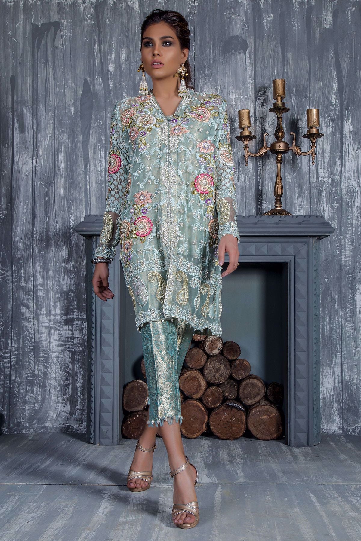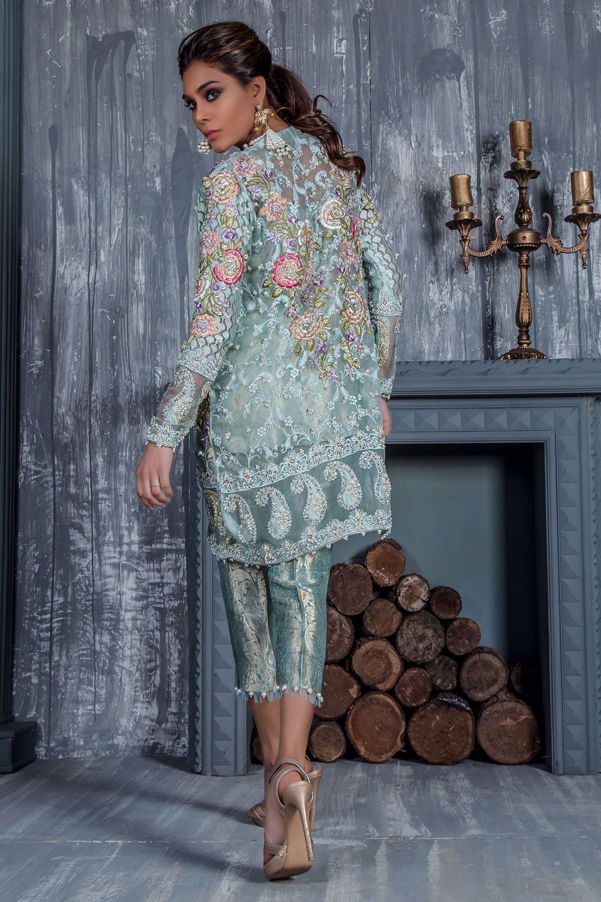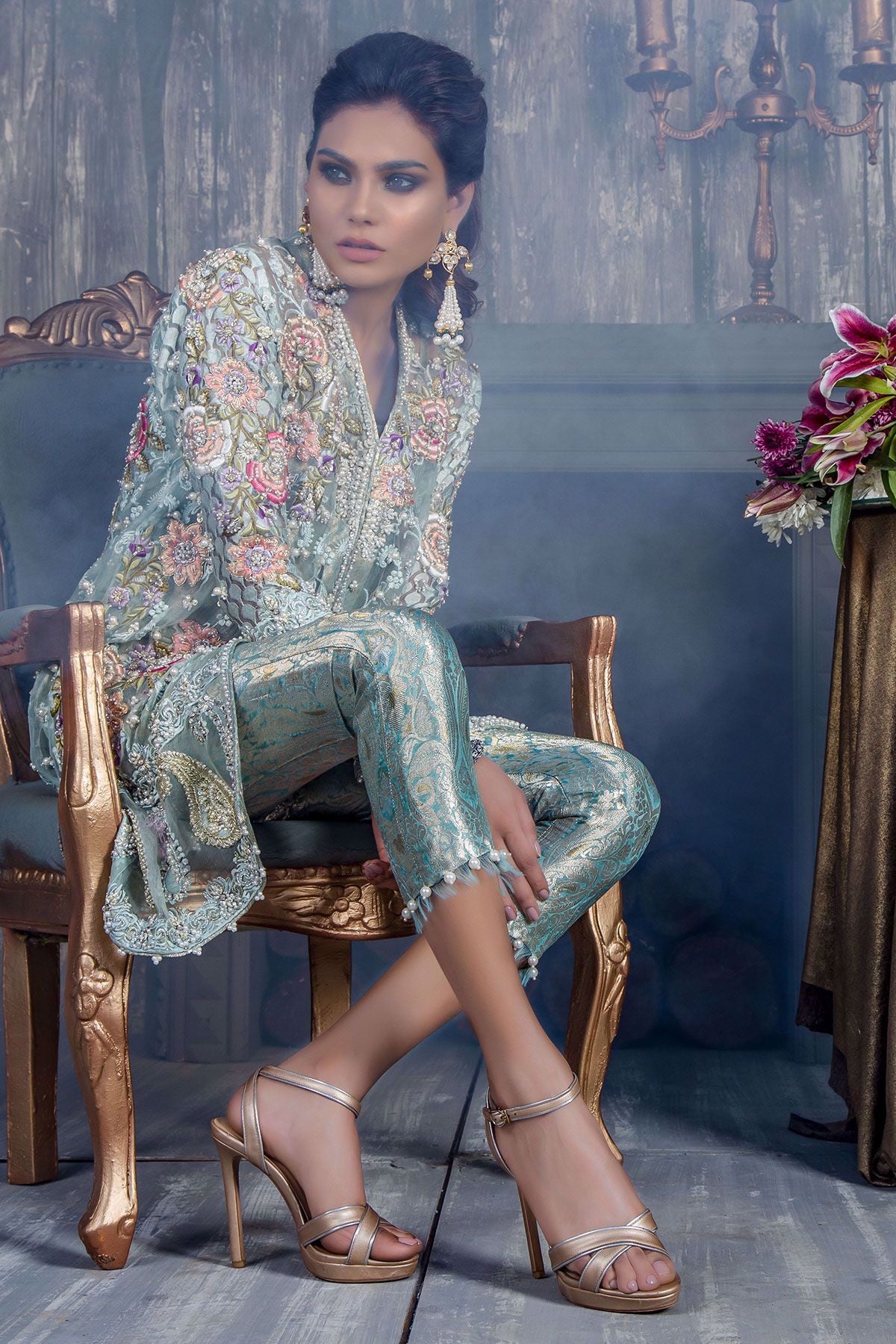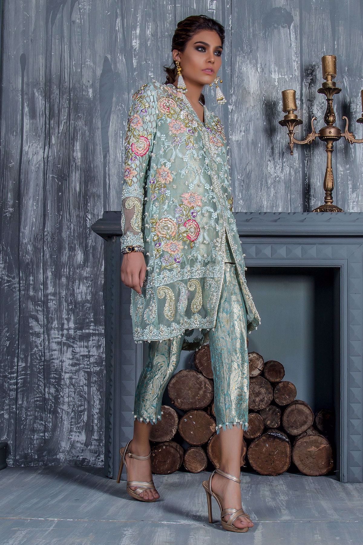 Front open jade green organza jacket with floral silk thread embroidered details decorated with pearls and light catching crystals, damask slip and pants highlighted with beads included.