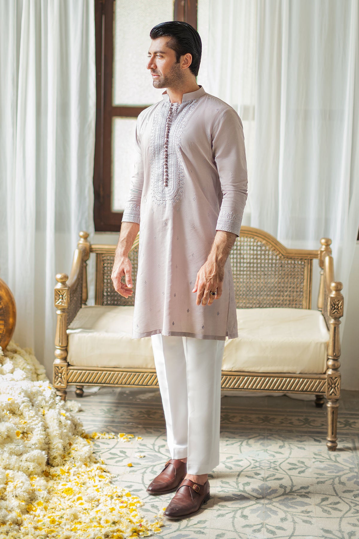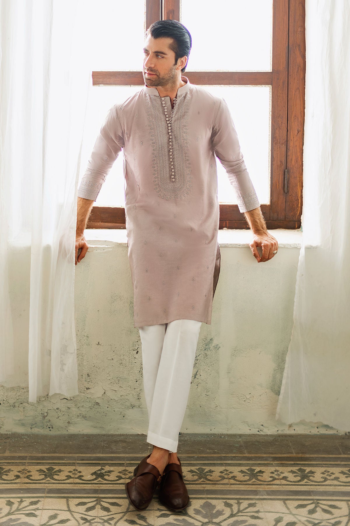 Subtle violet kurta on cotton net canvas featuring silk thread embroidered details on neckline and back. The kurta is enhanced with loop and handcrafted button details and can be paired with white cotton pants.