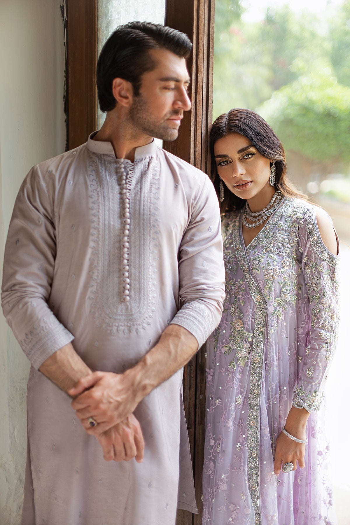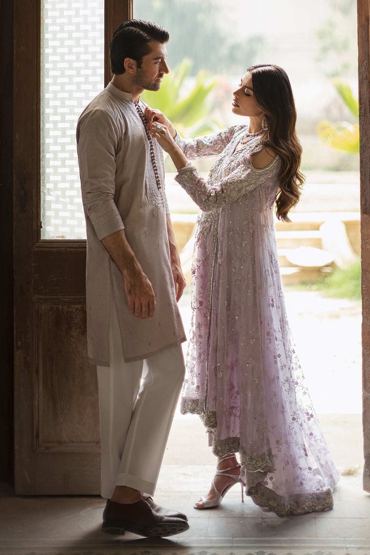 Dry clean recommended. Iron clothes at moderate temperature. Store outfit in the garment bag provided