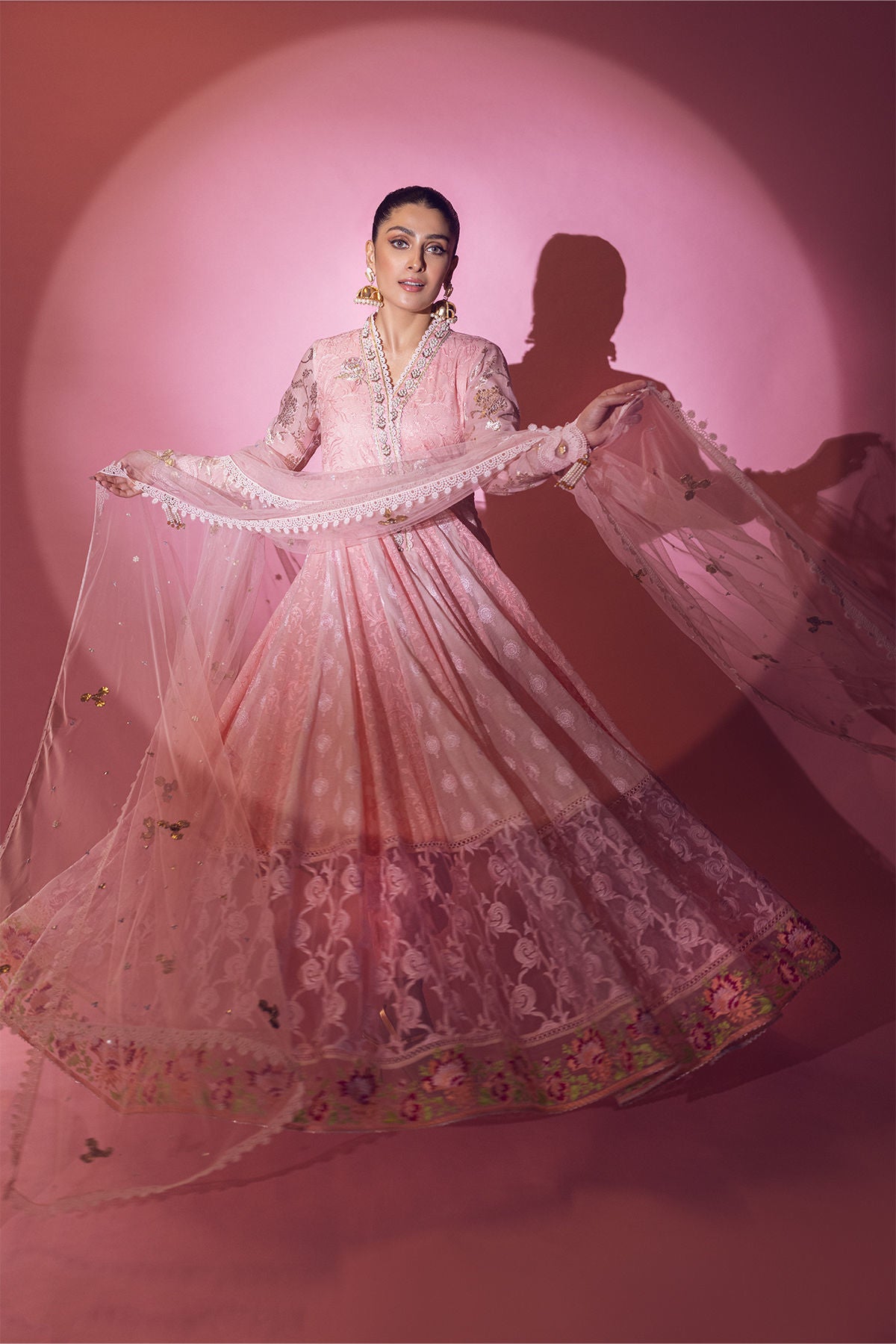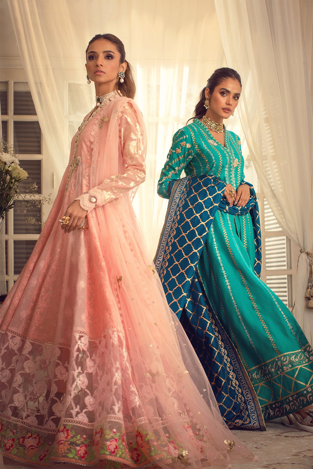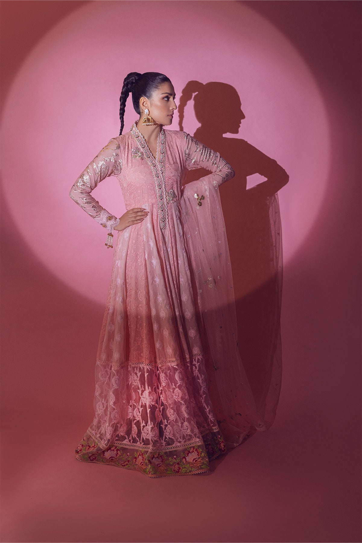 Floor length pishwas featuring peach and pink chikankari panels adorned with net sequins embroidered border on the hemline. The hemline is further adorned with multicoloured border and gota details. The neckline is made of pearls, dabka and stones. Lorex sleeves are enhanced with gota details and lace appliqué featuring handcrafted gota and pearls tassels. The pishwas is paired with plain raw silk straight pants. The pishwas is paired with net dupatta enhanced with gota, sequins and pearls.