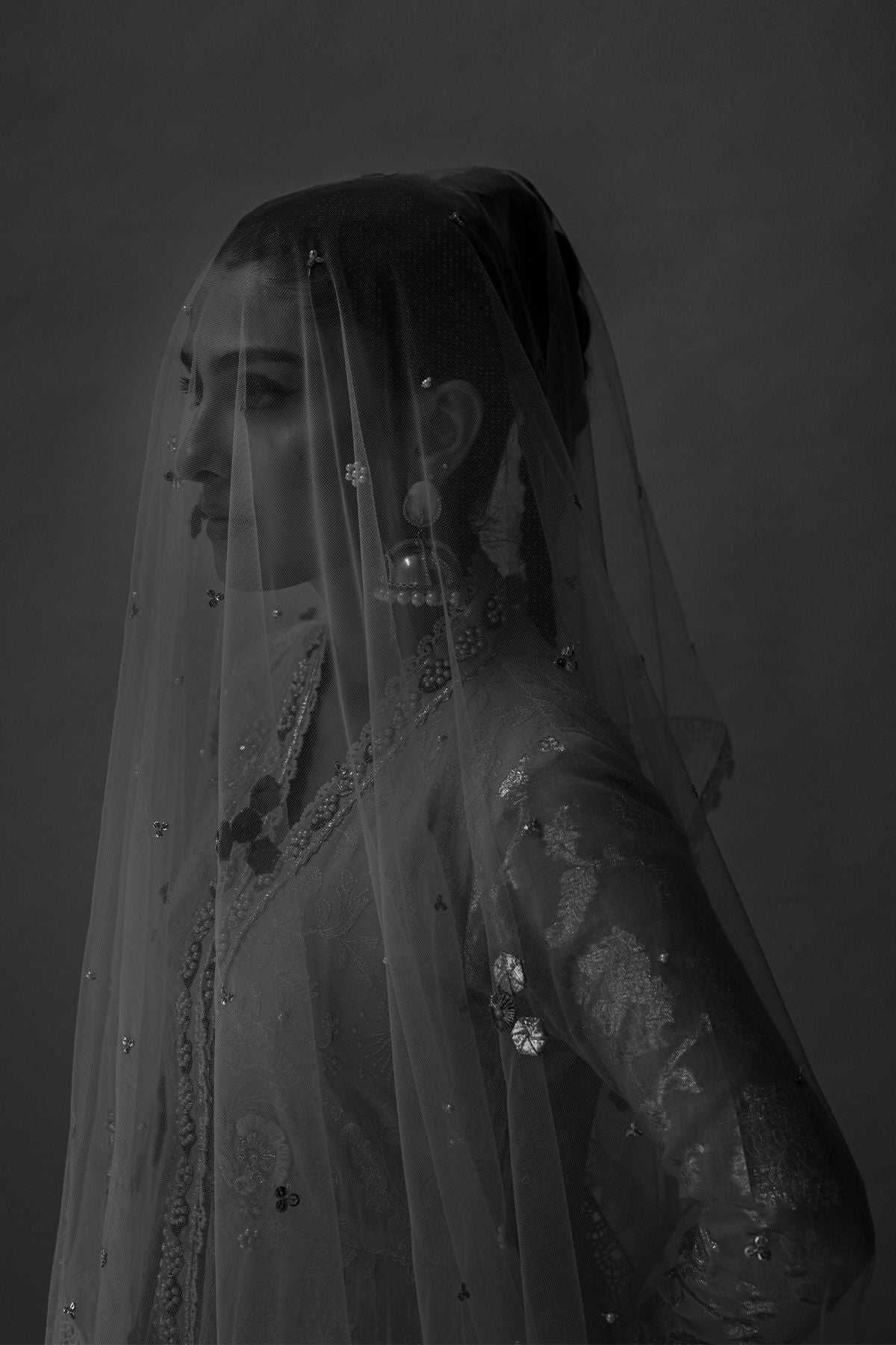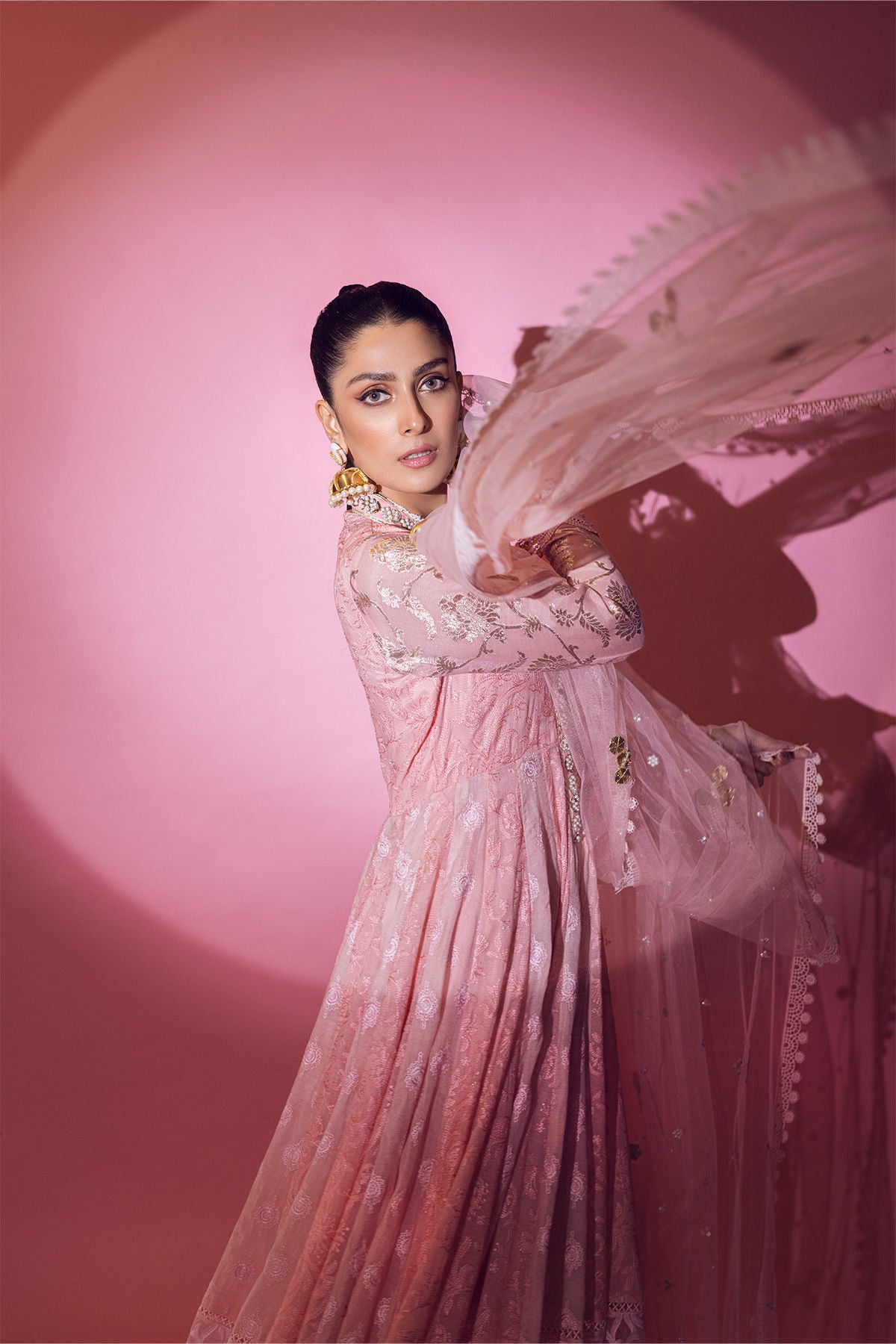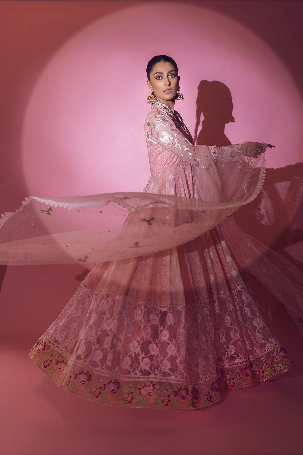 Floor length pishwas featuring peach and pink chikankari panels adorned with net sequins embroidered border on the hemline. The hemline is further adorned with multicoloured border and gota details. The neckline is made of pearls, dabka and stones. Lorex sleeves are enhanced with gota details and lace appliqué featuring handcrafted gota and pearls tassels. The pishwas is paired with plain raw silk straight pants. The pishwas is paired with net dupatta enhanced with gota, sequins and pearls.