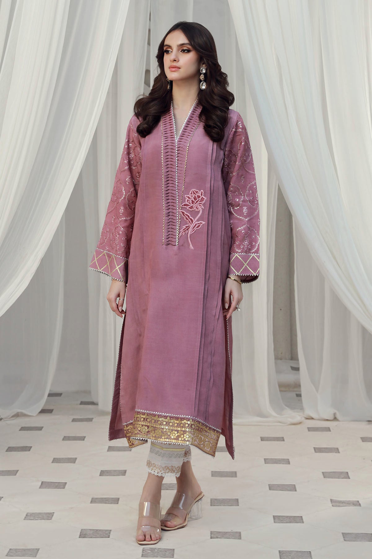Long silhouette shirt on raw silk canvas in onion pink shade featuring fabric manipulation details on neckline. The centre front is adorned with velvet appliqué details and the hem is decorated with sequins and zari panel. The centre front is enhanced with pleats detailing. The shirt can be paired with soneri pants for a festive look.