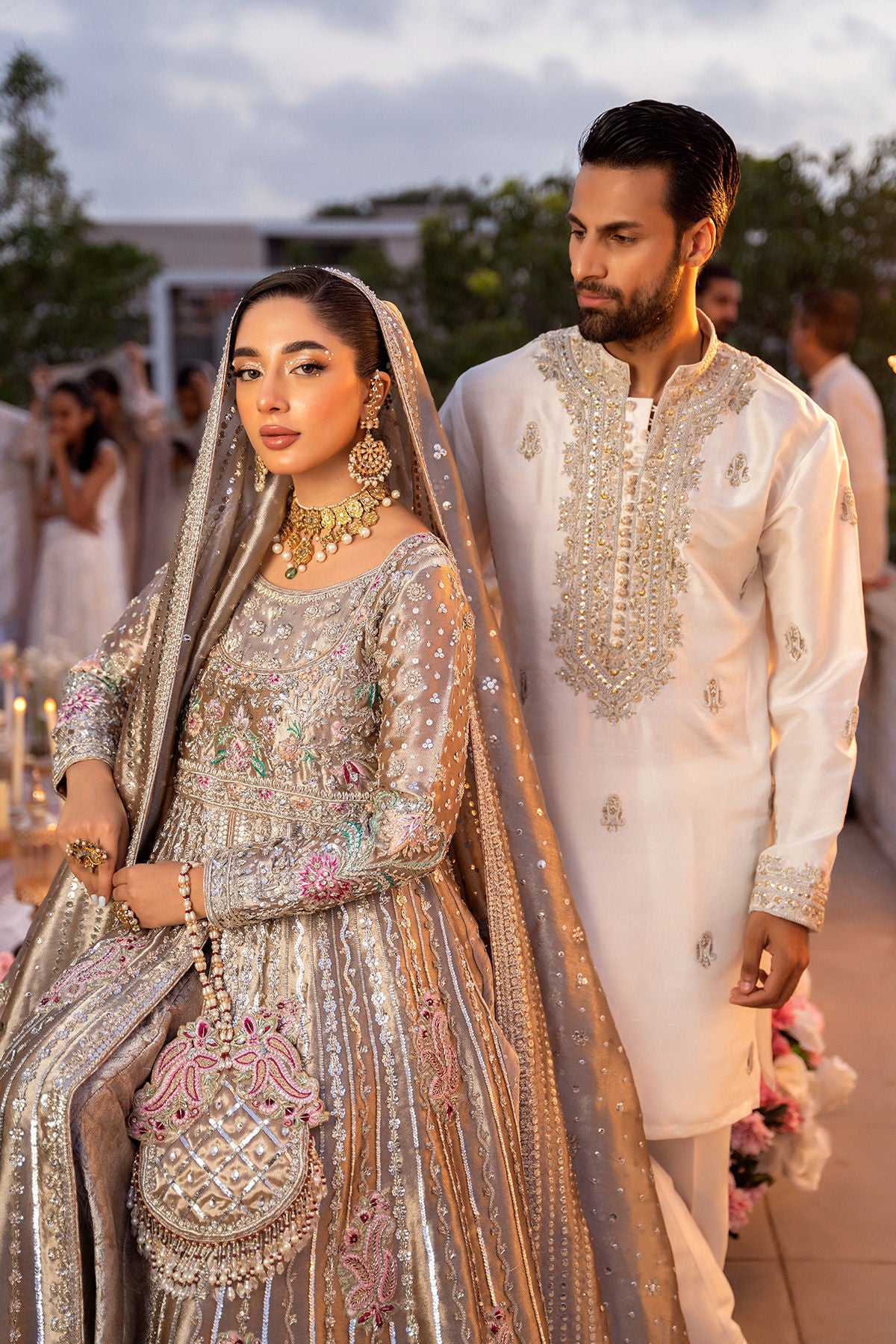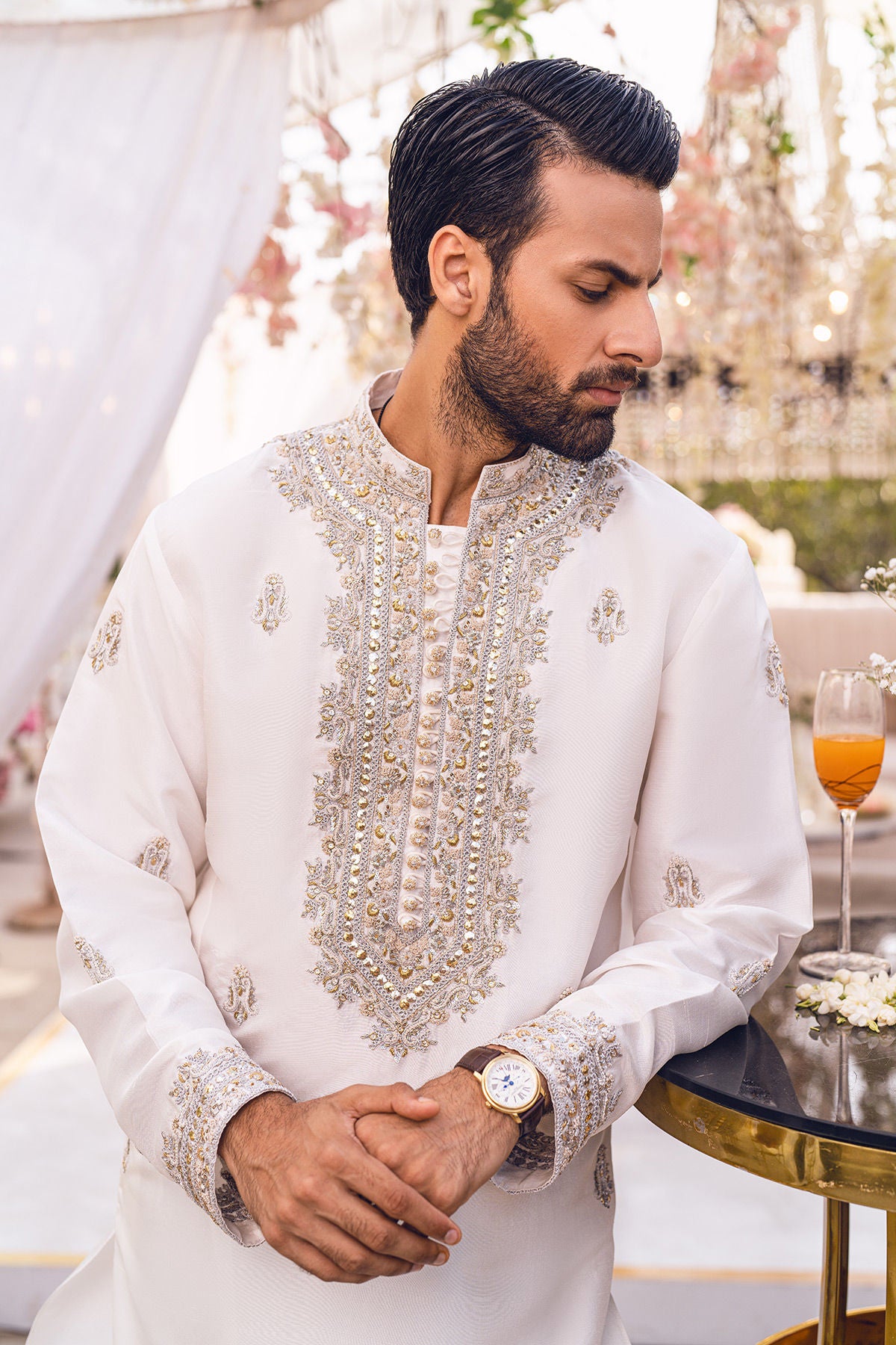 Intricate details of age old marori, zardozi and glistening kaamdani enhanced with subtle resham on pristine white raw silk canvas.