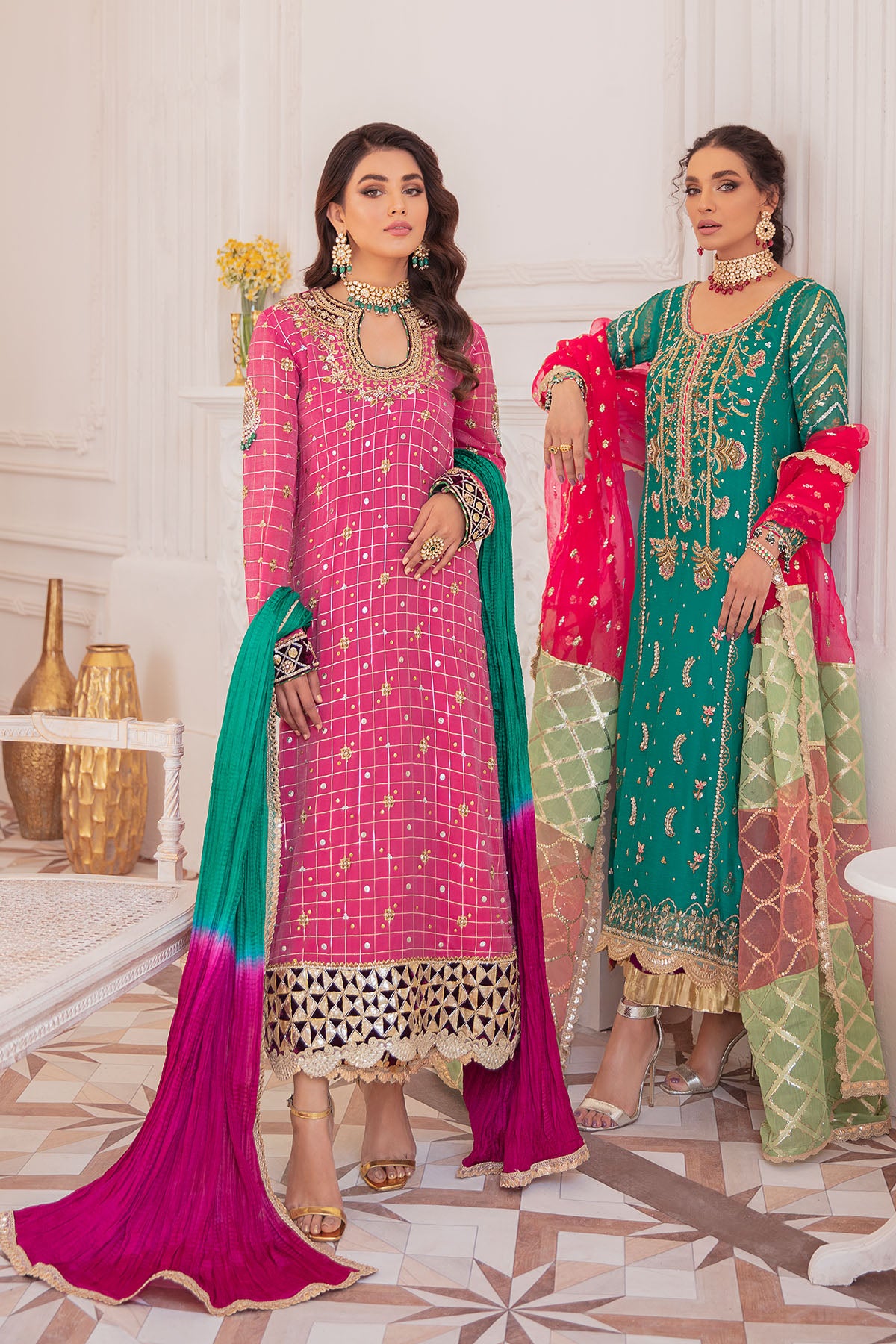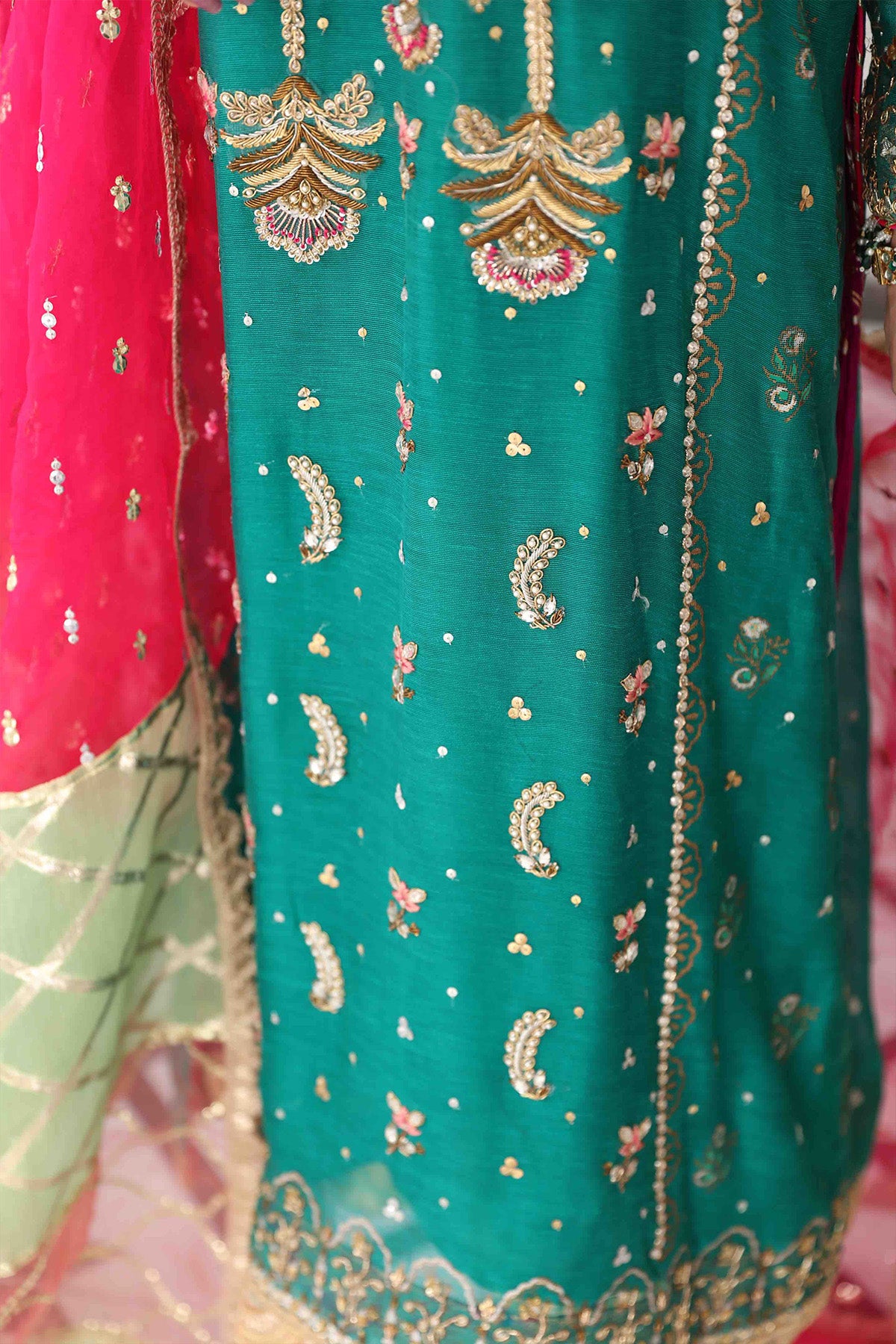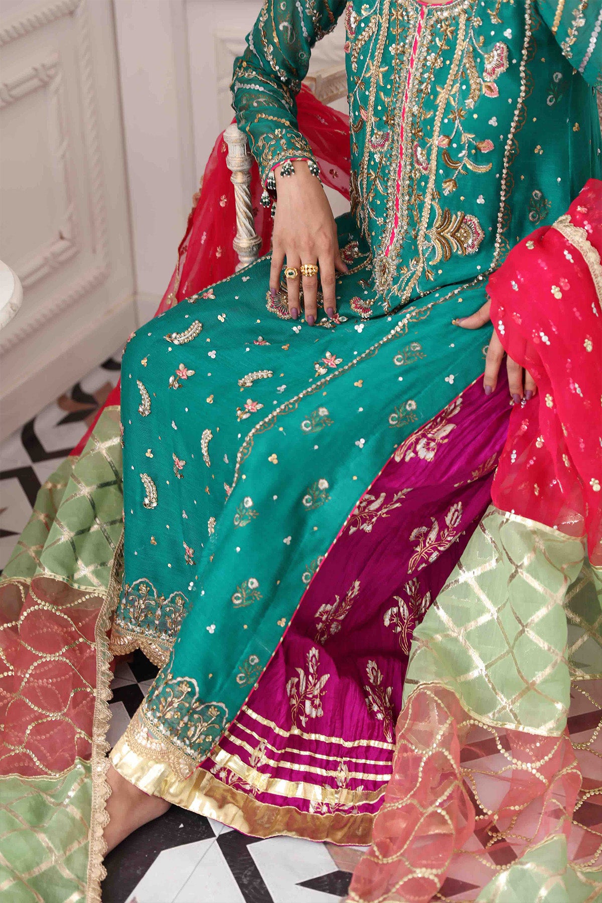 Long length A- Line shirt in gorgeous shade of green is adorned with hand block printed details and further adorned with zardozi and single thread neckline. The shirt can be paired with Magenta crushed izaar featuring old school gota details. The colour blocked dupatta in shades of fuchsia, mint and coral with sequins and gota details complete the look.