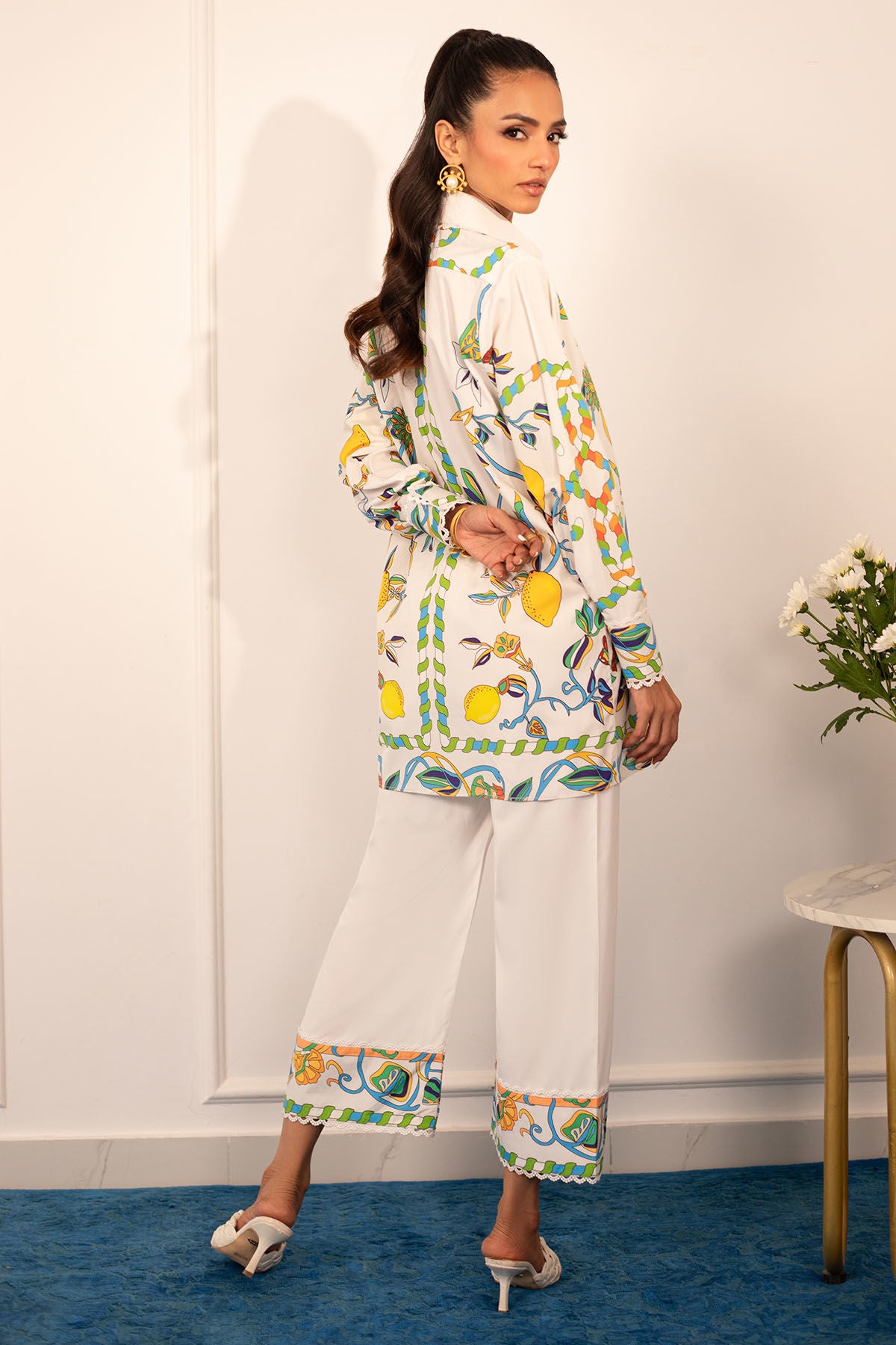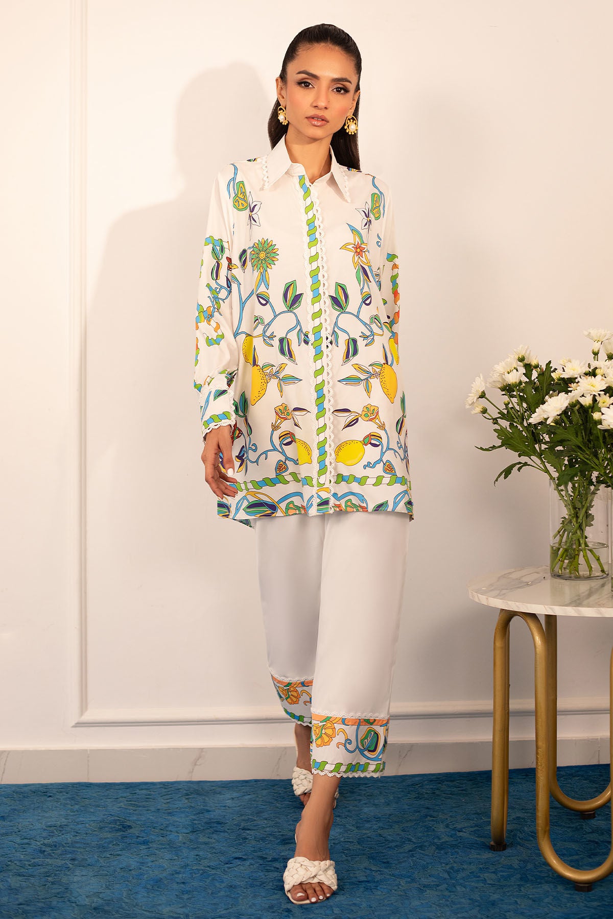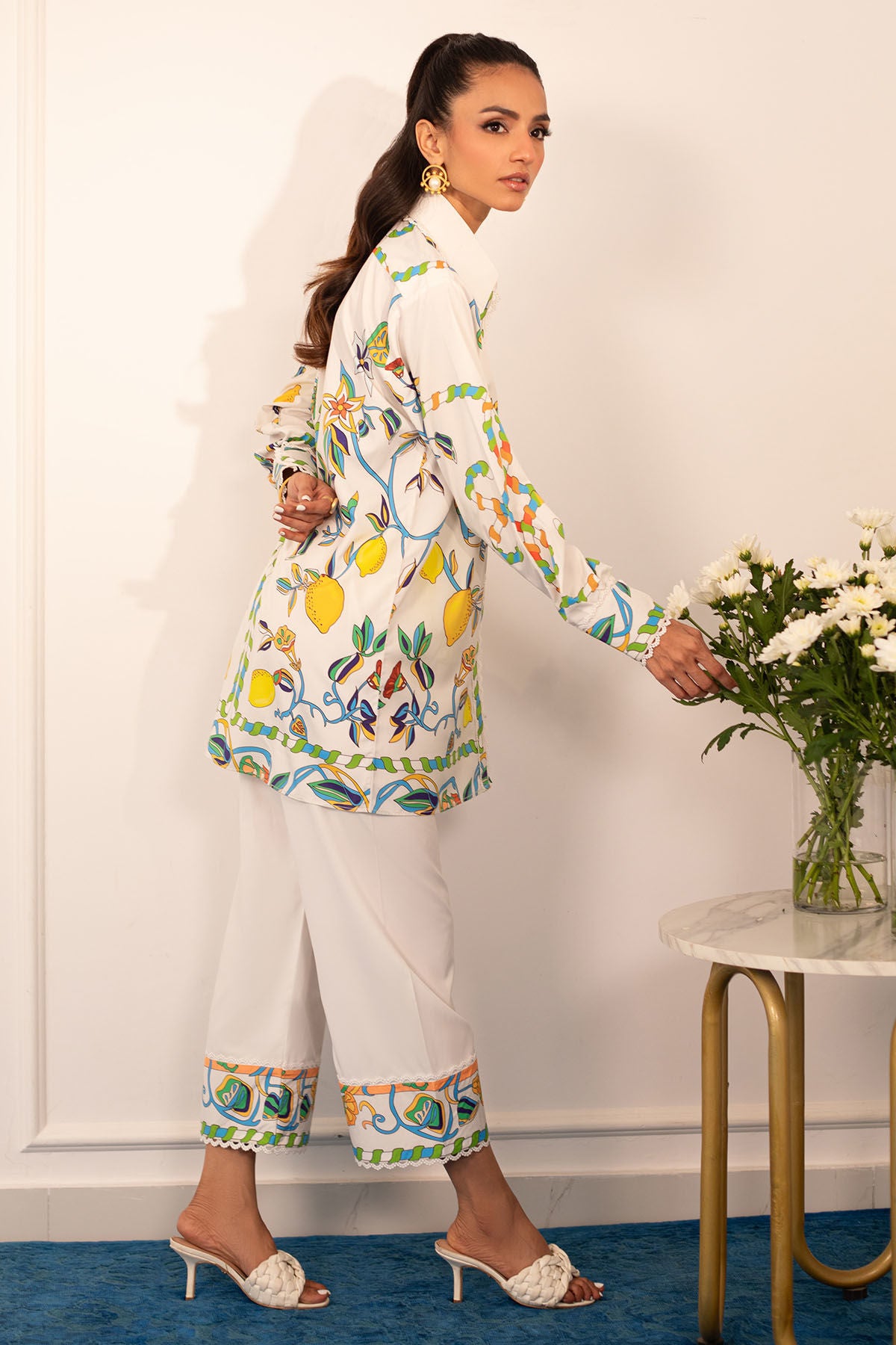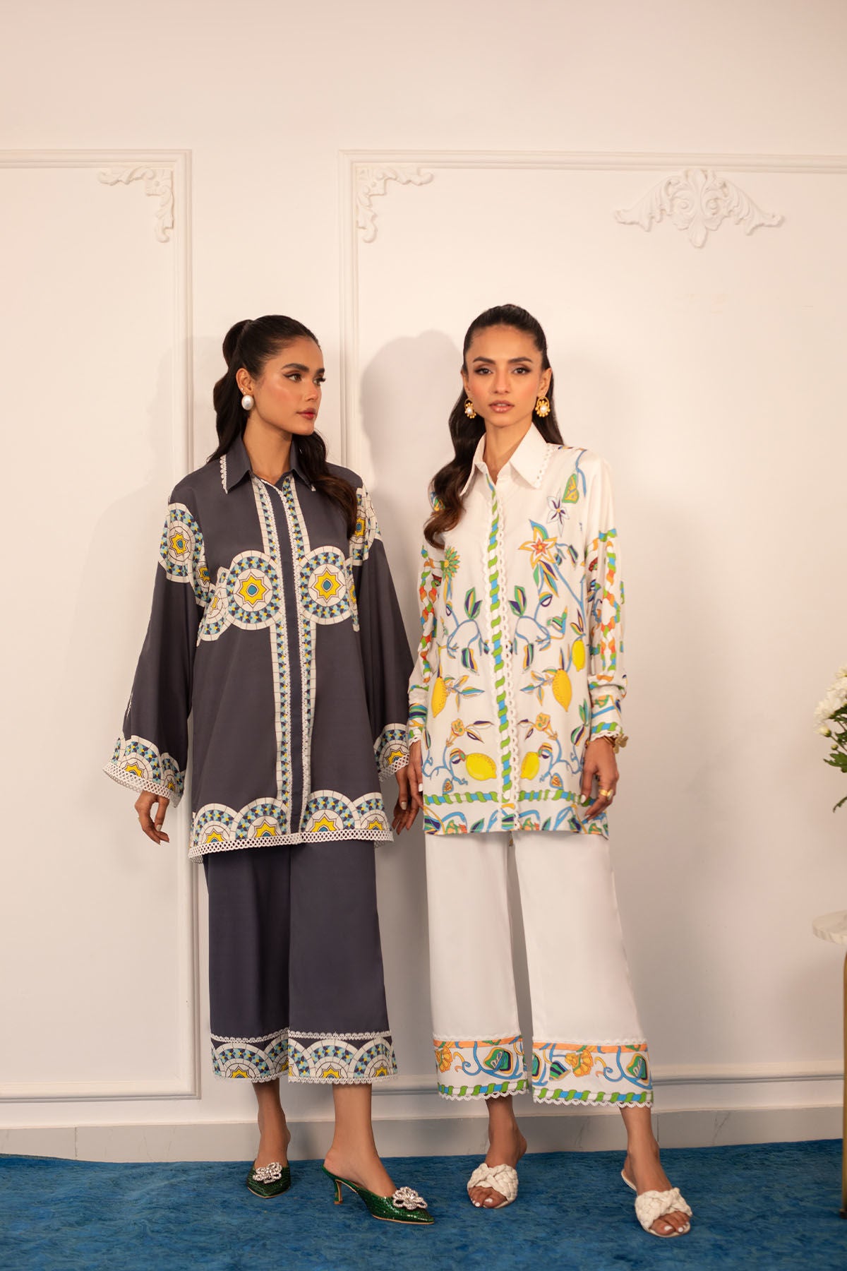 Quirky, trendy yet elegant co-ord set on crepe silk featuring balanced and carefully crafted prints, enhanced with lace details, is a must-have in your closet this summer.