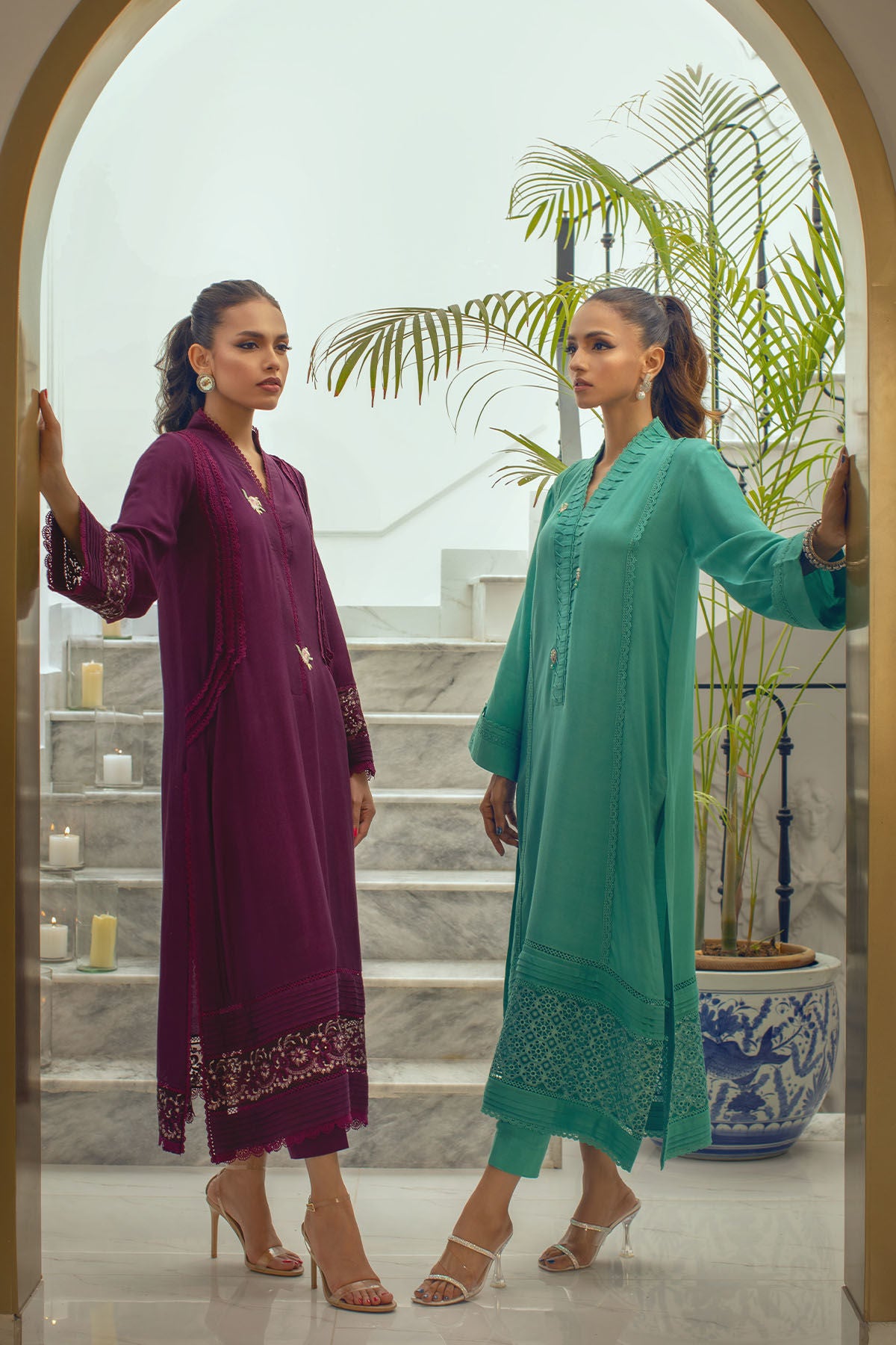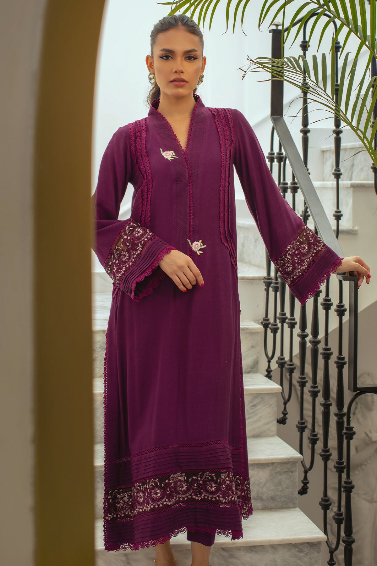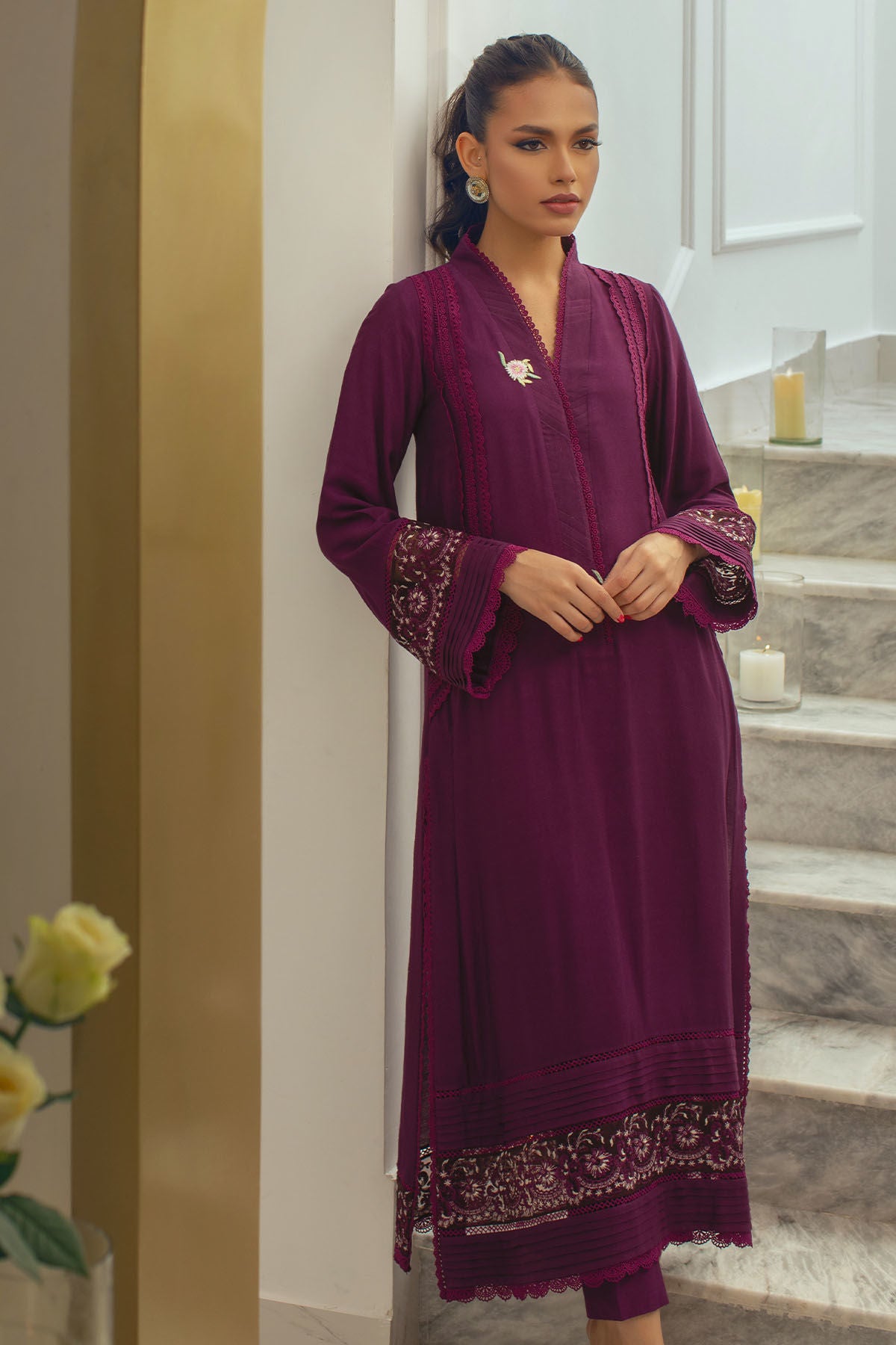 Long silhouette cotton net shirt in gorgeous shade of plum featuring crochet laces on centre front. The hemline is enhanced with pleats and zari embroidered organza panel. The pleated neckline is set to perfection with silk thread rosettes in contrasting shades. The outfit can be paired with matching cotton net pants.