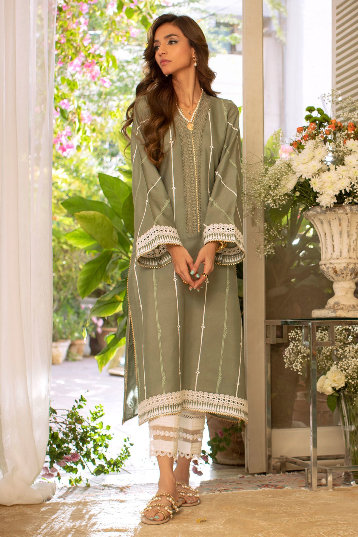 Long silhouette cotton net shirt featuring hand block printed details in whites and gold which is further enhanced with matching crochet lace and gota details on neckline.