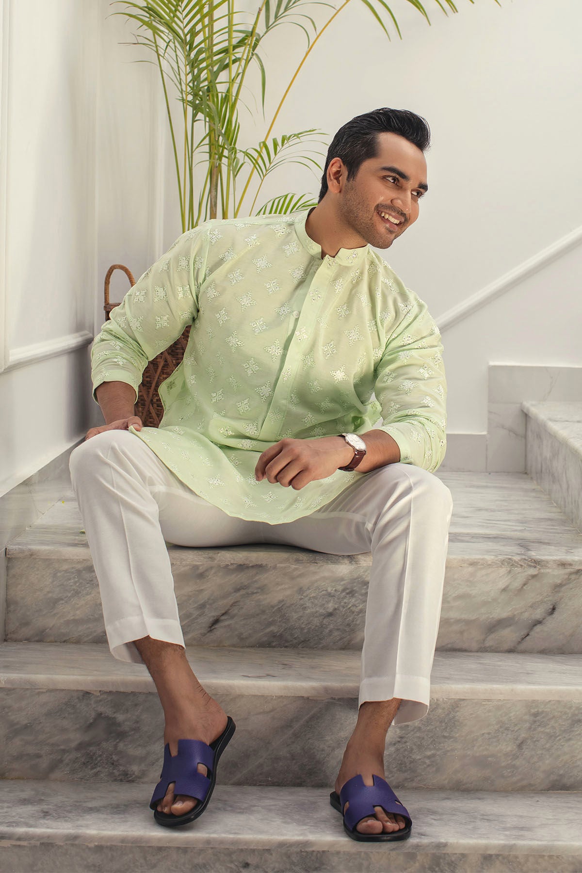 Ox silk kurta on subtle mint green shade featuring silk thread resham motifs with silver shimmering details. The neckline is adorned with placket details and the kurta can be paired with straight white cotton pants.